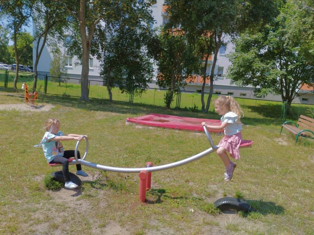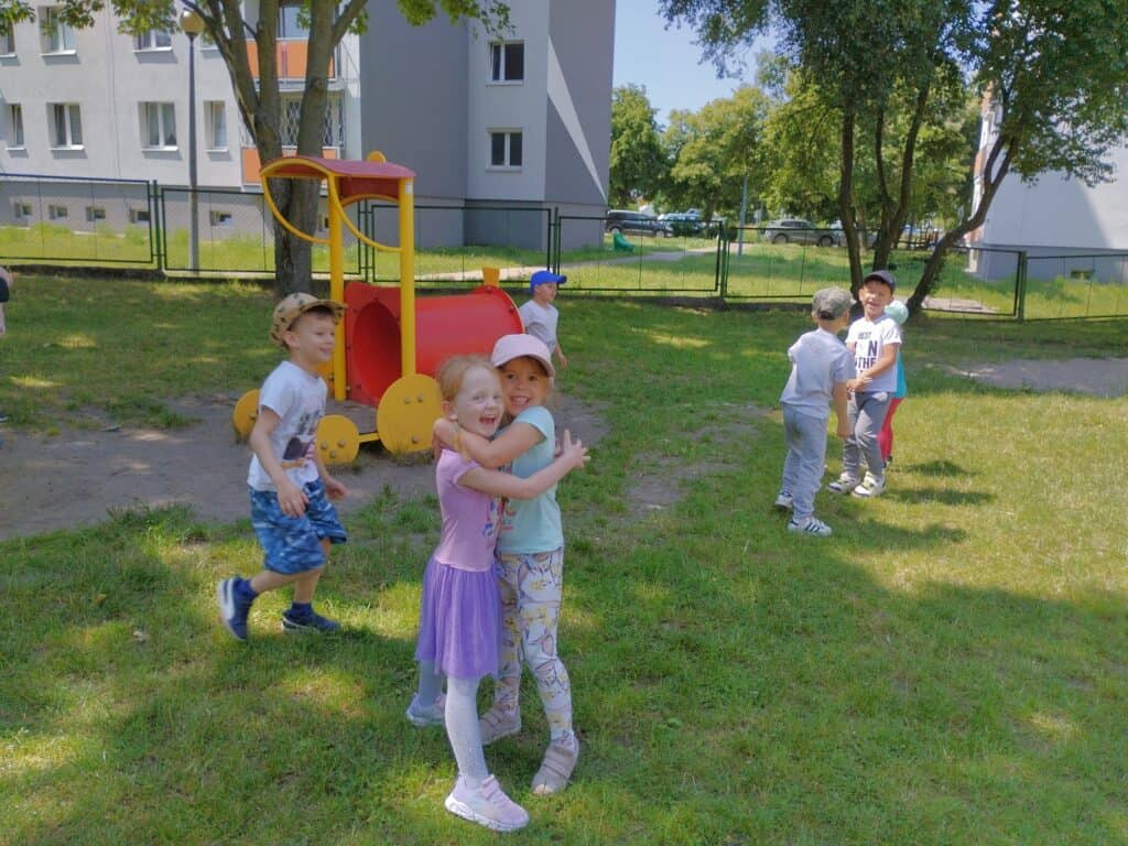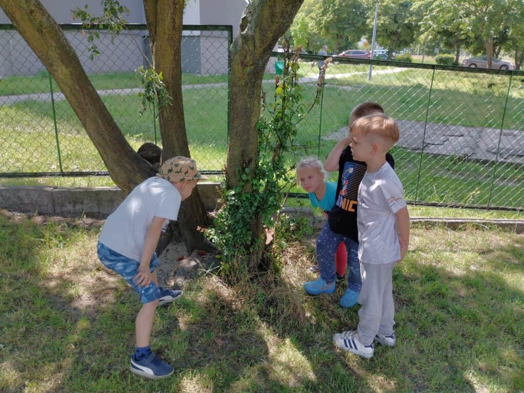 A na placu zabaw dzieci z radością spędzały czas na świeżym powietrzu. Bawiły się w najlepsze – biegały, huśtały oraz z zainteresowaniem obserwowały małe robaczki, oraz przyglądały się roślinkom rosnącym wokół.