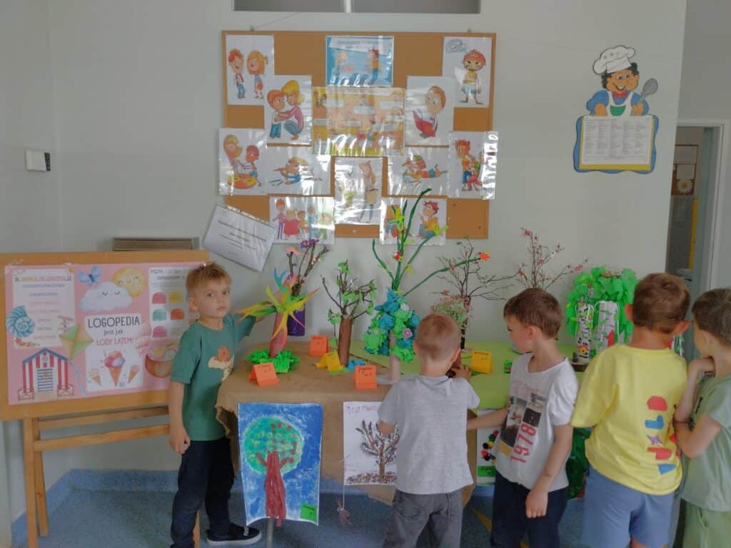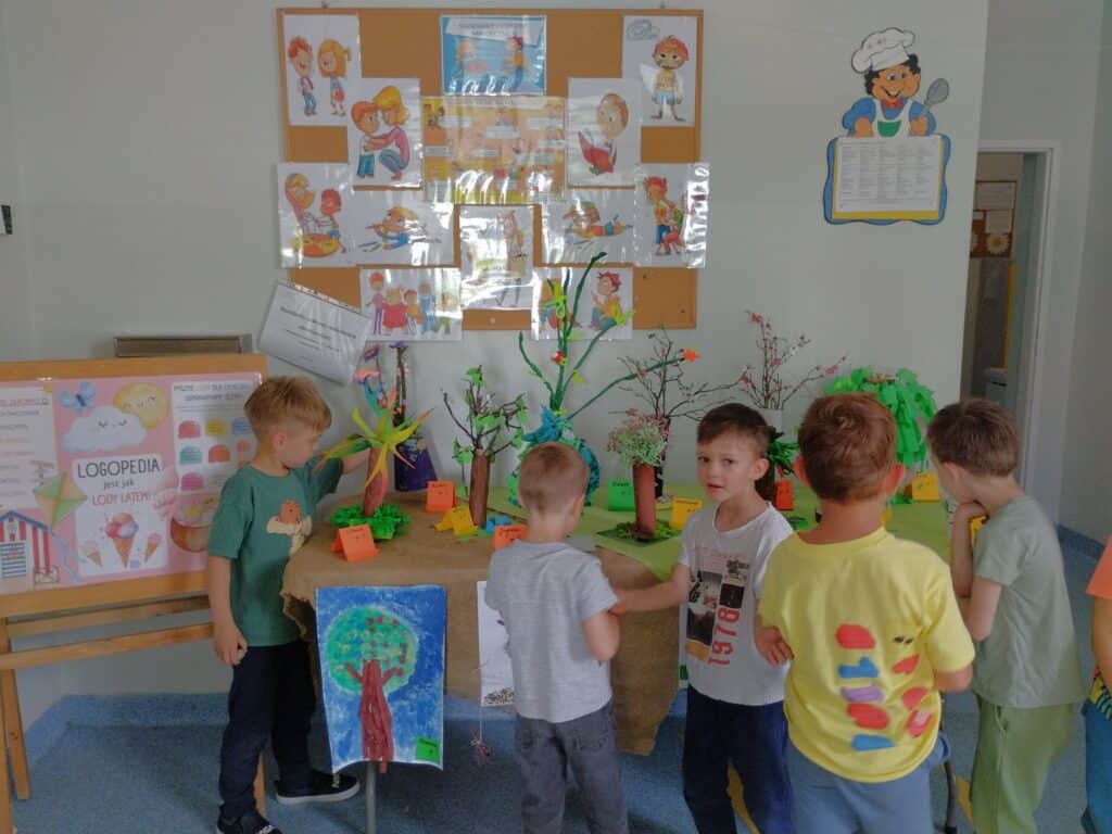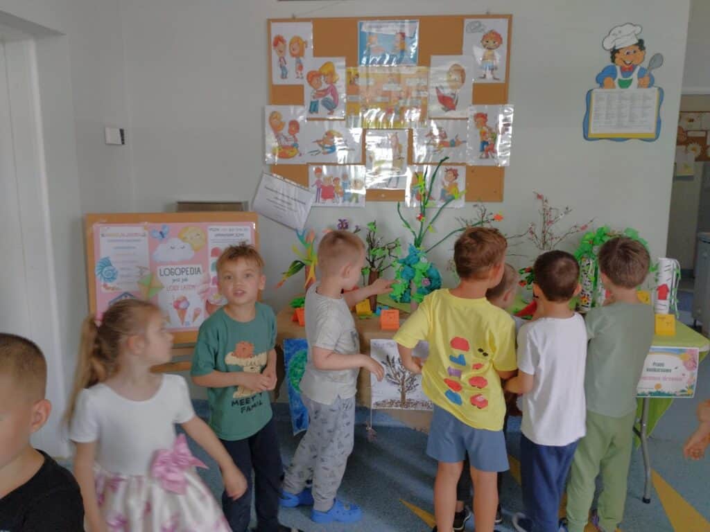 W naszym holu można było podziwiać wystawę prac konkursowych „Wiosenne Drzewa”. Wśród uczestników znaleźli się również Staś i Kaziu, którzy z dumą prezentowali swoje prace wykonane wspólnie z rodzicami. Chłopcy byli bardzo zadowoleni z efektów i chętnie dzielili się swoją radością z kolegami i koleżankami z grupy.