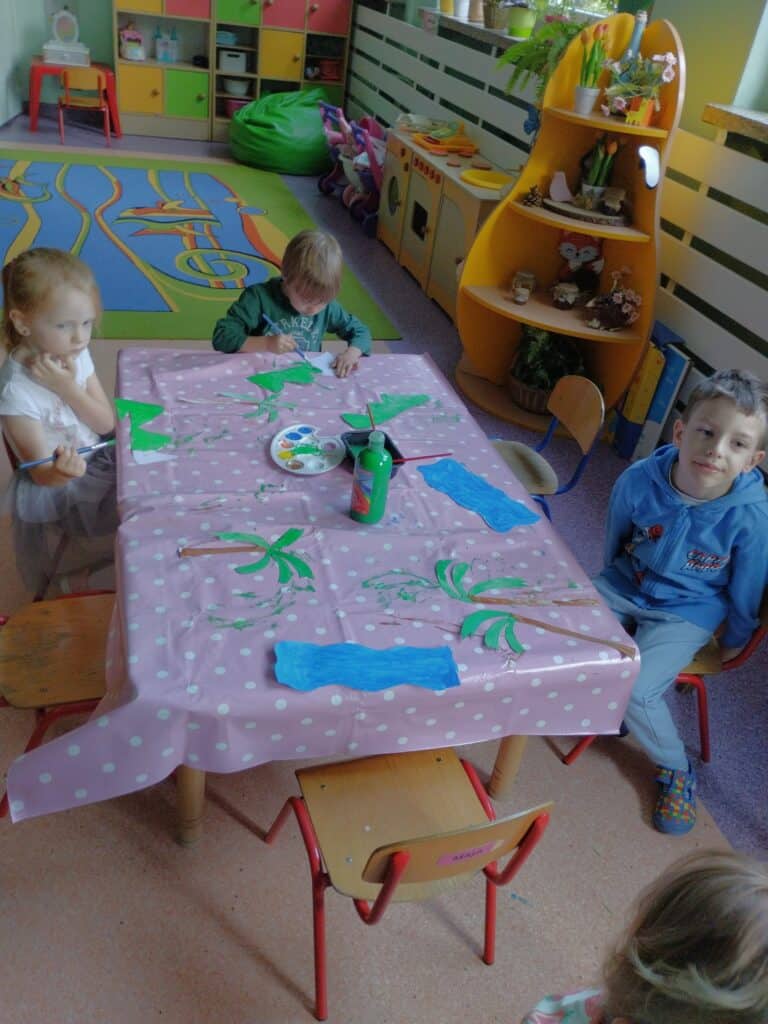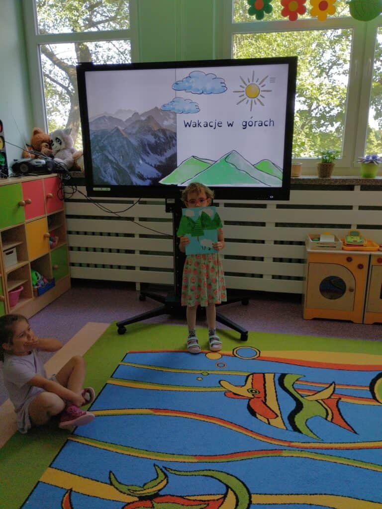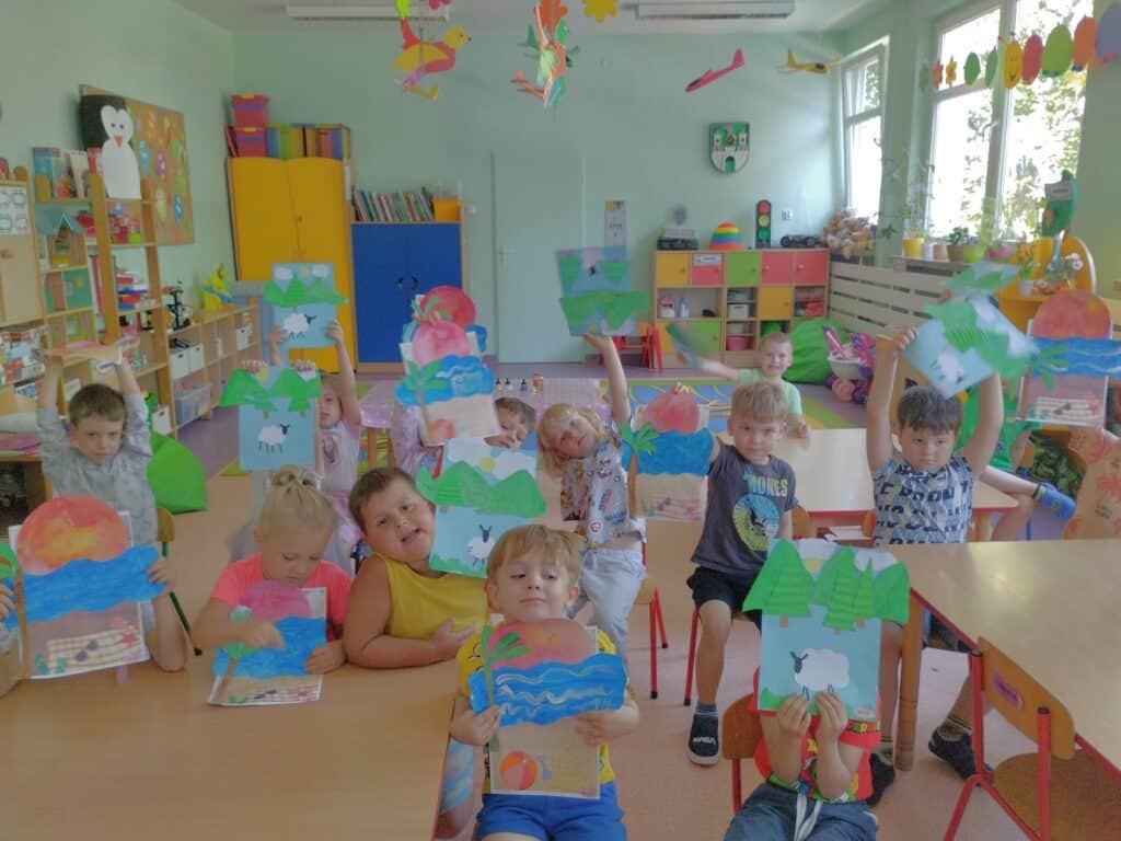 A skoro o wakacjach mowa – dzieci stanęły przed nie lada dylematem: morze czy góry? Ten temat stał się inspiracją do pracy plastycznej. Część Motylków wybrała góry, inni – plażę i fale, a niektóre dzieci najchętniej byłyby w obu miejscach naraz.