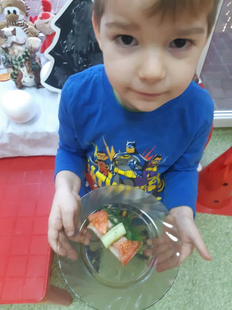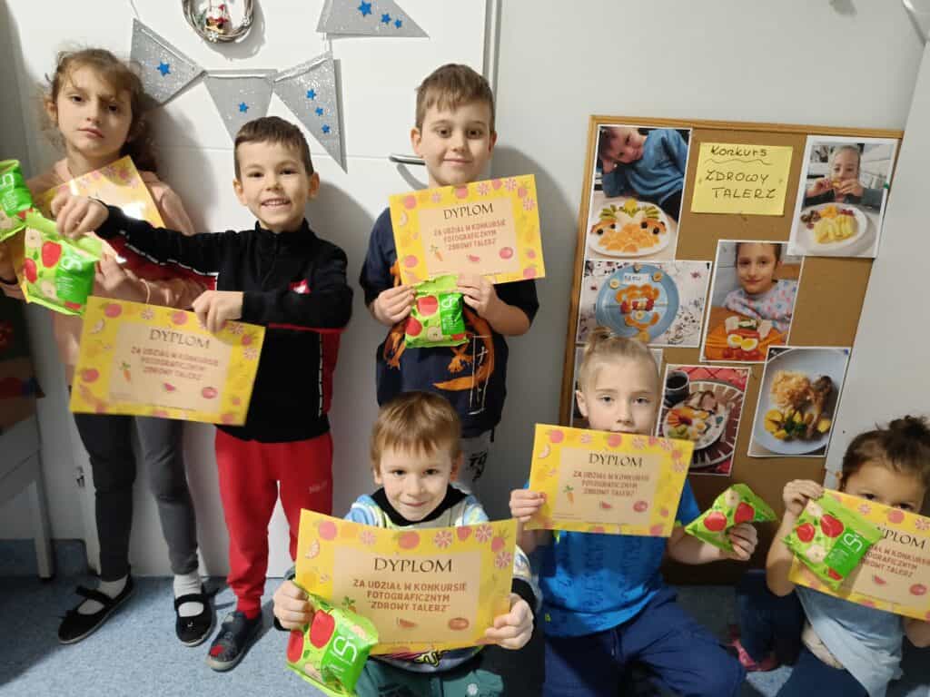 Dzieci z grupy „Żabki” chętnie wzięły udział w konkursie „Zdrowy talerz” i wraz z rodzicami przygotowały zdrowe i kolorowe talerze pełne witamin. Tuż przed Bożym Narodzeniem nastąpiło uroczyste wręczenie dyplomów i niespodzianek dla młodych promotorów zdrowego odżywiania. Ogromnie nam miło, że „Żabkową” akcją zainteresowały się też dzieci z najmłodszej grupy i wspólnie z Panią Jolą, podczas śniadania, próbowały stworzyć własne zdrowe talerze. Dziękujemy za Wasze zaangażowanie i chęć wyrabiania właściwych nawyków żywieniowych. Mamy nadzieję, że coraz więcej dzieci będzie zwracało uwagę na to, co znajduje się na ich talerzach!