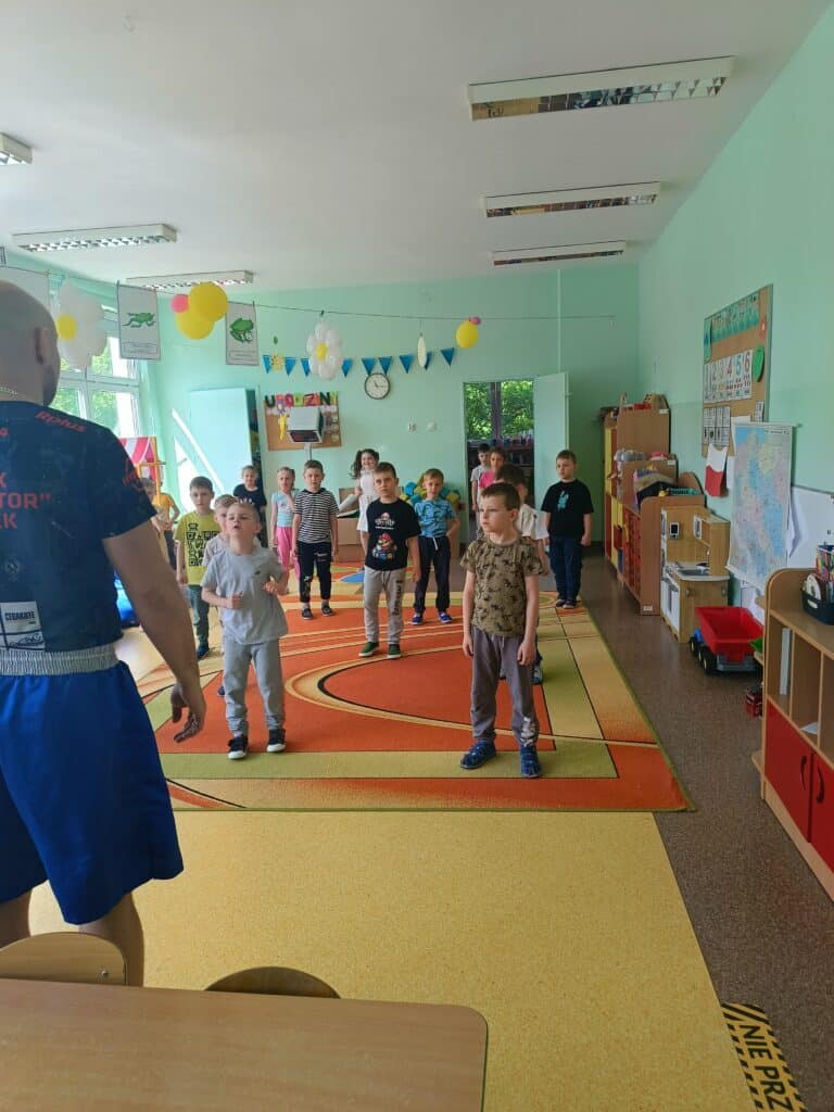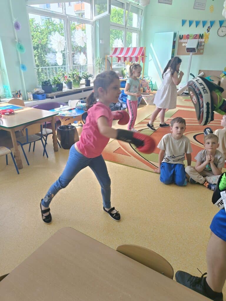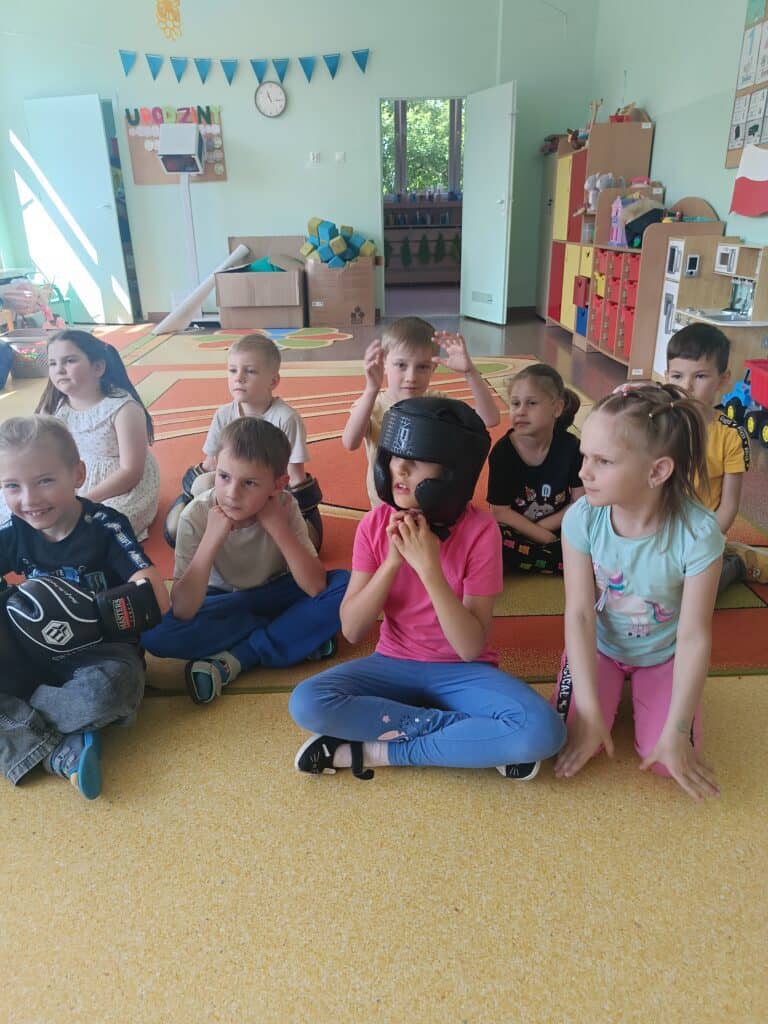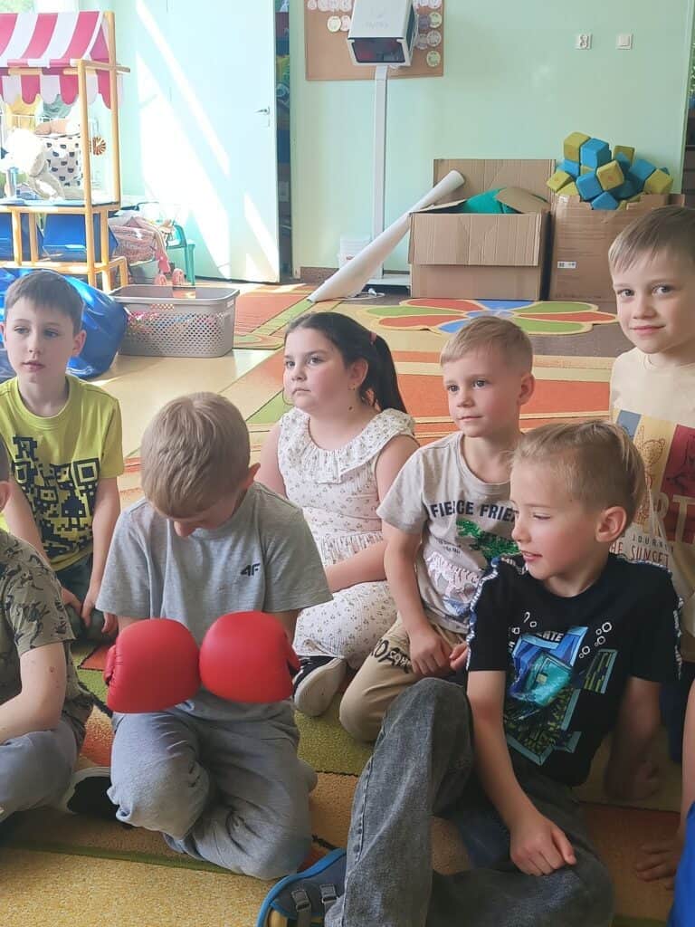 Wydarzeniem, którego Żabki z pewnością długo nie zapomną, była wizyta boksera. Tata naszej Julki pojawił się w przedszkolnej sali w profesjonalnym stroju sportowym i opowiedział o treningu, zaprezentował ochraniacze i rękawice bokserskie, a także wytłumaczył dzieciom, że boks to dyscyplina sportu i nie można używać przemocy i siły fizycznej wobec innych ludzi. Nasz gość przeprowadził krótki trening ruchowy i pozwolił Żabkom poćwiczyć uderzenia w czerwonych rękawicach.