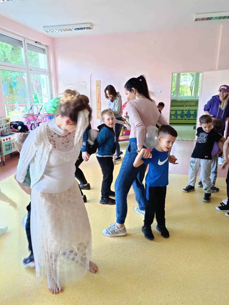 W maju nie zapomnieliśmy też o naszych mamach, dlatego specjalnie dla nich przygotowaliśmy świetną niespodziankę. Pogoda pokrzyżowała nam plany piknikowe, ale nie zepsuła dobrych humorów. Schroniliśmy się w przedszkolnej sali i wspólnie tańczyliśmy, graliśmy w kalambury i spędzaliśmy czas na wspaniałej zabawie.