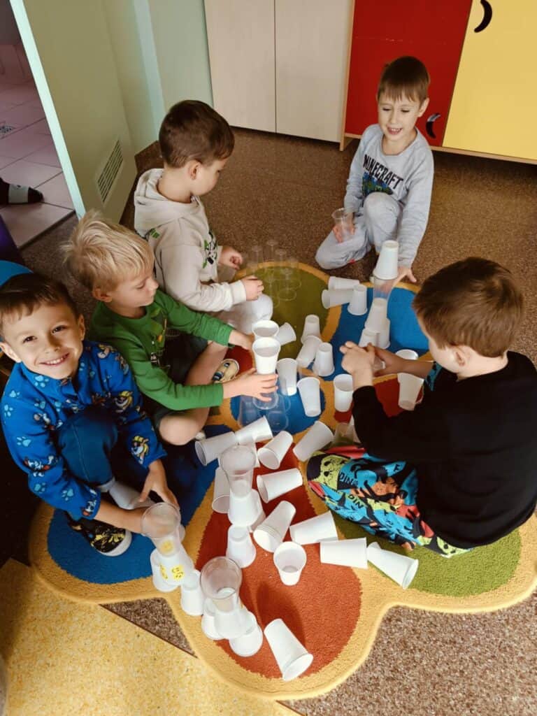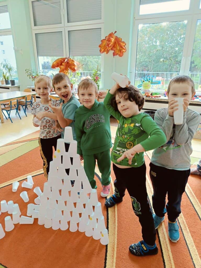 Wakacje już dawno za pasem, więc czas brać się do pracy i nauki. Żabki wychodziły, uczyły się przez zabawę i poznawały nowe rzeczy, że nie było czasu na nudę. Zaczynając od zabawy z figurami geometrycznymi i kubeczkami, Żabki utrwaliły sobie jak wygląda kwadrat, za co może służyć koło i gdzie umieścić trójkąt, by wyglądał jak dach domku. Do tego ułożyły ogromne wieże z kubeczków, prześcigając się która będzie wyższa niż oni sami.