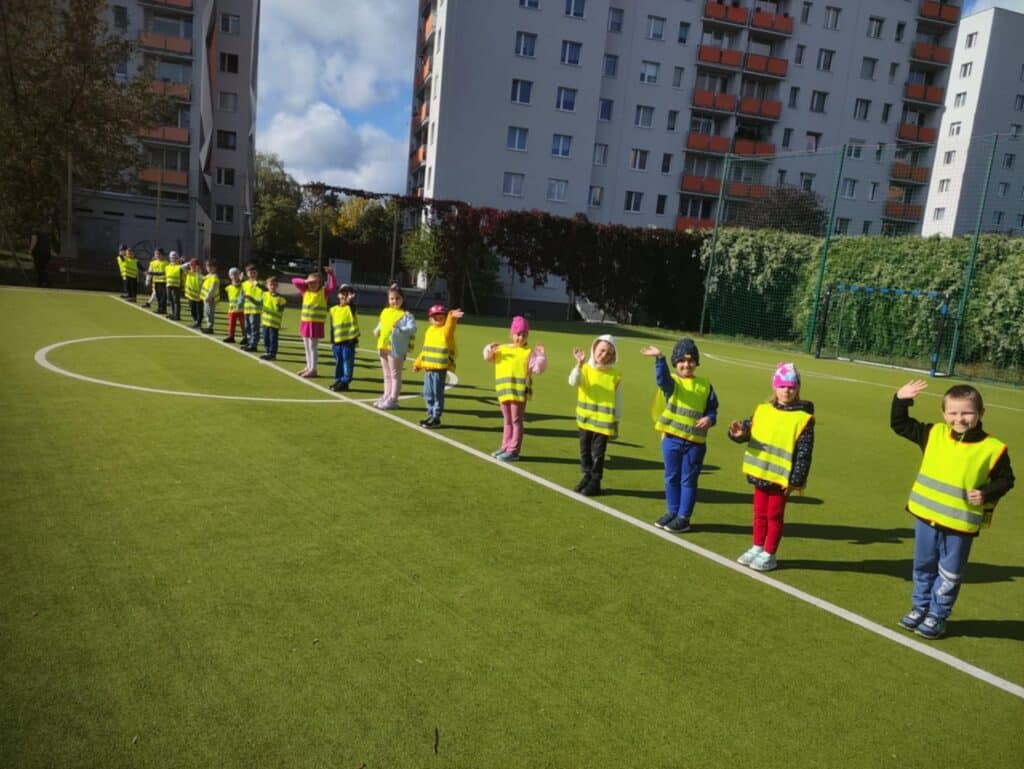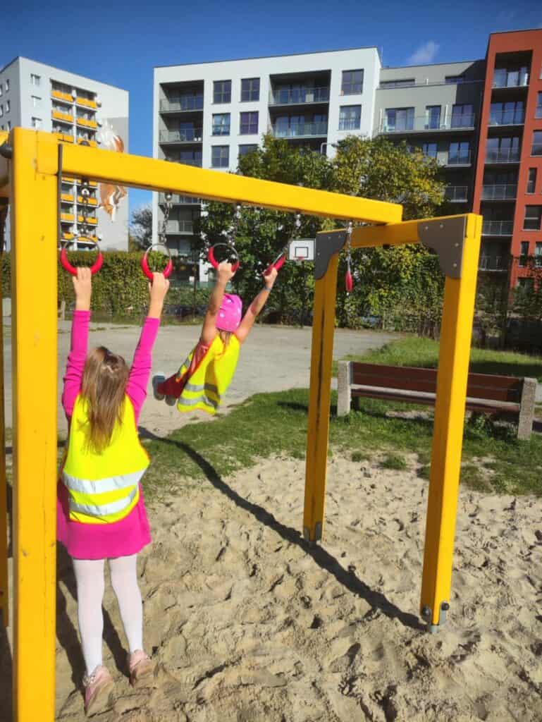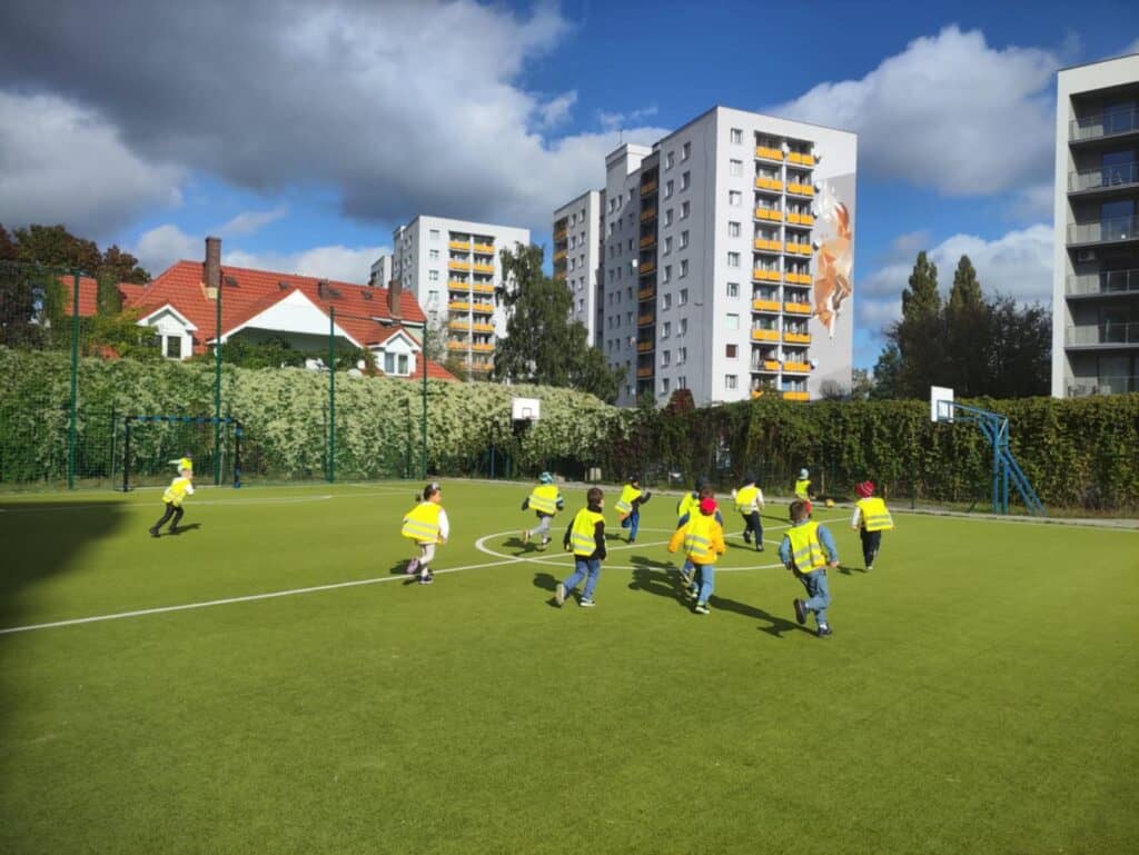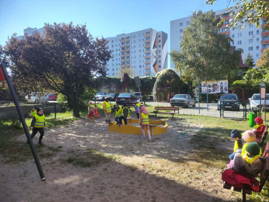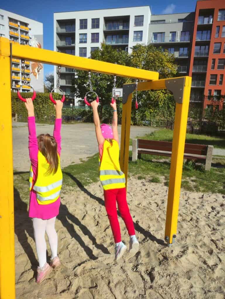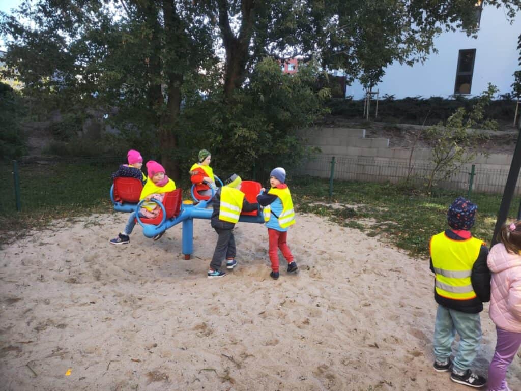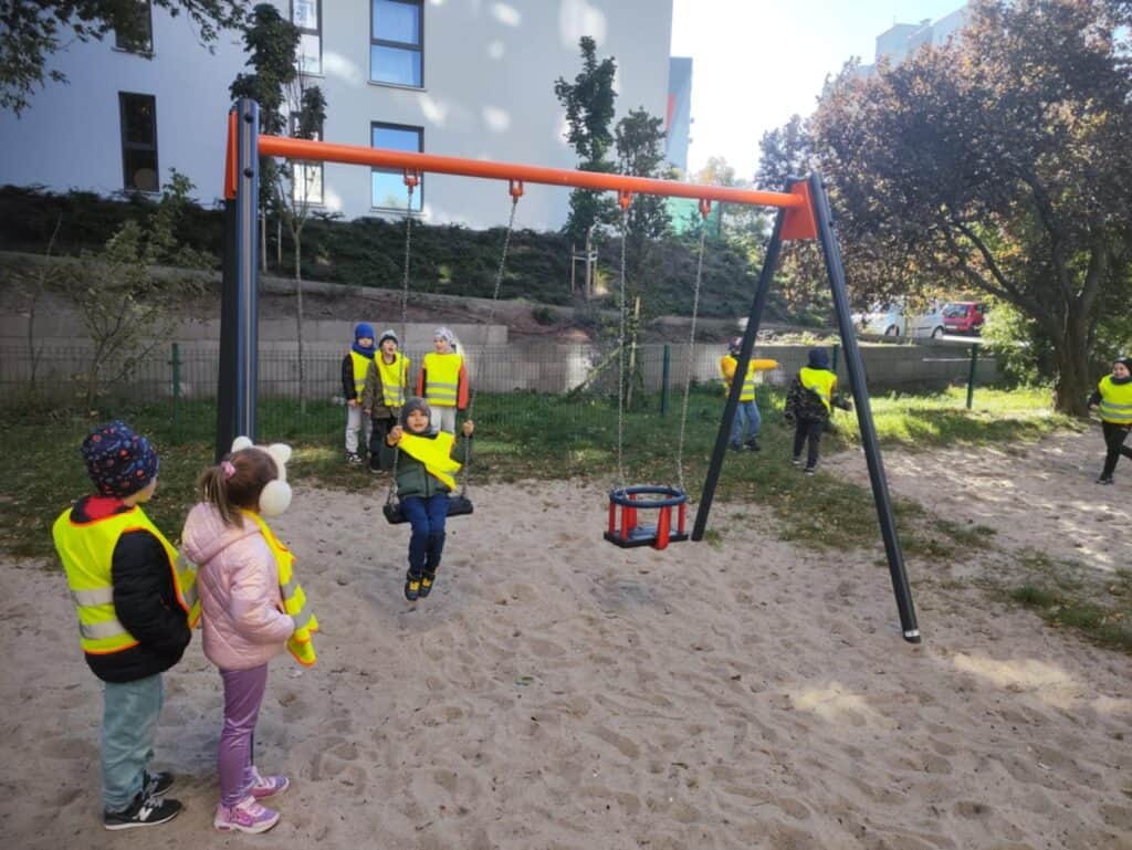 Wokół budynku trwał remont, ale to nie przeszkodziło Żabkom w zażywaniu świeżego powietrza i łapaniu ostatnich promieni słońca. Wychodziliśmy na boisko czy pobliski plac zabaw. Pewnego dnia, wracając z boiska natknęliśmy się na pięknie odbijające się od szyb światło. Żabki z zaciekawieniem przyglądały się zmieniającym kształtom na budynku.