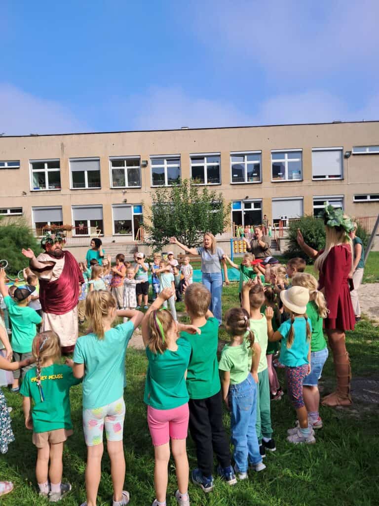 W drugim tygodniu września rozmawiano o Winobraniu oraz mieście Zielona Góra. Podczas zajęć dzieci rozwijały swoje umiejętności matematyczne w zabawie „Winogron”, poznały najważniejsze zabytki naszego miasta oraz legendy opowiadające o jego założeniu. Dzieci wykonały również pracę plastyczną pt. „Moje miasto”. Dodatkową atrakcją w tym tygodniu była wizyta niecodziennego gościa… Pana Bachusa. Z tej okazji Biedronki wykonały piękną pracę plastyczną przedstawiającą winogrona, którą następnie wręczono Królowi Winobrania na wspólnym spotkaniu. Podczas wizyty nasze dzieci zaprosiły Bachusa wraz z Bachantką do zabawy i tańca pt. „Boogie Woogie”.
