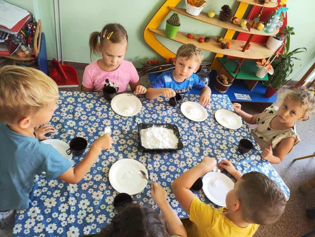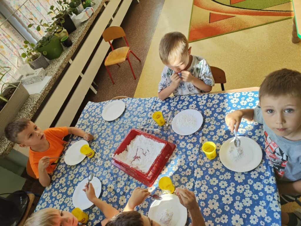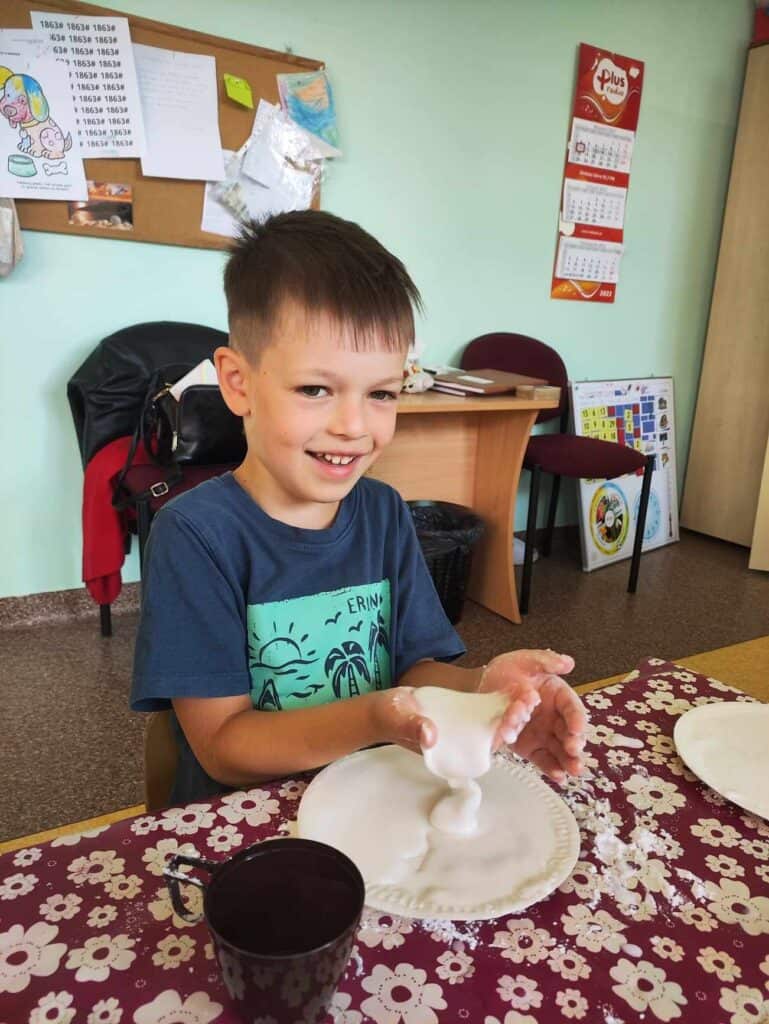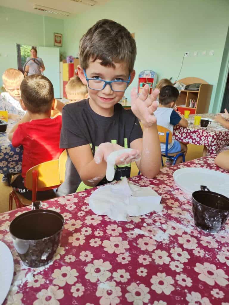 Nie musieliśmy długo czekać na nowe atrakcje. Kilka dni później Pani przygotowała dla nas zajęcia o cieczy nienewtonowskiej. Dowiedzieliśmy się, że po połączeniu mąki ziemniaczanej z odpowiednią ilością wody powstanie coś… Niesamowitego! Coś twardego, ale jednocześnie rozpływającego się w dłoniach. Z tego co powstało mogliśmy stworzyć twardą i zbitą kulkę, ale gdy przestaliśmy ją ugniatać nagle rozpływała się na dłoni jak woda.