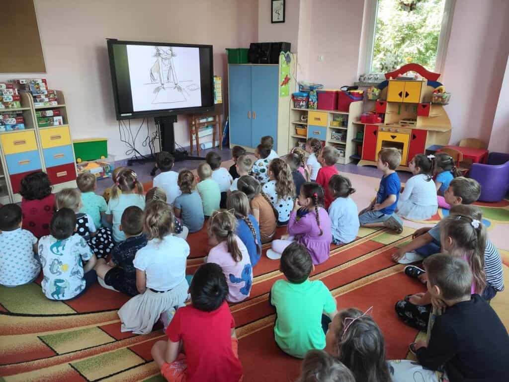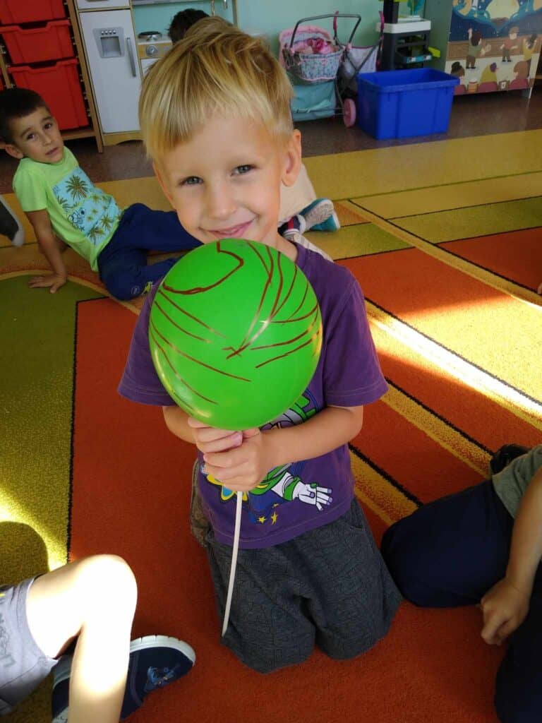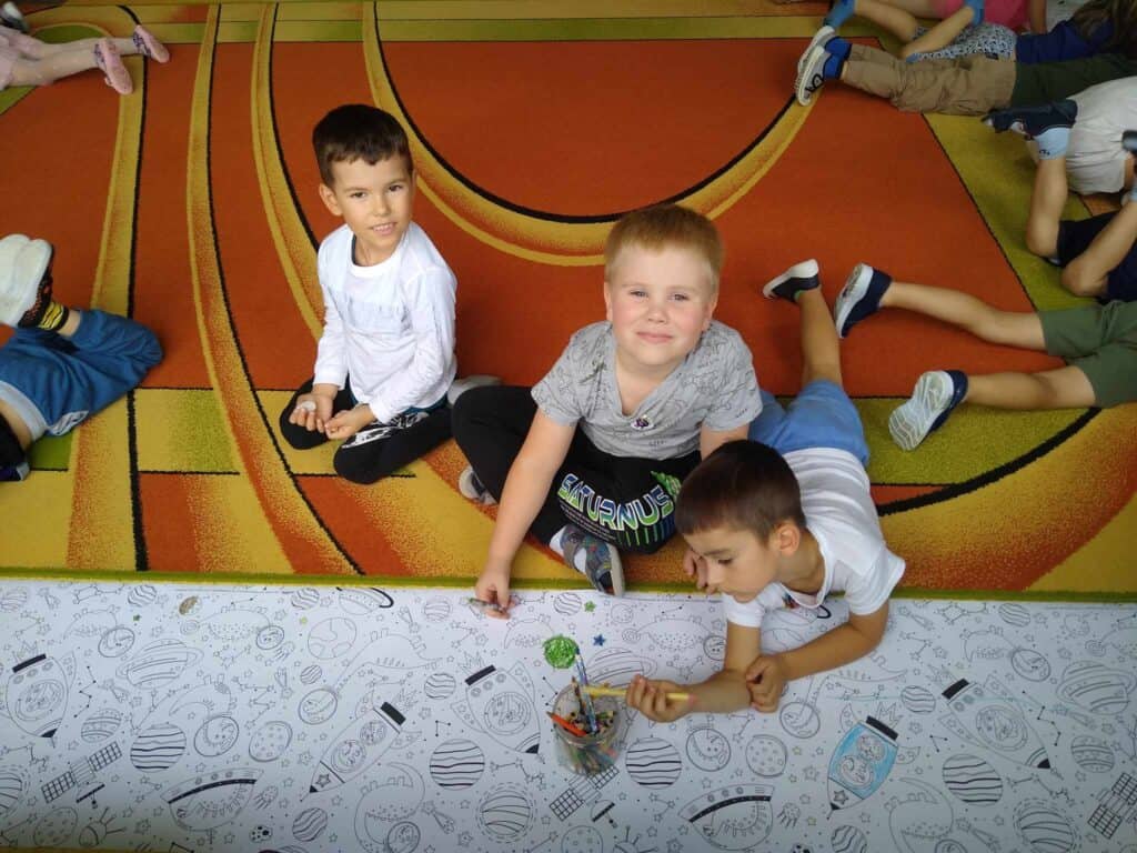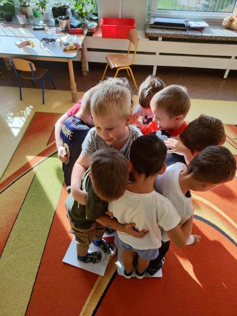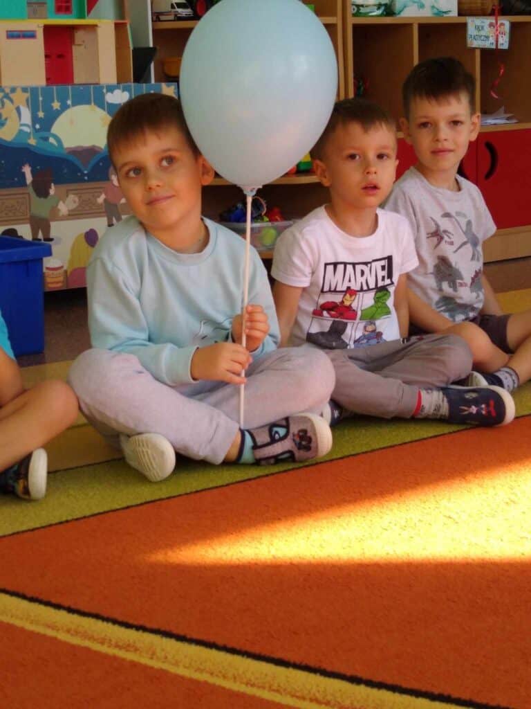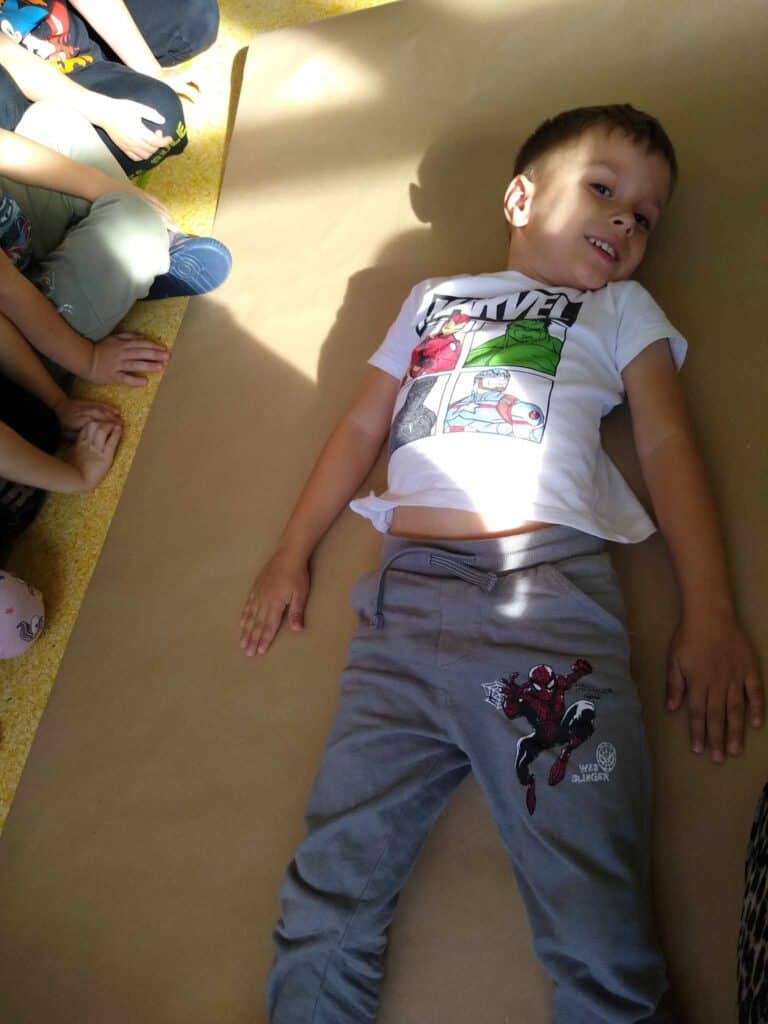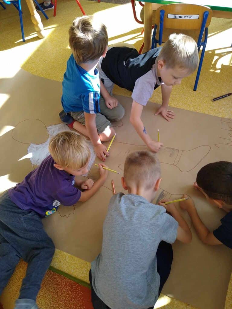 Zaraz po Dniu jabłka hucznie obchodziliśmy bardzo ważny dla nas dzień. Dzień przedszkolaka! Panie przygotowały dla nas dużo atrakcji. Stworzyliśmy portret naszych kolegów – Karoliny i Juliana, którzy posłużyli jako modele odrysowani na kartce. Wszyscy razem ich pokolorowaliśmy, a Pani zawiesiła nasze prace w sali.