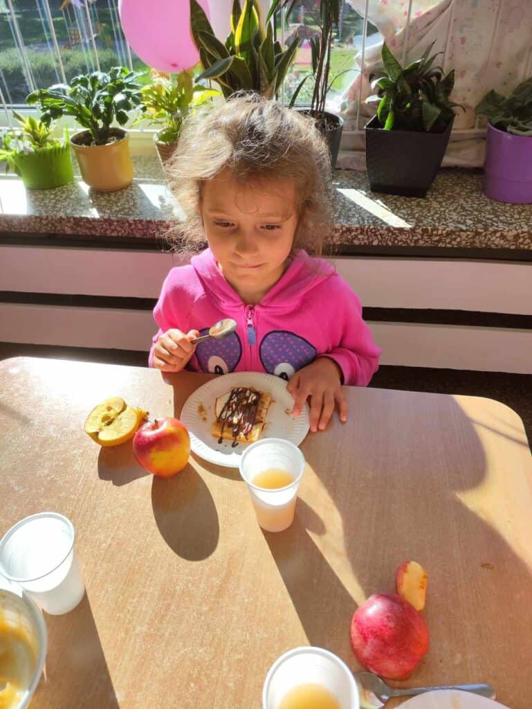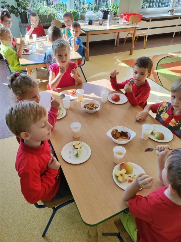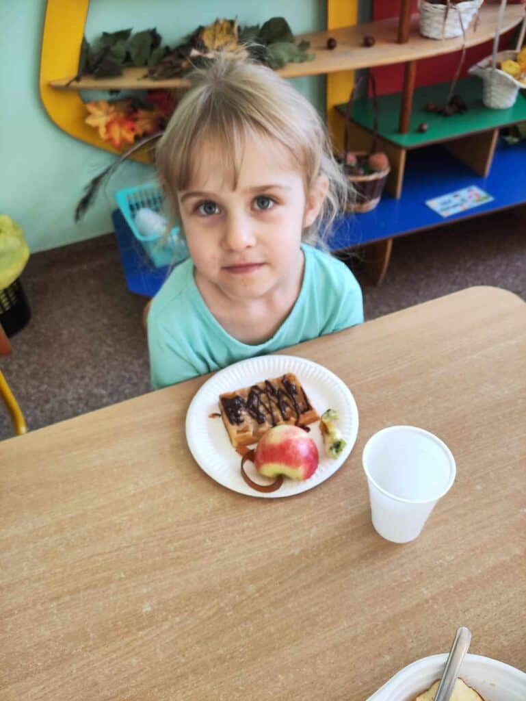 Następnym wydarzeniem w naszej grupie był Dzień Jabłka. Na naszych stolikach znalazły się jabłka w różnej postaci! Pieczone, smażone, gotowane, karmelizowane, liofilizowane, wysuszone, w postaci musu, dżemu, soku czy batoników. Dzięki takiej ilości produktów stworzyliśmy nasze jabłkowe gofry, dodając do nich odrobinę słodyczy w postaci czekolady – choć wcale nie trzeba było, bo jabłka były bardzo słodkie!