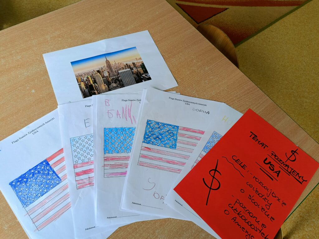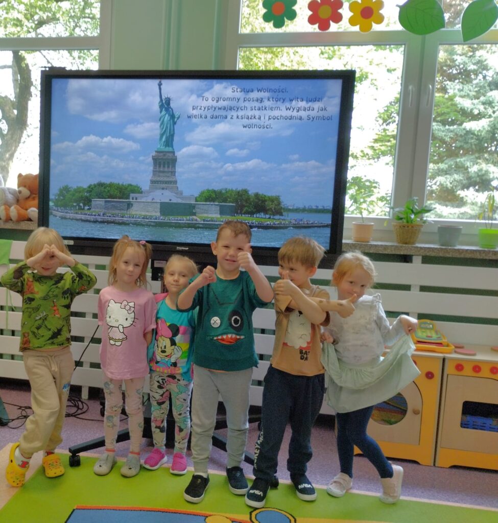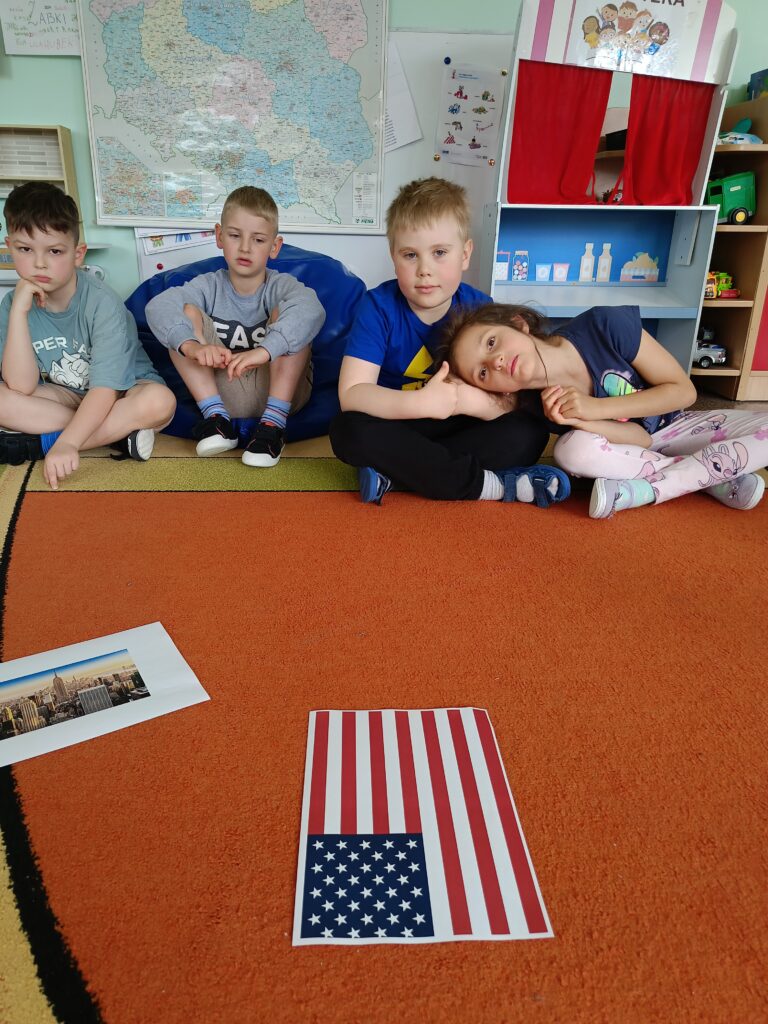 W ramach cyklu „Kuchnie świata” dzieci z naszego przedszkola wyruszyły w kulinarną i kulturową podróż do Stanów Zjednoczonych Ameryki. Podczas zajęć poznały flagę USA i dowiedziały się, co oznaczają gwiazdy i pasy na fladze oraz dlaczego kolory mają swoje znaczenie. Słuchały także hymnu Stanów Zjednoczonych – dzieci wysłuchały utworu „The Star – Spangled Banner” i dowiedziały się, dlaczego hymn jest ważny dla każdego kraju. Ponadto dzieci poznawały położenie USA na mapie świata i uczyły się rozpoznawać kontynenty i kraje, dowiedziały się, gdzie leżą Stany Zjednoczone i jak wygląda ich kształt. Starsze grupy dyskutowały o kulturze i zwyczajach USA, dzieci dowiedziały się o typowych świętach amerykańskich, takich jak Dzień Niepodległości (4 lipca), Halloween czy Święto Dziękczynienia. Nie mogło zabraknąć także amerykańskich przysmaków. Panie kucharki przyrządziły pyszny obiad!