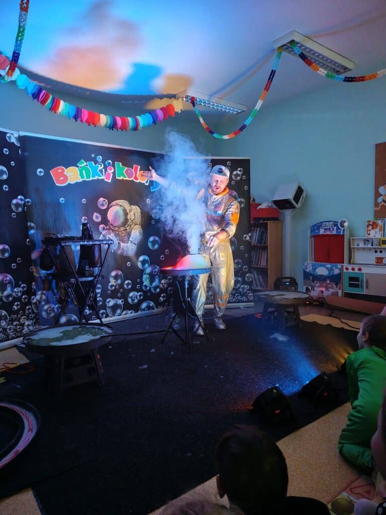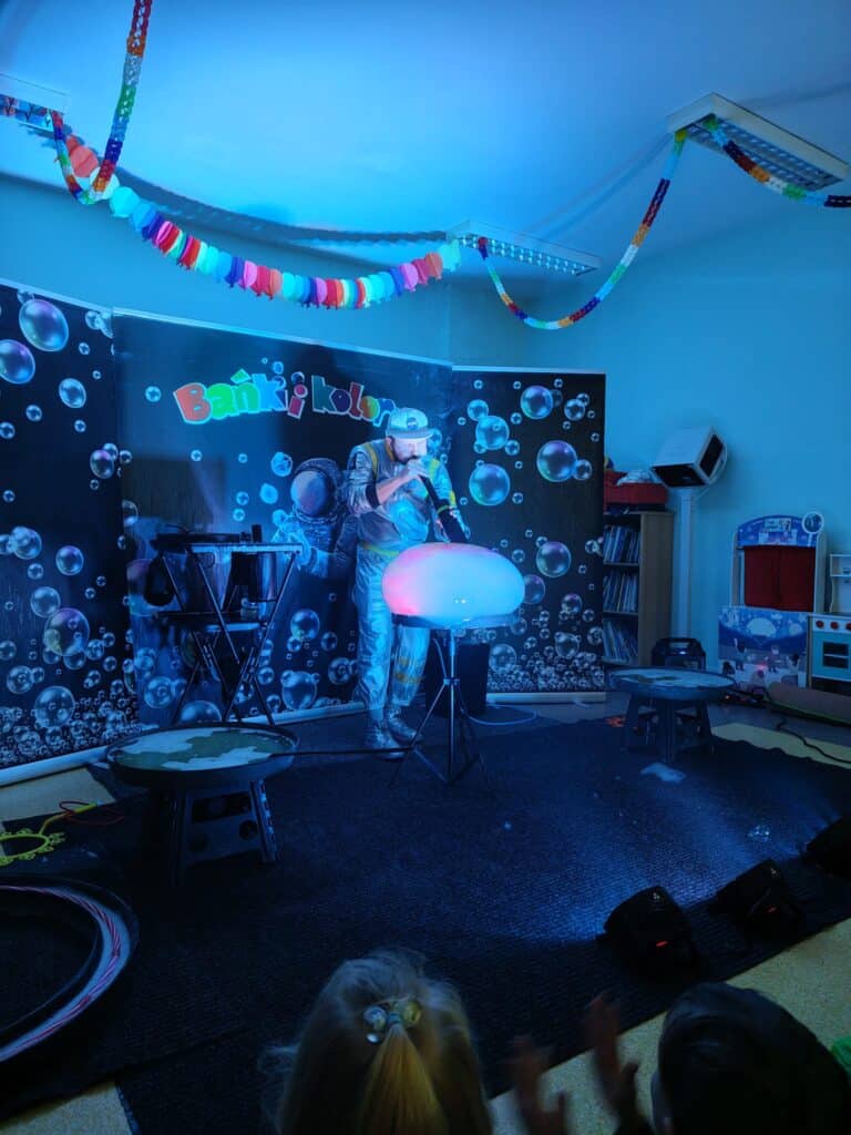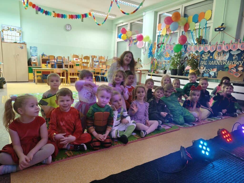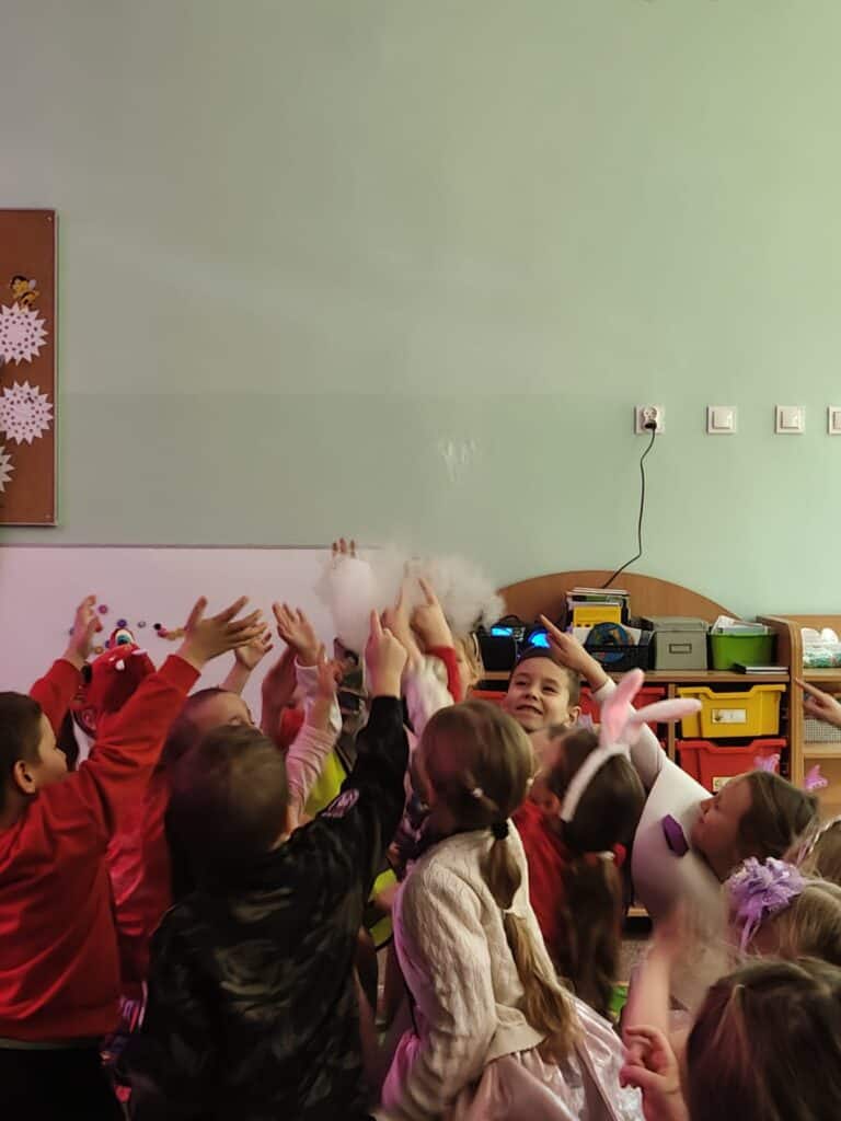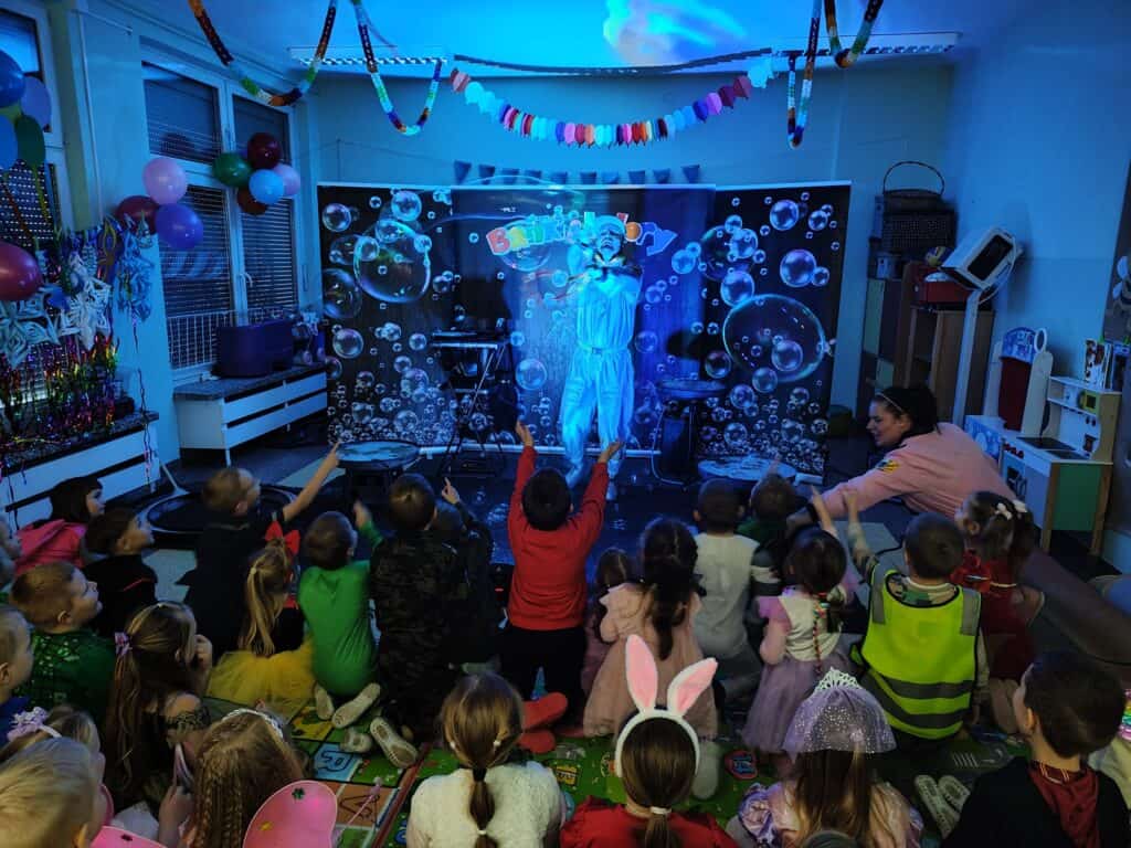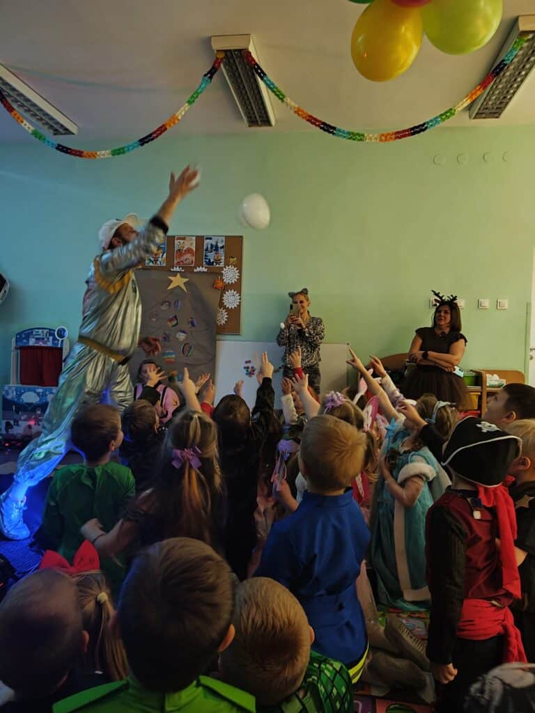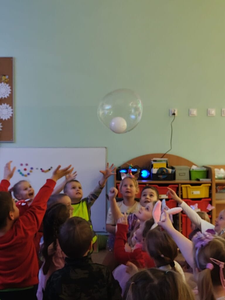 Wyjątkowym wydarzeniem miesiąca był długo wyczekiwany bal karnawałowy. Tego dnia nasza sala zamieniła się w barwną przestrzeń pełną muzyki, tańca i niezwykłych atrakcji. Największą niespodzianką była wizyta dwójki astronautów, którzy zaprosili dzieci do świata baniek mydlanych. Podczas „bańkowego szaleństwa” powstawały ogromne bańki, bańki o zapachu brzoskwini, a nawet widowiskowe bańki z ogniem. Dzieci mogły stanąć w środku wielkiej bańki, co wywołało ogromny zachwyt i wiele spontanicznych okrzyków radości. Nie zabrakło także tańców z balonami, zabawy światłem z wykorzystaniem świecących sznureczków oraz wspólnej zabawy przy muzyce. Całość dopełnił poczęstunek, który pozwolił dzieciom nabrać sił do dalszego świętowania.