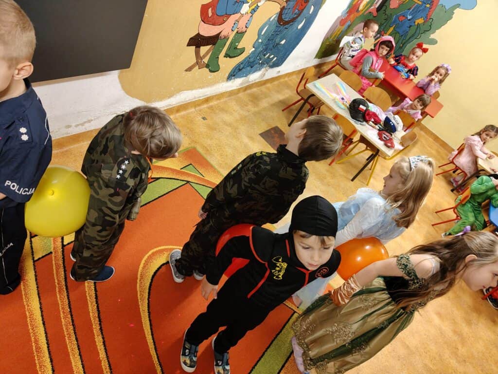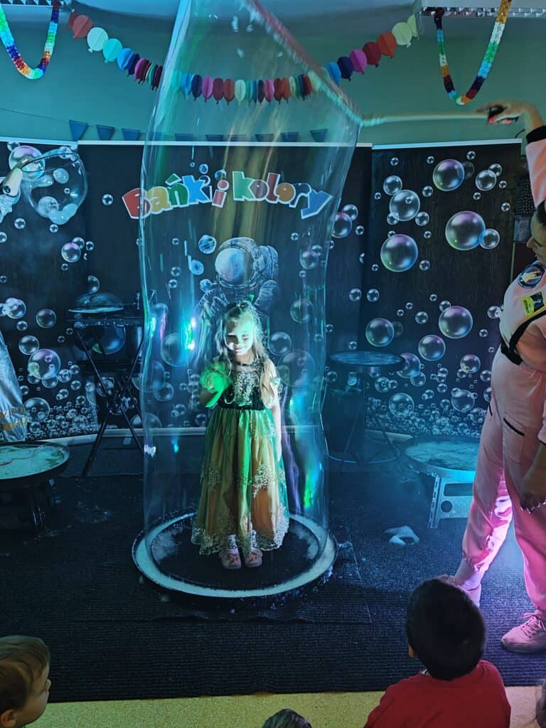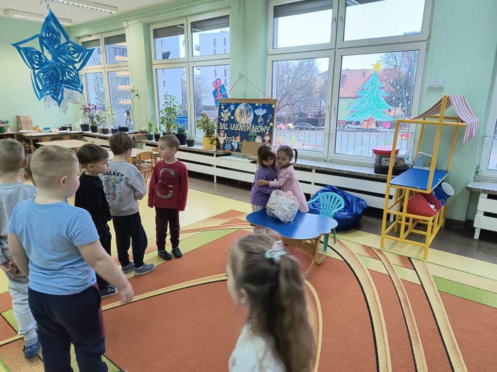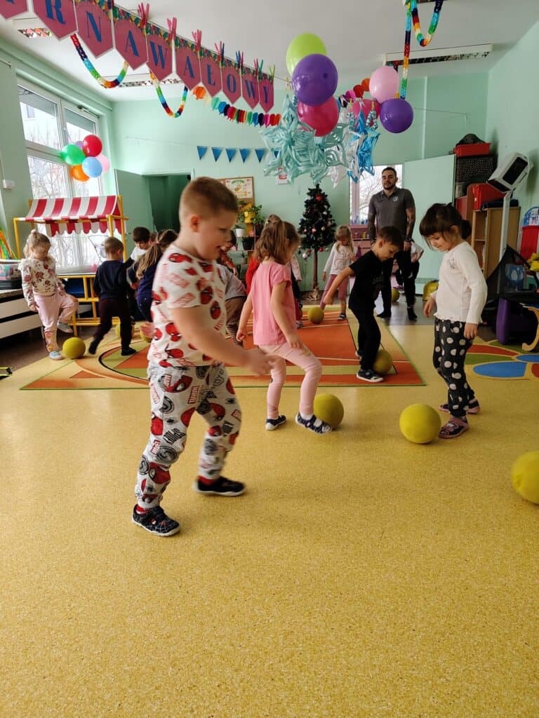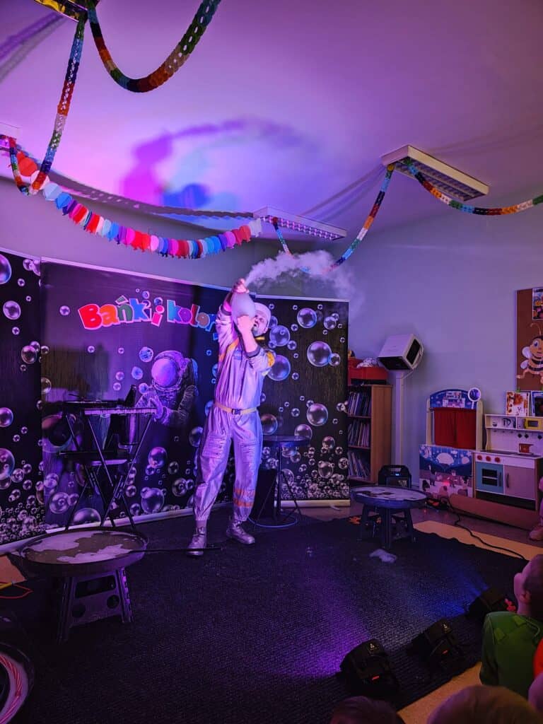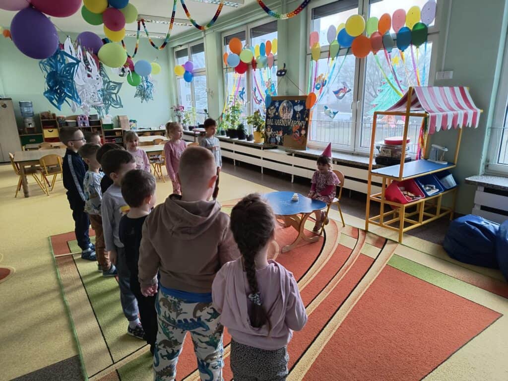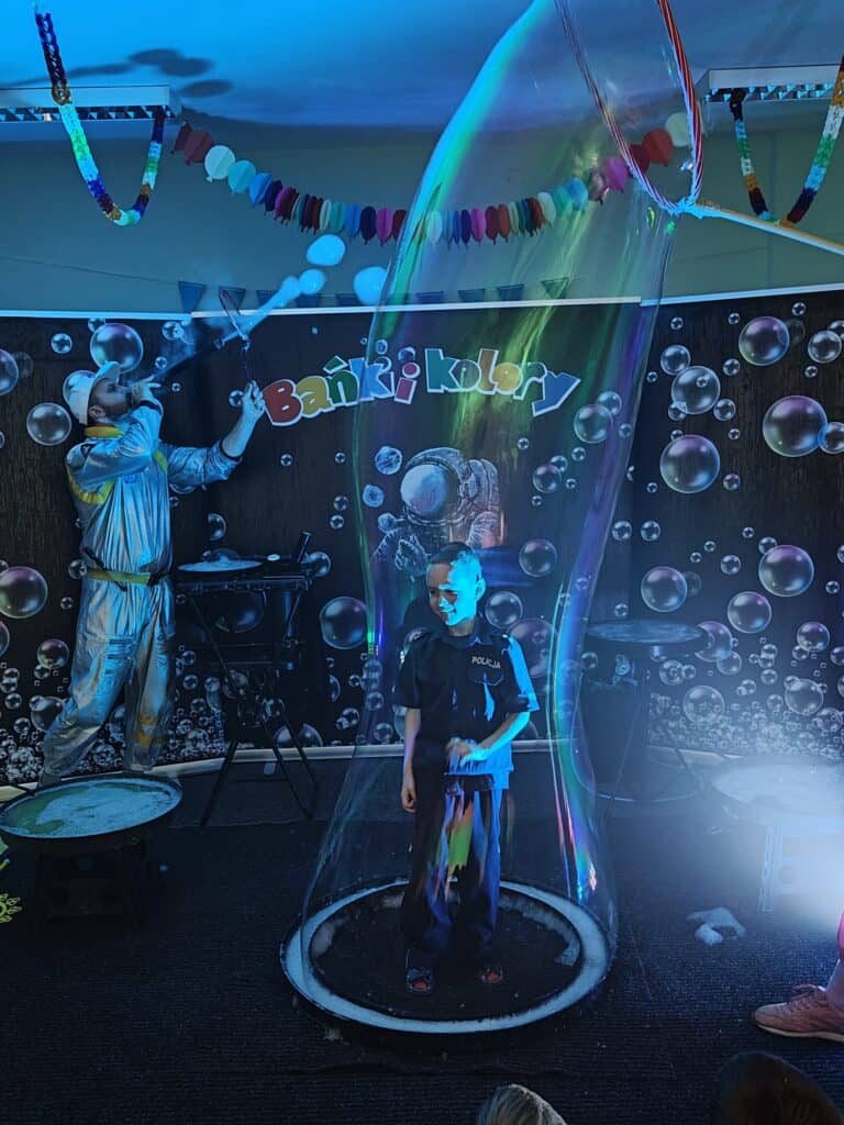 Wyjątkowym wydarzeniem miesiąca był długo wyczekiwany bal karnawałowy. Tego dnia nasza sala zamieniła się w barwną przestrzeń pełną muzyki, tańca i niezwykłych atrakcji. Największą niespodzianką była wizyta dwójki astronautów, którzy zaprosili dzieci do świata baniek mydlanych. Podczas „bańkowego szaleństwa” powstawały ogromne bańki, bańki o zapachu brzoskwini, a nawet widowiskowe bańki z ogniem. Dzieci mogły stanąć w środku wielkiej bańki, co wywołało ogromny zachwyt i wiele spontanicznych okrzyków radości. Nie zabrakło także tańców z balonami, zabawy światłem z wykorzystaniem świecących sznureczków oraz wspólnej zabawy przy muzyce. Całość dopełnił poczęstunek, który pozwolił dzieciom nabrać sił do dalszego świętowania.
