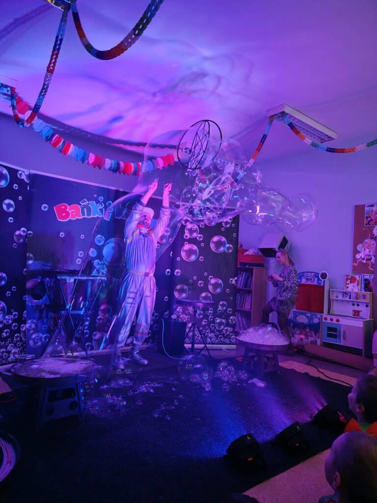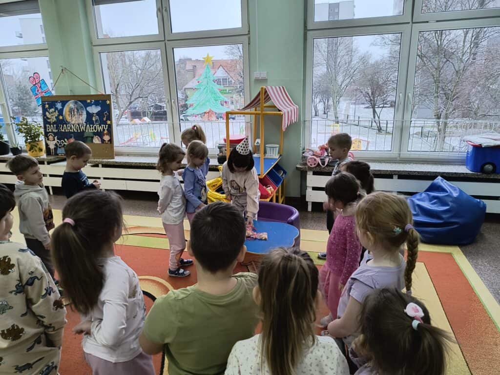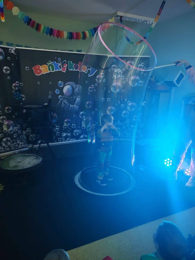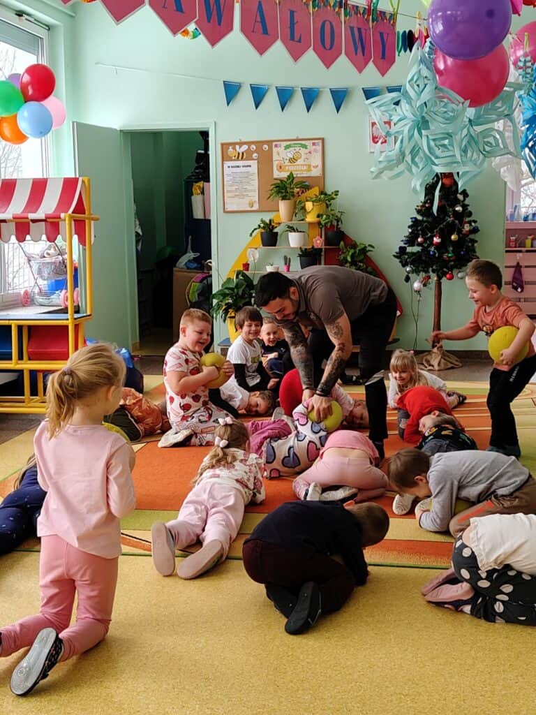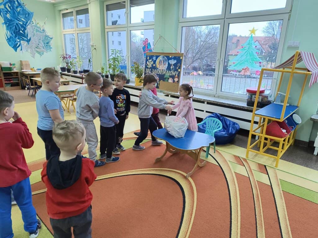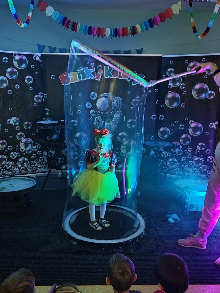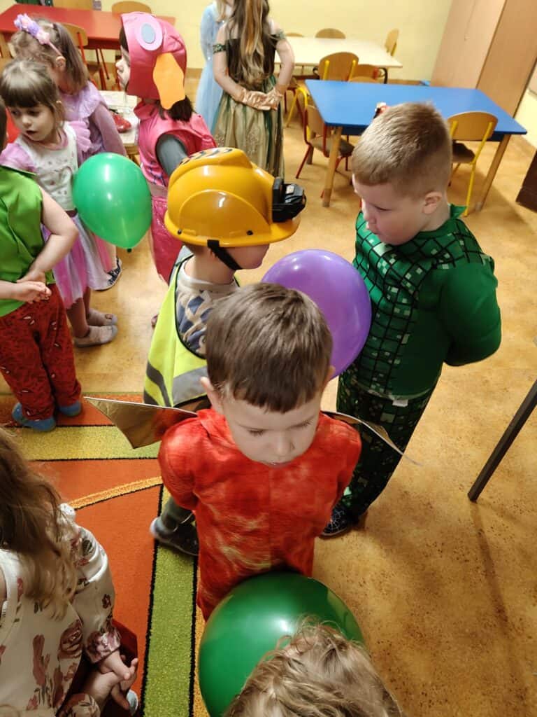 Wyjątkowym wydarzeniem miesiąca był długo wyczekiwany bal karnawałowy. Tego dnia nasza sala zamieniła się w barwną przestrzeń pełną muzyki, tańca i niezwykłych atrakcji. Największą niespodzianką była wizyta dwójki astronautów, którzy zaprosili dzieci do świata baniek mydlanych. Podczas „bańkowego szaleństwa” powstawały ogromne bańki, bańki o zapachu brzoskwini, a nawet widowiskowe bańki z ogniem. Dzieci mogły stanąć w środku wielkiej bańki, co wywołało ogromny zachwyt i wiele spontanicznych okrzyków radości. Nie zabrakło także tańców z balonami, zabawy światłem z wykorzystaniem świecących sznureczków oraz wspólnej zabawy przy muzyce. Całość dopełnił poczęstunek, który pozwolił dzieciom nabrać sił do dalszego świętowania.