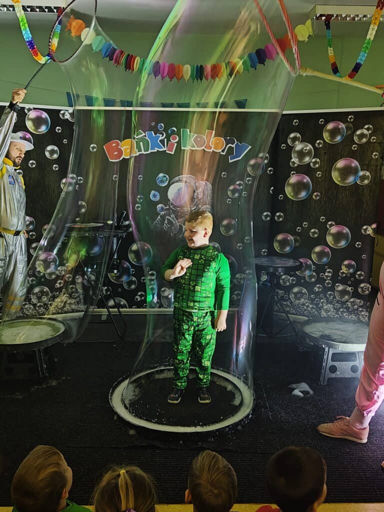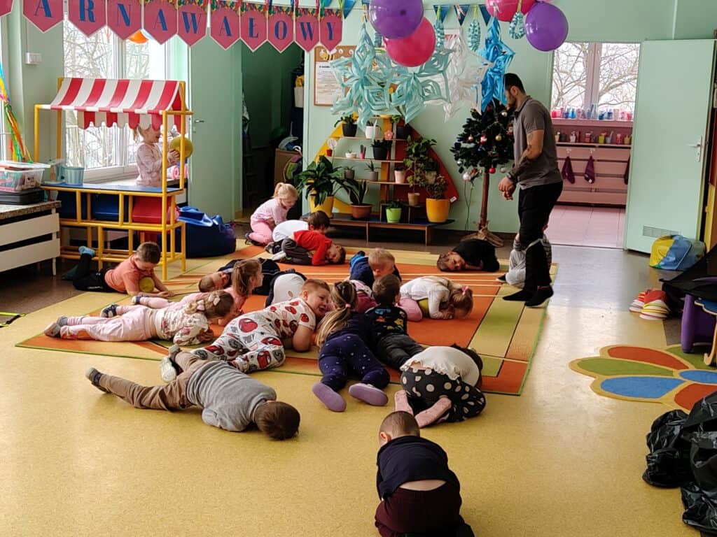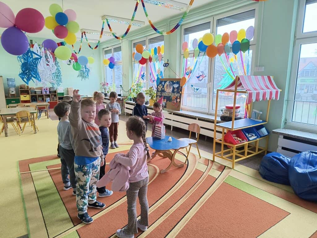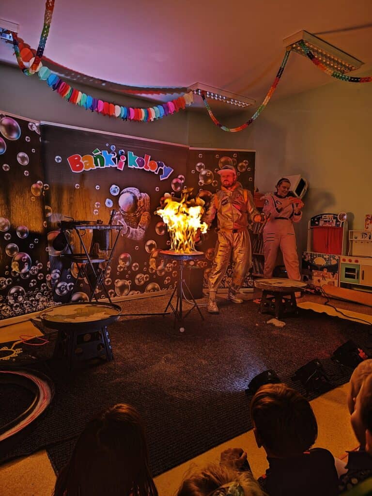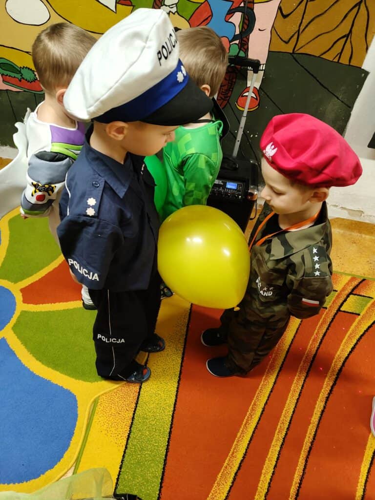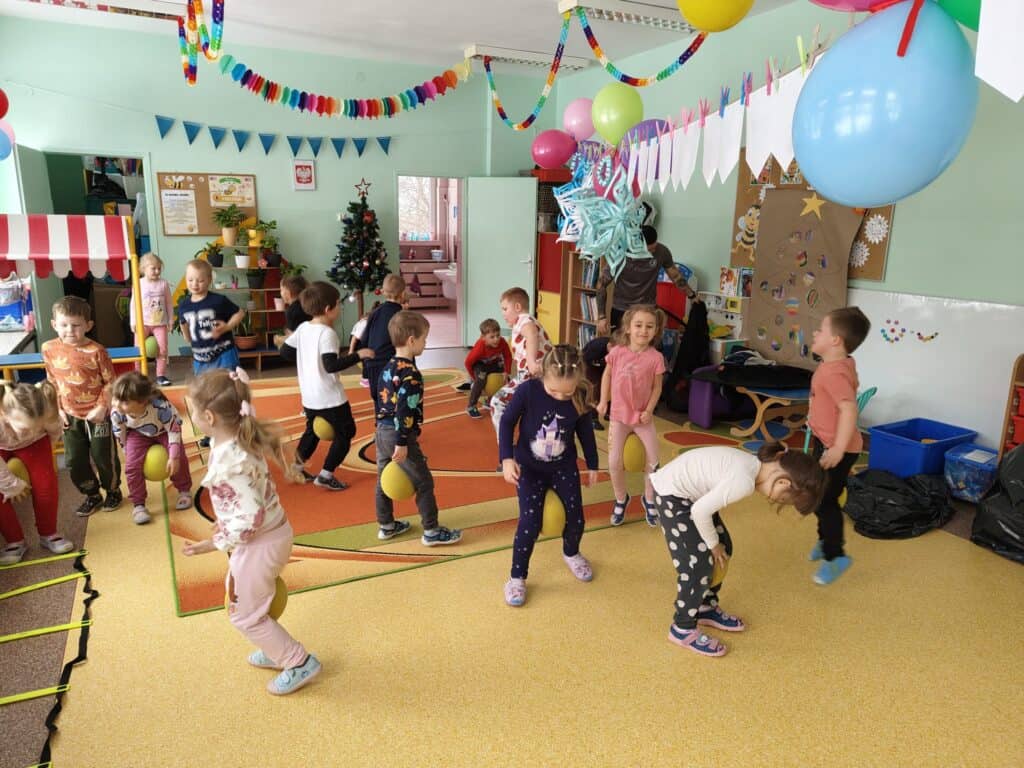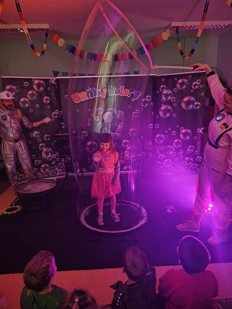 Wyjątkowym wydarzeniem miesiąca był długo wyczekiwany bal karnawałowy. Tego dnia nasza sala zamieniła się w barwną przestrzeń pełną muzyki, tańca i niezwykłych atrakcji. Największą niespodzianką była wizyta dwójki astronautów, którzy zaprosili dzieci do świata baniek mydlanych. Podczas „bańkowego szaleństwa” powstawały ogromne bańki, bańki o zapachu brzoskwini, a nawet widowiskowe bańki z ogniem. Dzieci mogły stanąć w środku wielkiej bańki, co wywołało ogromny zachwyt i wiele spontanicznych okrzyków radości. Nie zabrakło także tańców z balonami, zabawy światłem z wykorzystaniem świecących sznureczków oraz wspólnej zabawy przy muzyce. Całość dopełnił poczęstunek, który pozwolił dzieciom nabrać sił do dalszego świętowania.
