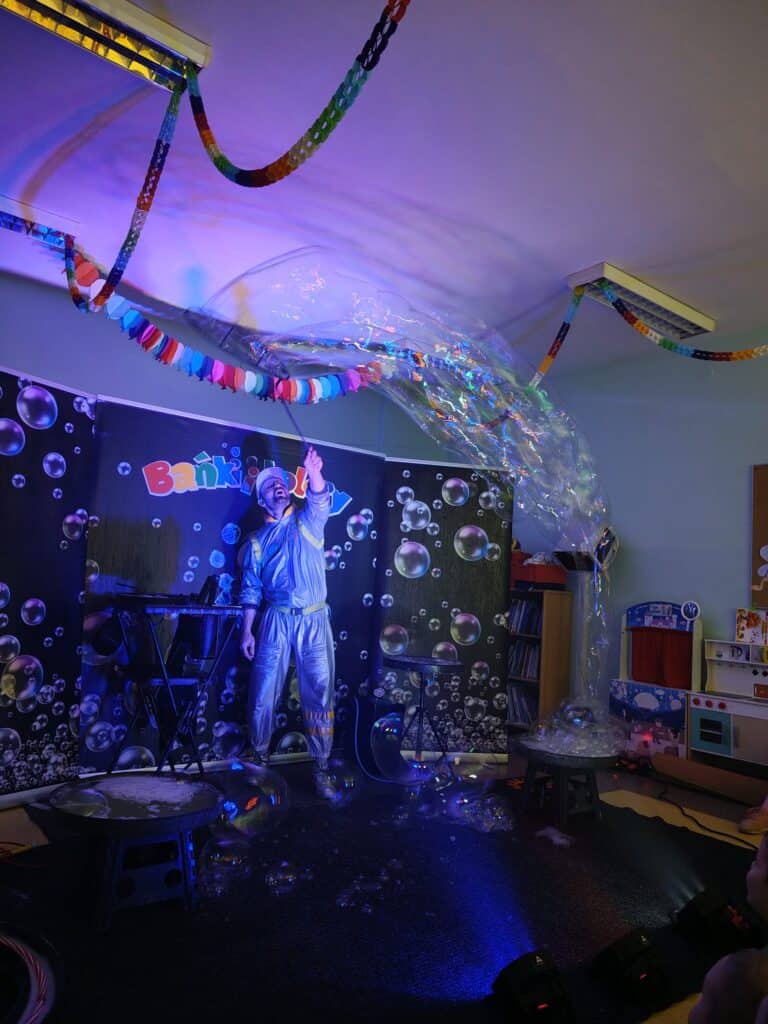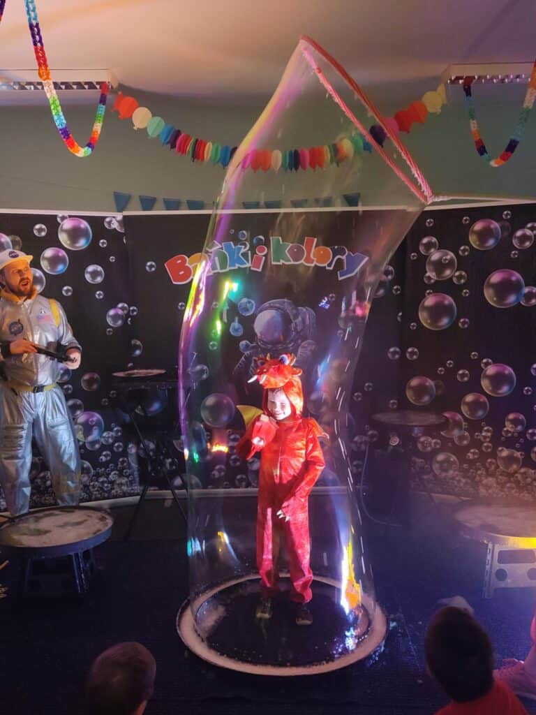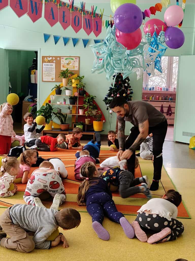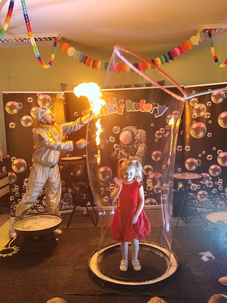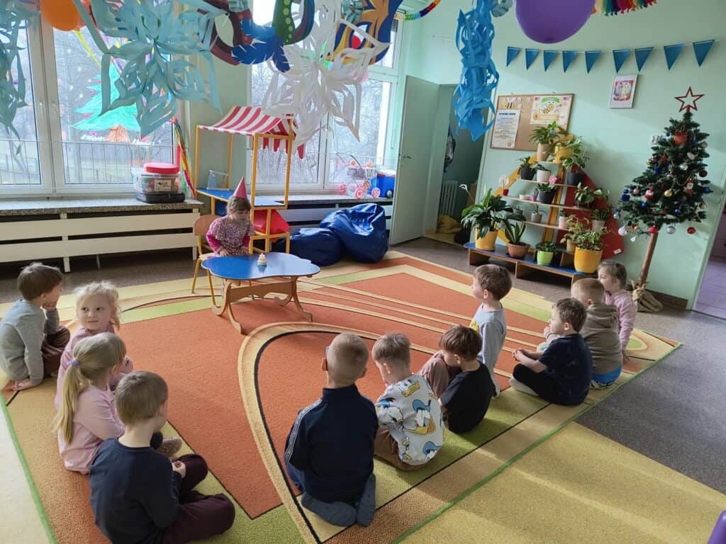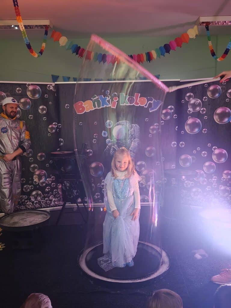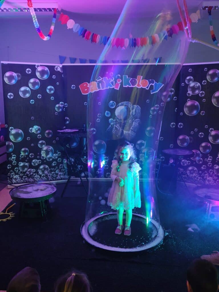 Wyjątkowym wydarzeniem miesiąca był długo wyczekiwany bal karnawałowy. Tego dnia nasza sala zamieniła się w barwną przestrzeń pełną muzyki, tańca i niezwykłych atrakcji. Największą niespodzianką była wizyta dwójki astronautów, którzy zaprosili dzieci do świata baniek mydlanych. Podczas „bańkowego szaleństwa” powstawały ogromne bańki, bańki o zapachu brzoskwini, a nawet widowiskowe bańki z ogniem. Dzieci mogły stanąć w środku wielkiej bańki, co wywołało ogromny zachwyt i wiele spontanicznych okrzyków radości. Nie zabrakło także tańców z balonami, zabawy światłem z wykorzystaniem świecących sznureczków oraz wspólnej zabawy przy muzyce. Całość dopełnił poczęstunek, który pozwolił dzieciom nabrać sił do dalszego świętowania.