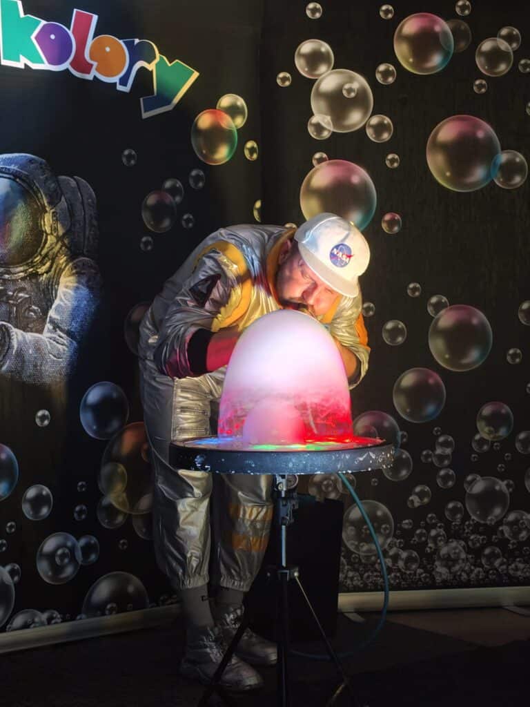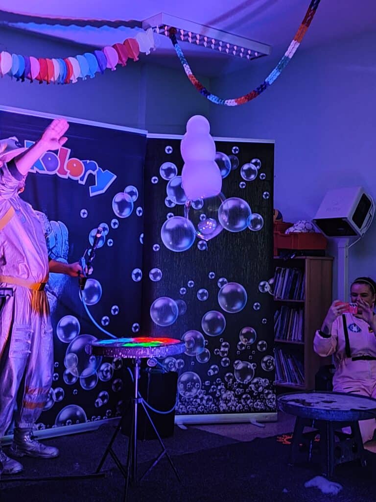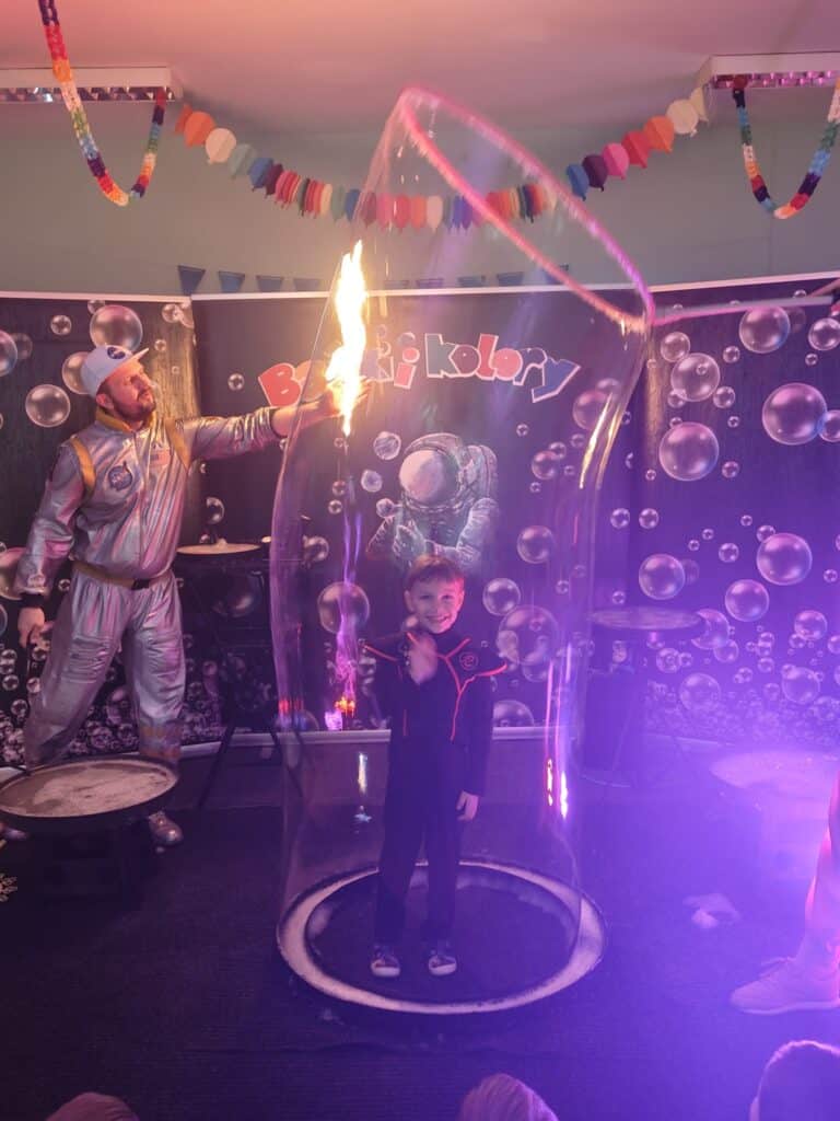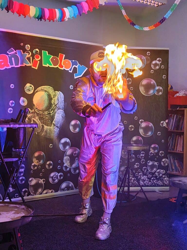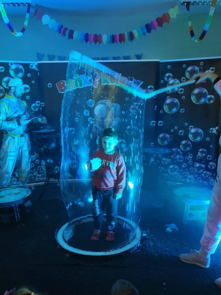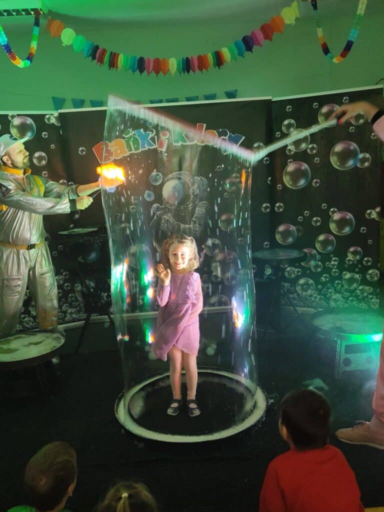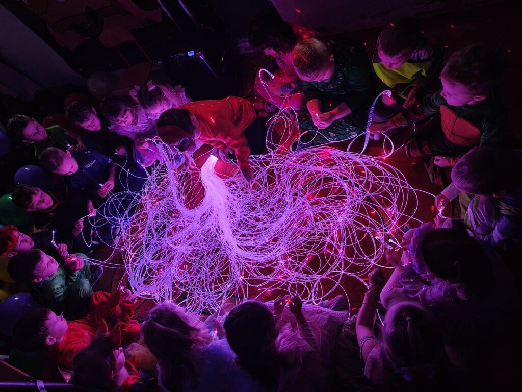 Wyjątkowym wydarzeniem miesiąca był długo wyczekiwany bal karnawałowy. Tego dnia nasza sala zamieniła się w barwną przestrzeń pełną muzyki, tańca i niezwykłych atrakcji. Największą niespodzianką była wizyta dwójki astronautów, którzy zaprosili dzieci do świata baniek mydlanych. Podczas „bańkowego szaleństwa” powstawały ogromne bańki, bańki o zapachu brzoskwini, a nawet widowiskowe bańki z ogniem. Dzieci mogły stanąć w środku wielkiej bańki, co wywołało ogromny zachwyt i wiele spontanicznych okrzyków radości. Nie zabrakło także tańców z balonami, zabawy światłem z wykorzystaniem świecących sznureczków oraz wspólnej zabawy przy muzyce. Całość dopełnił poczęstunek, który pozwolił dzieciom nabrać sił do dalszego świętowania.