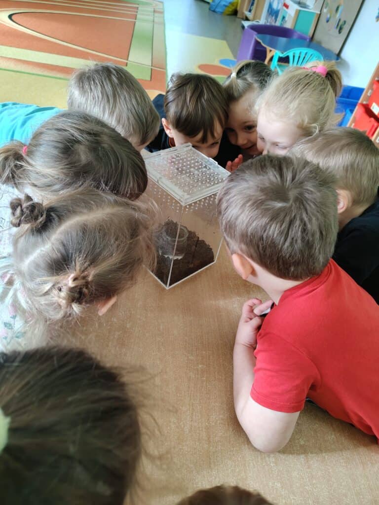 Styczeń przyniósł również ważną nowość w naszej sali – pojawił się nowy mieszkaniec, patyczak. Dzieci z zainteresowaniem poznawały jego zwyczaje, sposób poruszania się oraz potrzeby. Rozmawialiśmy o tym, czym się żywi, jak należy dostarczać mu wodę i dlaczego tak ważna jest odpowiedzialność za zwierzęta. Nowy lokator szybko stał się obiektem codziennych obserwacji i rozmów. I otrzymał imię GUCIO!