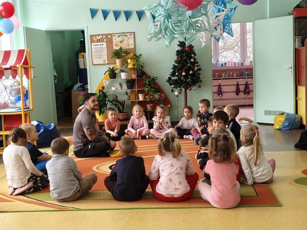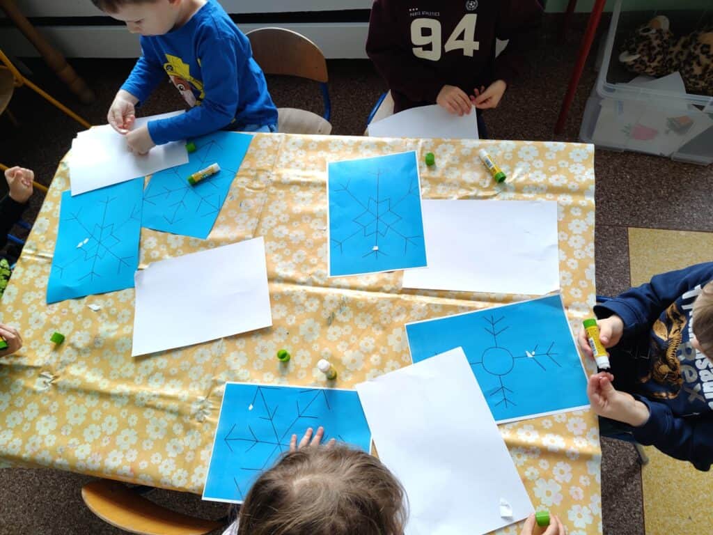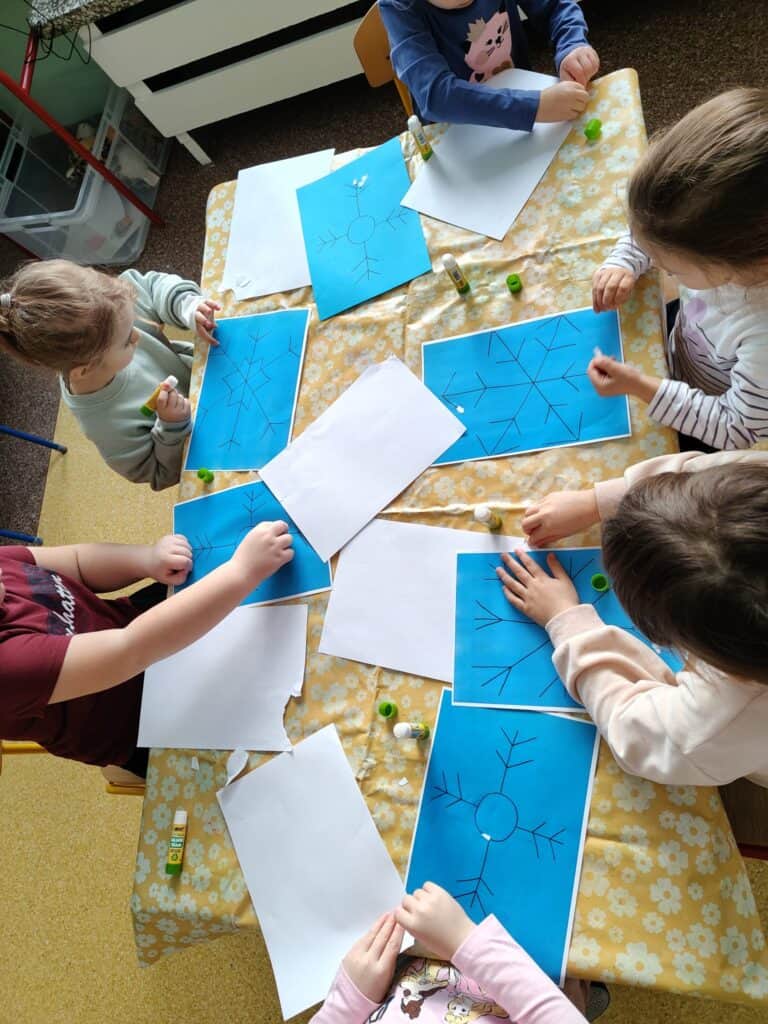 Nowy rok przywitaliśmy z ogromną energią i ciekawością świata. Styczeń przyniósł nam prawdziwie zimową aurę, wiele nowych doświadczeń, a także wyjątkowe wydarzenia, które na długo pozostaną w pamięci naszych przedszkolaków. Pierwsze tygodnie miesiąca upłynęły pod znakiem zimowych obserwacji i zabaw na świeżym powietrzu. Dzieci z radością korzystały z uroków śnieżnej pogody, a każda wyjście do ogrodu przedszkolnego stawało się okazją do nauki poprzez działanie. Rozmawialiśmy o tym, że każdy płatek śniegu jest niepowtarzalny i nie istnieją dwa identyczne – ta informacja wzbudziła ogromne zdziwienie i wiele pytań. Poznaliśmy również proces powstawania śniegu oraz dowiedzieliśmy się, dlaczego śnieg topnieje, gdy robi się cieplej. Zimowej teorii towarzyszyła praktyka: odbyła się prawdziwa bitwa na śnieżki, powstawały aniołki na śniegu, a rumieńce na twarzach dzieci były najlepszym dowodem na to, jak wiele radości przynosi wspólna zabawa. Uzupełnieniem tych doświadczeń była praca plastyczna „Śnieżynka”, podczas której dzieci tworzyły delikatne, zimowe kompozycje rozwijając precyzję i wyobraźnię.