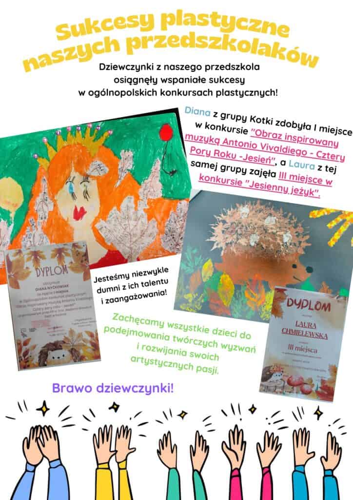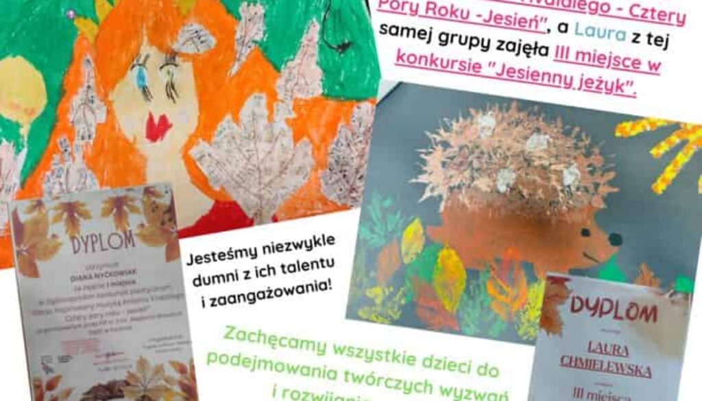 Diana z grupy Kotki zdobyła I miejsce w konkursie „Obraz inspirowany muzyką Antonio Vivaldiego – Cztery Pory Roku -Jesień”, a Laura z tej samej grupy zajęła III miejsce w konkursie „Jesienny Jeżyk”. Jesteśmy niezwykle dumni z ich talentu i zaangażowania! Zachęcamy wszystkie dzieci do podejmowania twórczych wyzwań i rozwijania swoich artystycznych pasji.
