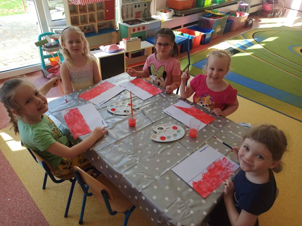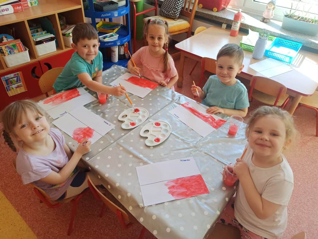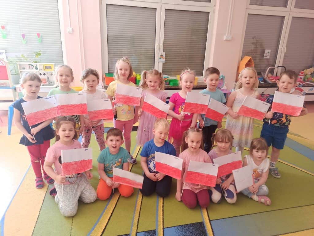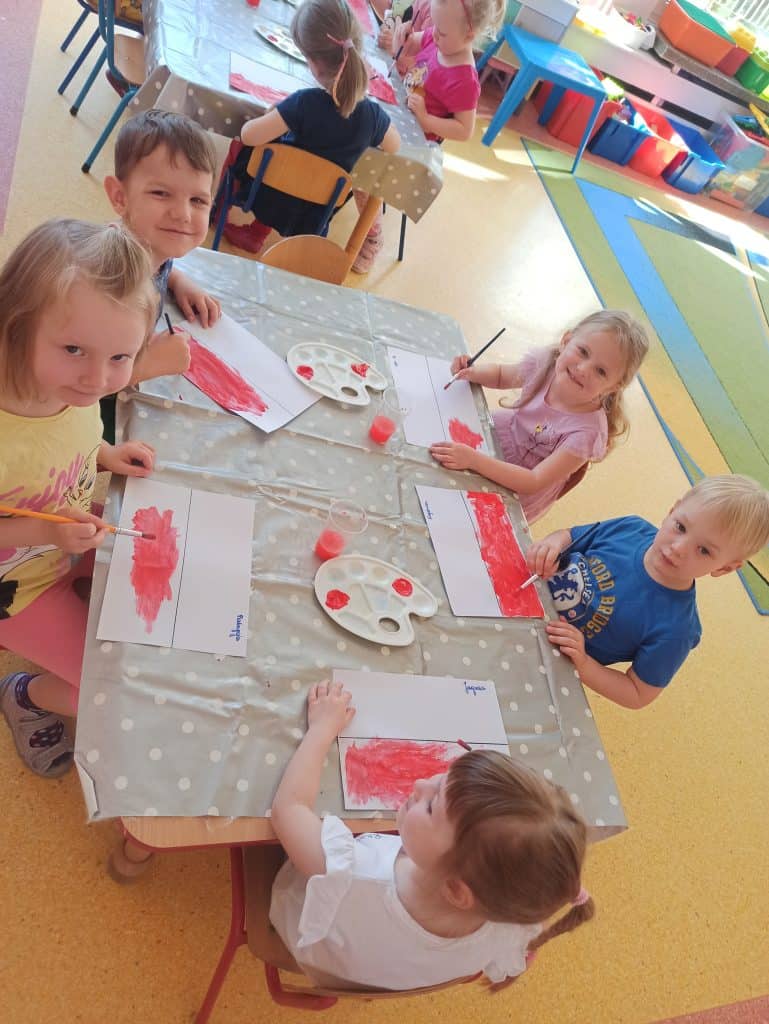 Dzieci z grupy II rozpoczęły miesiąc od zajęć związanych z edukacją patriotyczną. Biedronki rozmawiały o swoim państwie i utrwalały znajomość symboli narodowych. Z okazji zbliżającego się Święta Flagi, każde dziecko wykonało flagę Polski.