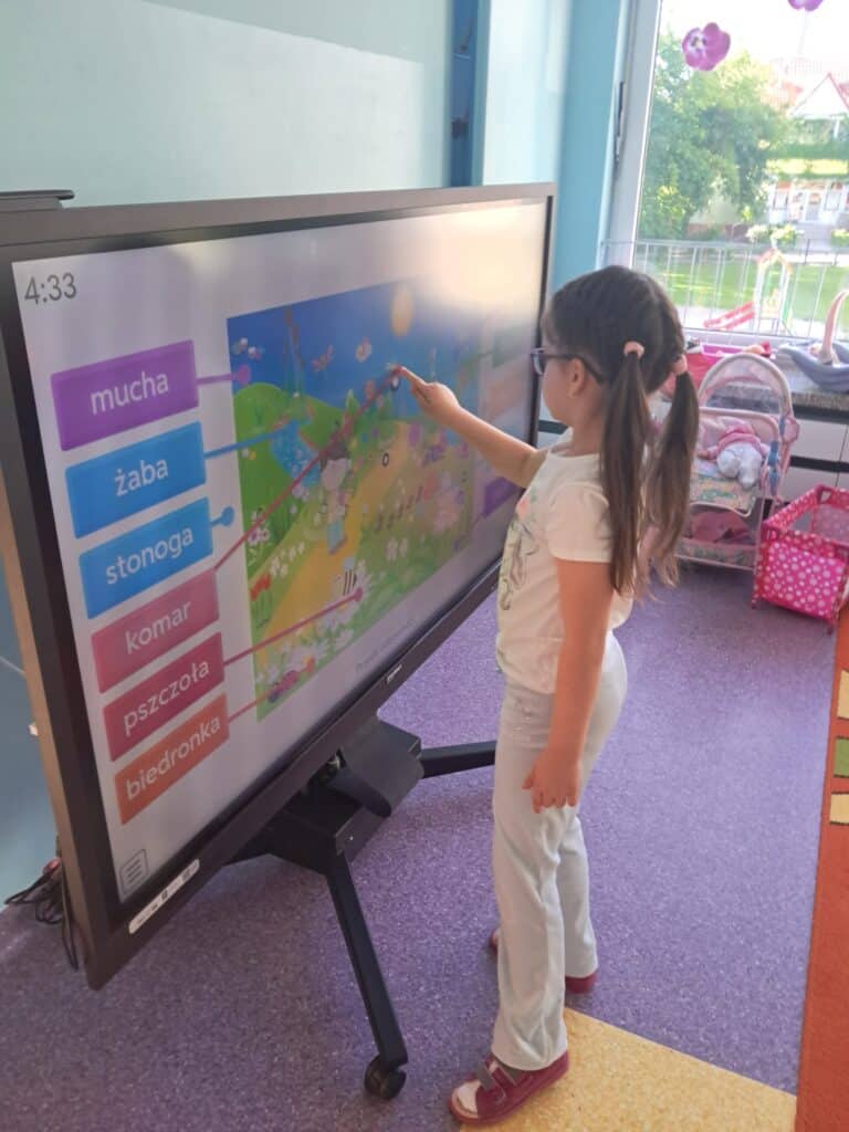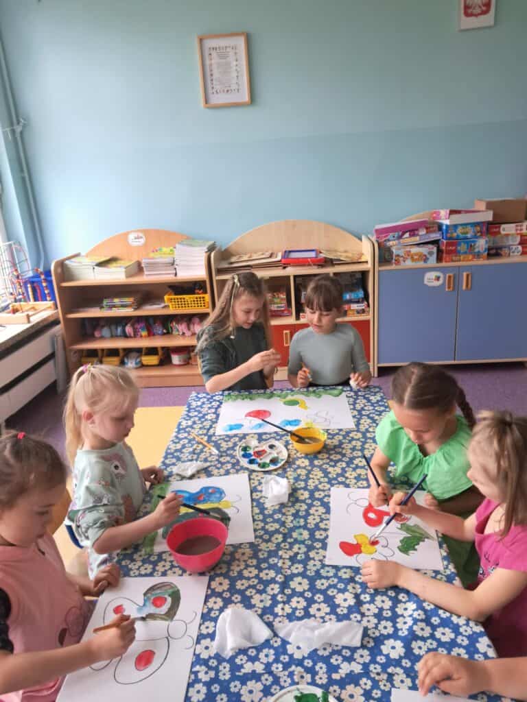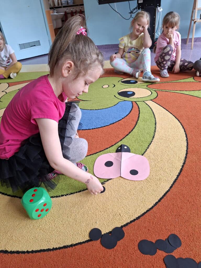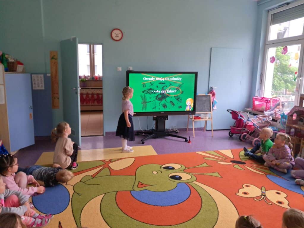 Rozwijając dziecięcą wiedzę przyrodniczą rozmawiano również o majowej łące. Podczas zajęć dzieci brały udział w ćwiczeniach ruchowych, zabawach muzycznych oraz matematycznych. Rozwiązywały również zagadki z wykorzystaniem ekranu multimedialnego oraz malowały farbami styropianowe biedroneczki.