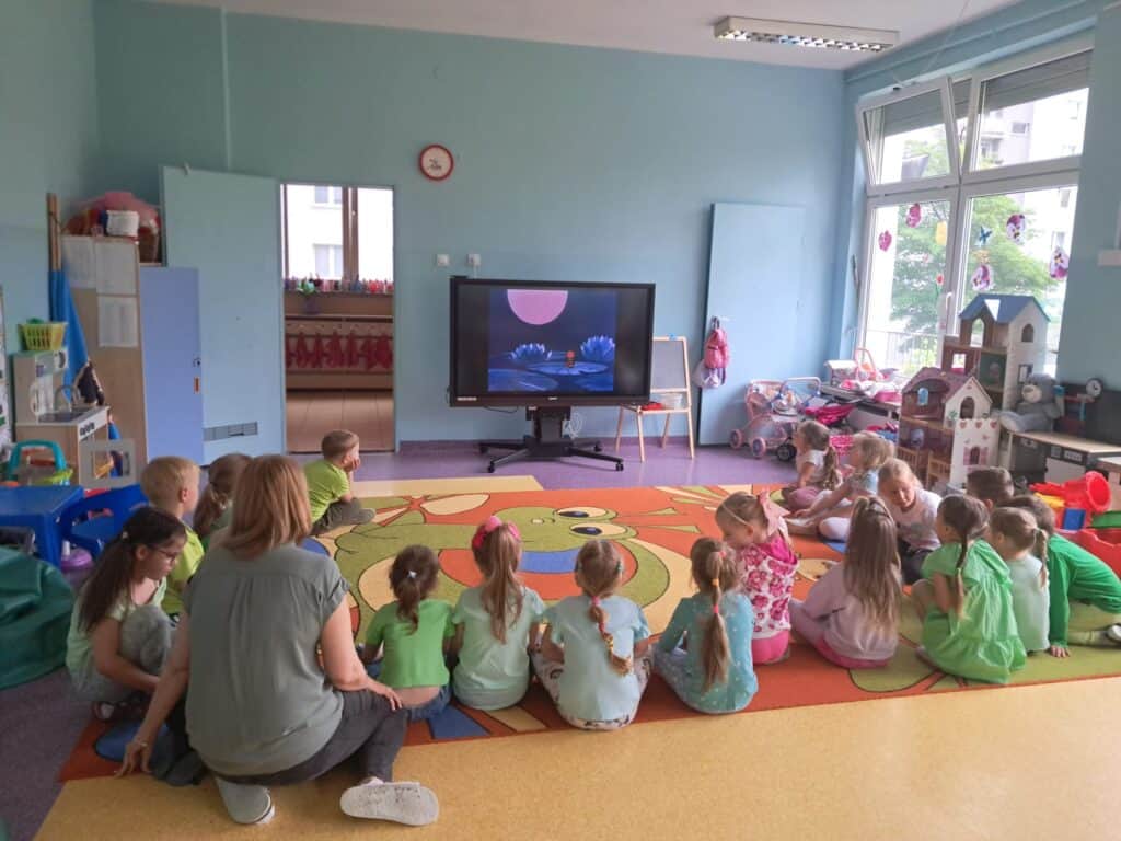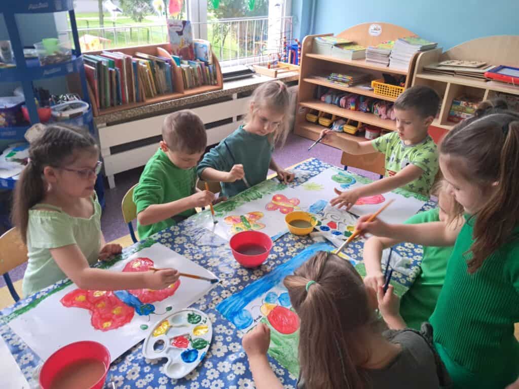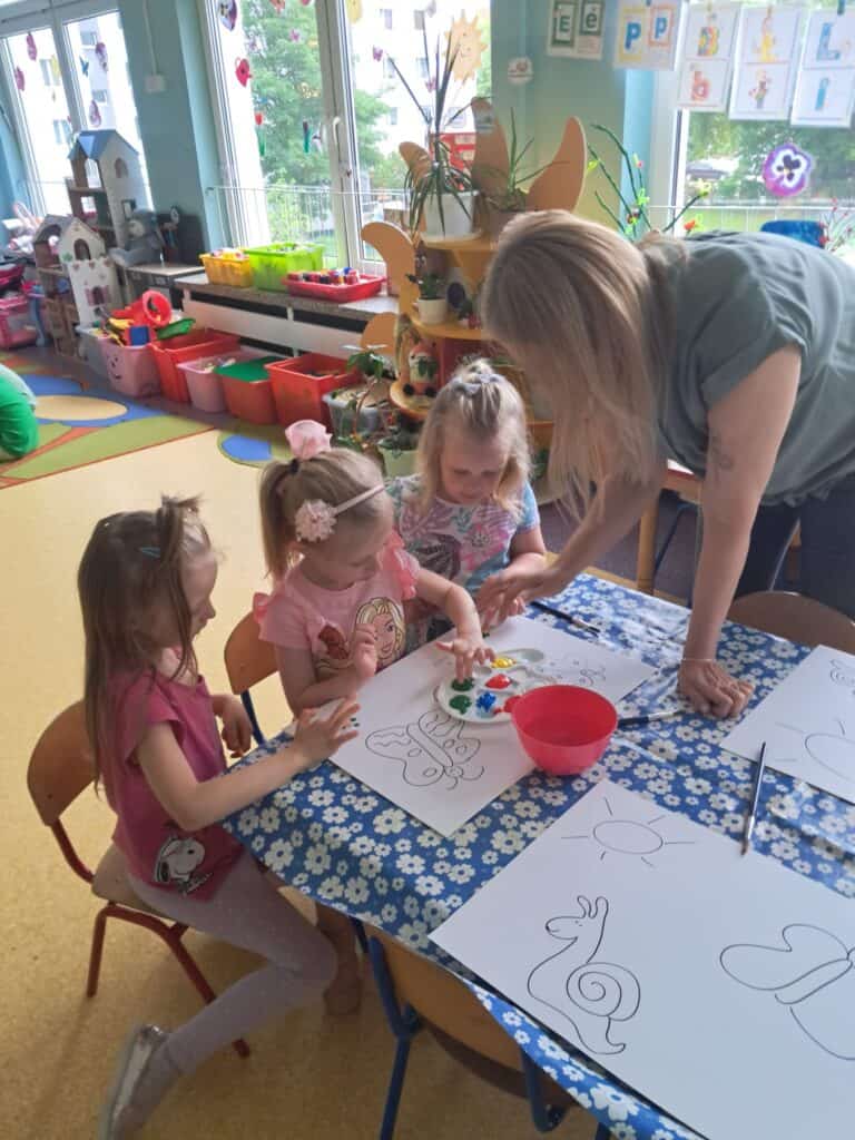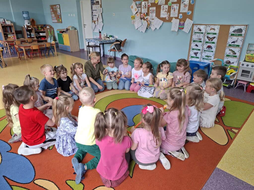 Rozwijając dziecięcą wiedzę przyrodniczą rozmawiano również o majowej łące. Podczas zajęć dzieci brały udział w ćwiczeniach ruchowych, zabawach muzycznych oraz matematycznych. Rozwiązywały również zagadki z wykorzystaniem ekranu multimedialnego oraz malowały farbami styropianowe biedroneczki.