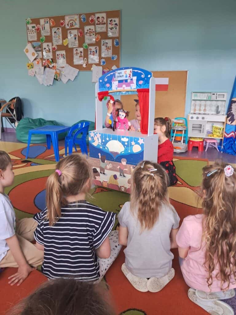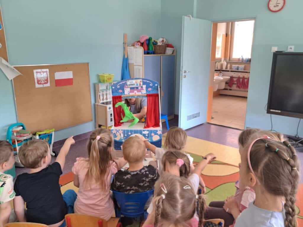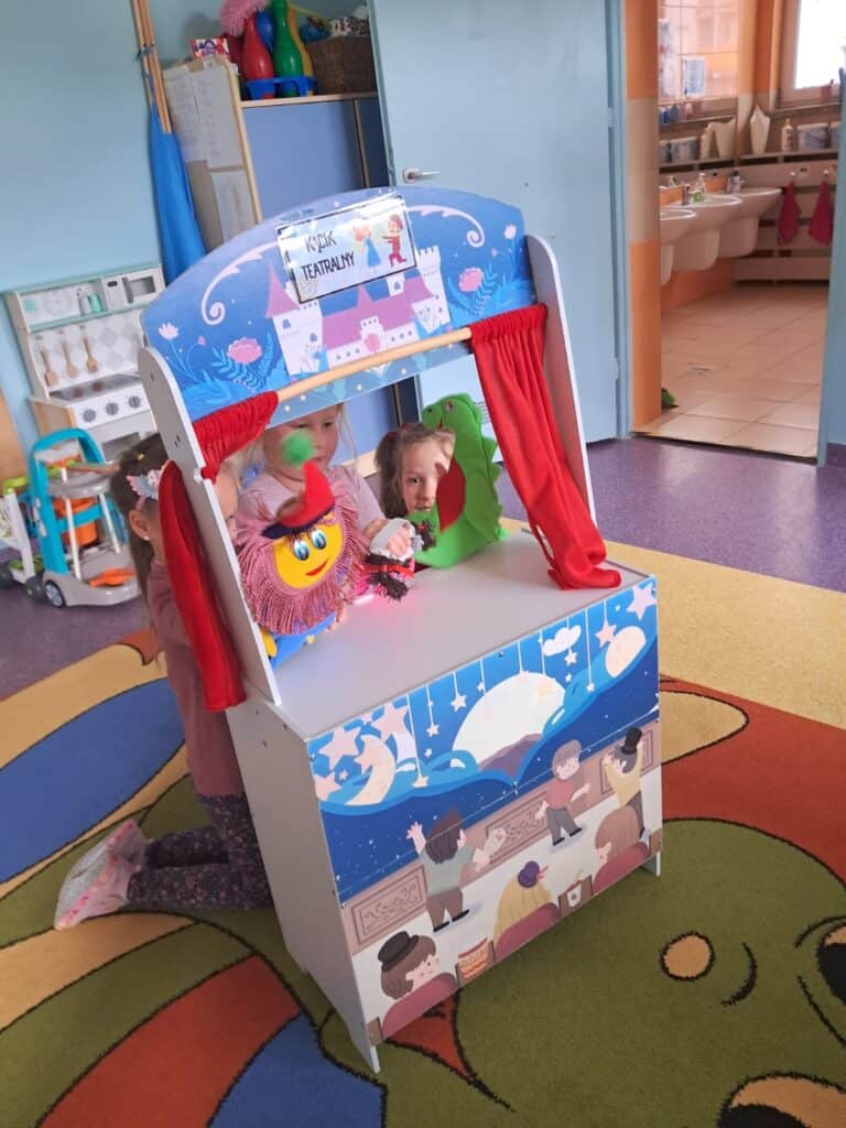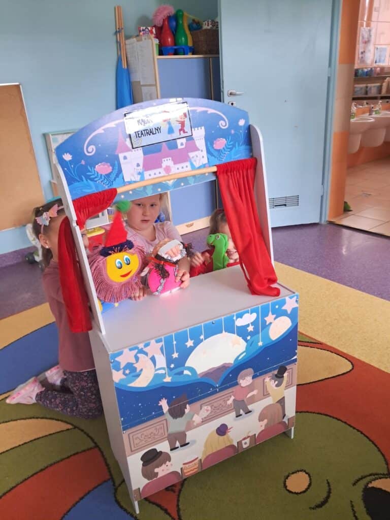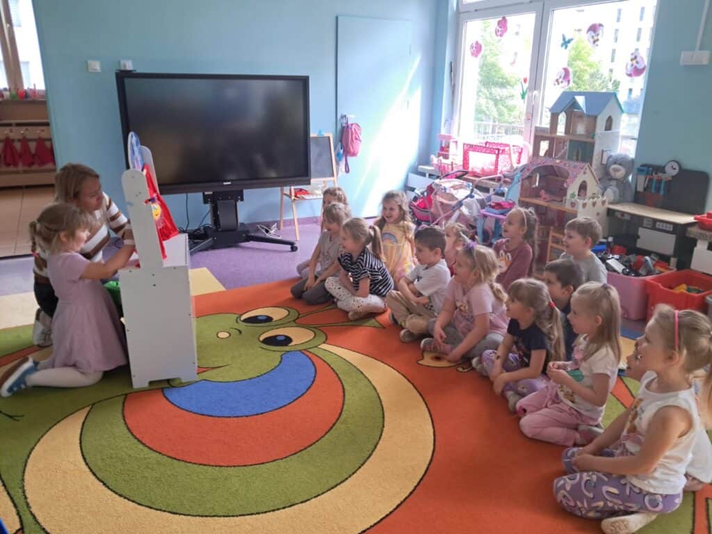 Podczas zajęć dydaktycznych dzieci z gr IV rozmawiały na temat teatru. Poszerzały zakres słownictwa związanego z omawianą tematyką, a także próbowały swoich sił jako aktorzy. W danym tygodniu często bawiono się w teatrzyk i odgrywano wymyślone przez dzieci przedstawienia. Poznano również teatrzyk Kamishibai. Z jego wykorzystaniem przedstawiono dzieciom bajkę o dwóch żabkach, które wyruszyły w podróż aby poznać dalekie krainy.