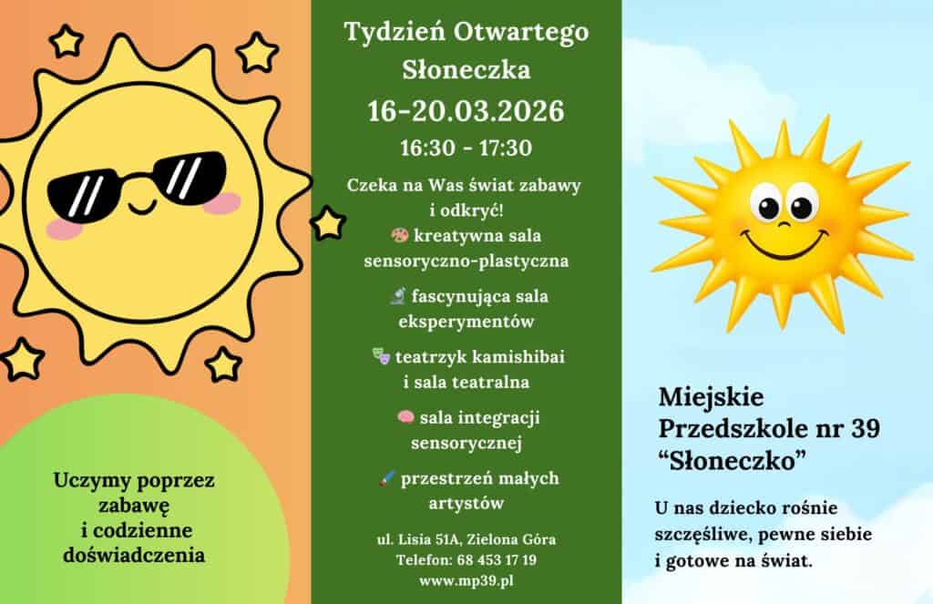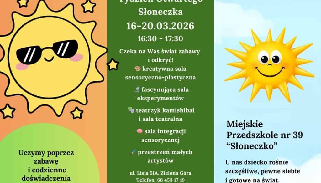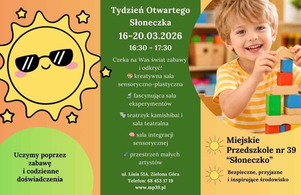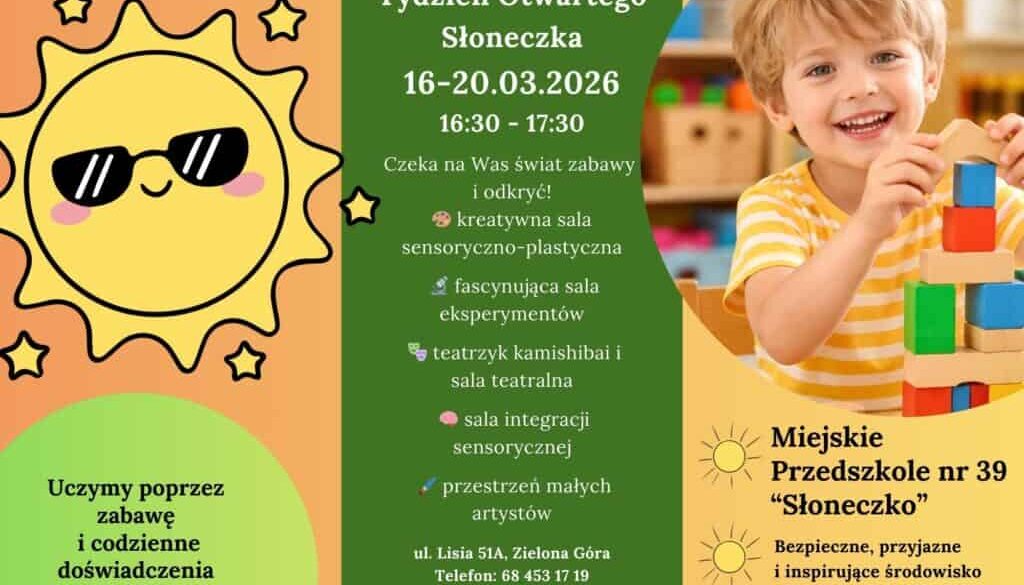 Zapraszamy serdecznie dzieci i rodziców na Tydzień Otwarty w naszym przedszkolu „Słoneczko”,który odbędzie się 16-20.03.2026! To doskonała okazja, aby poznać naszą kadrę, zobaczyć sale, wziąć udział we wspólnych zabawach i poczuć ciepłą, rodzinną atmosferę naszego miejsca.