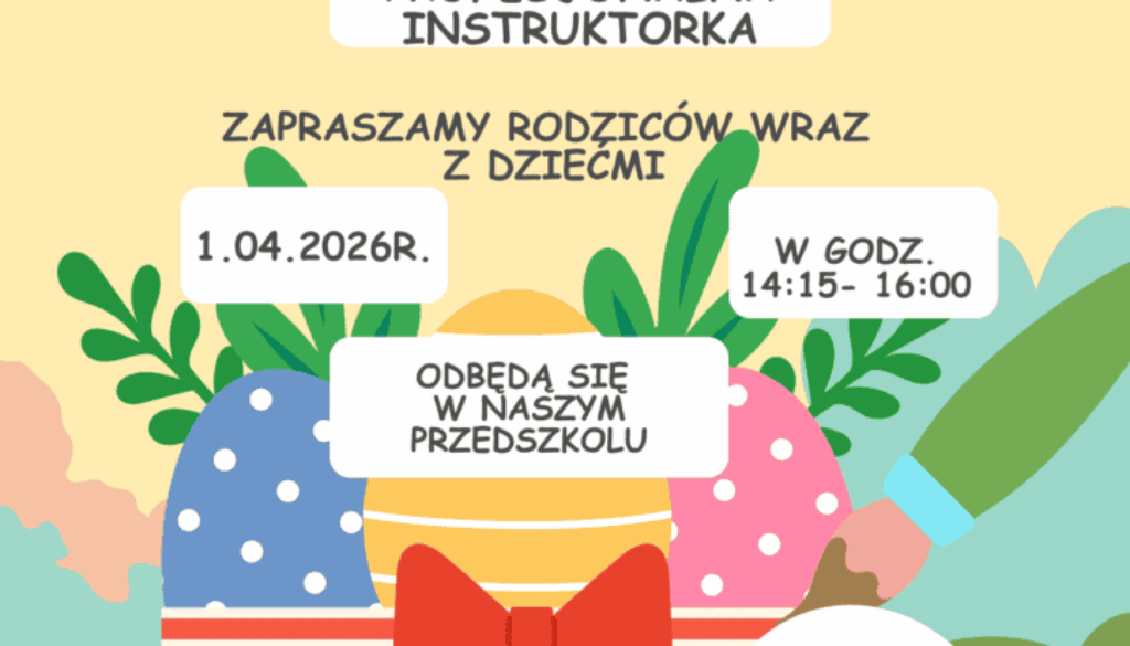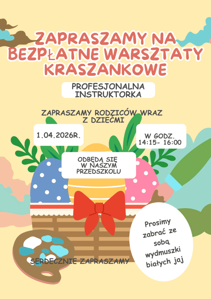 1.04.2026 r. w godzinach 14.15 – 16.00 zapraszamy, przy okazji odbierania dziecka z przedszkola, na rodzinne warsztaty malowania pisanek. Jedynym warunkiem jest przyjście i przyniesienie wydmuszek (najlepiej białych) i chęć działania – warsztaty są bezpłatne. Szczegóły na plakacie.