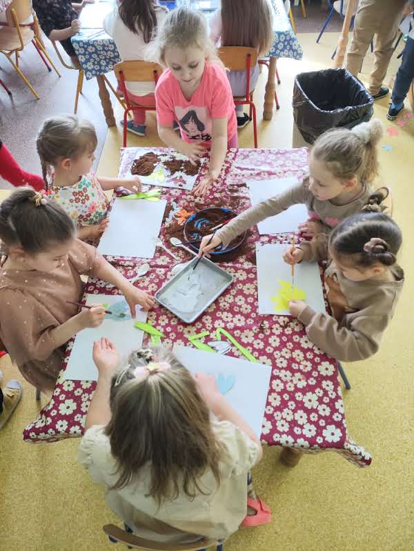 W czasie zajęć plastycznych dzieci tworzyły m.in. ziemiste obrazki w ramach tematu „Kolorowa podróż” oraz brały udział w zabawach z kubeczkami, wykorzystując różnorodne materiały sensoryczne. Każde takie działanie rozwijało wyobraźnię, motorykę małą i umiejętności wyrażania emocji poprzez sztukę.