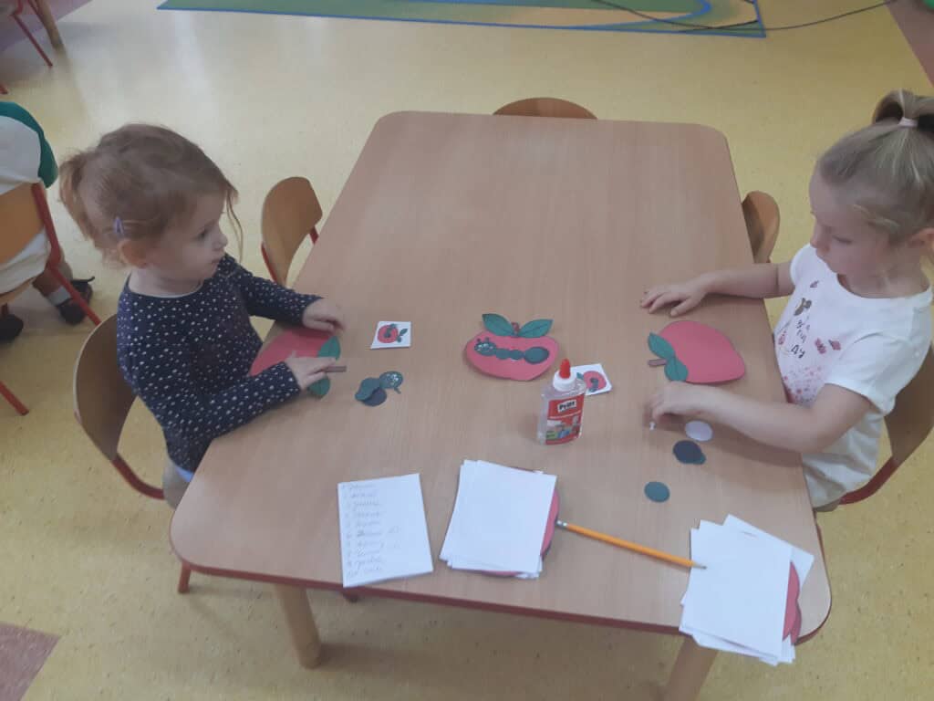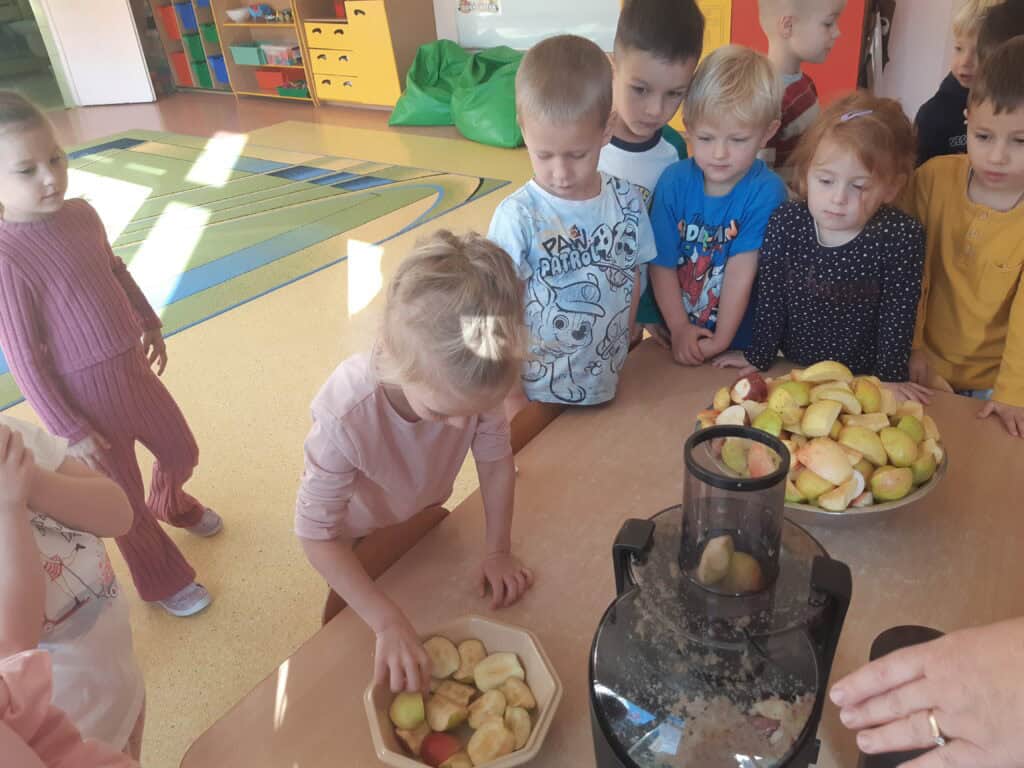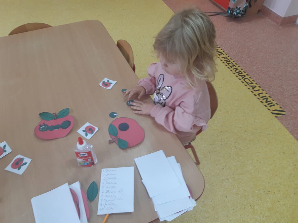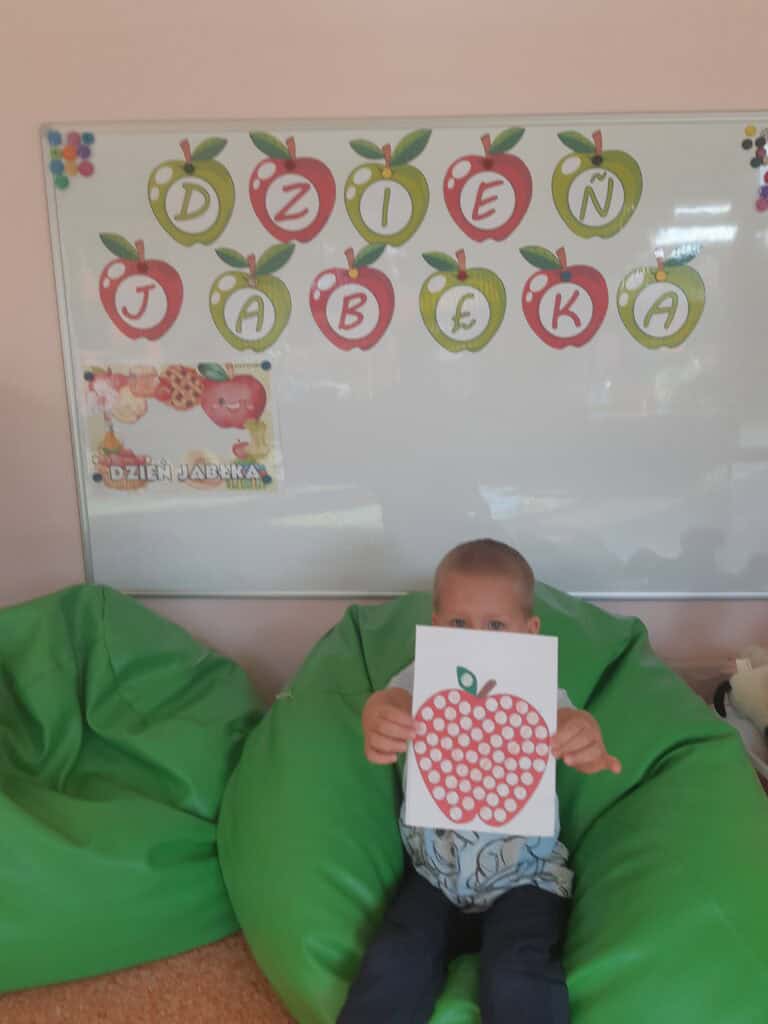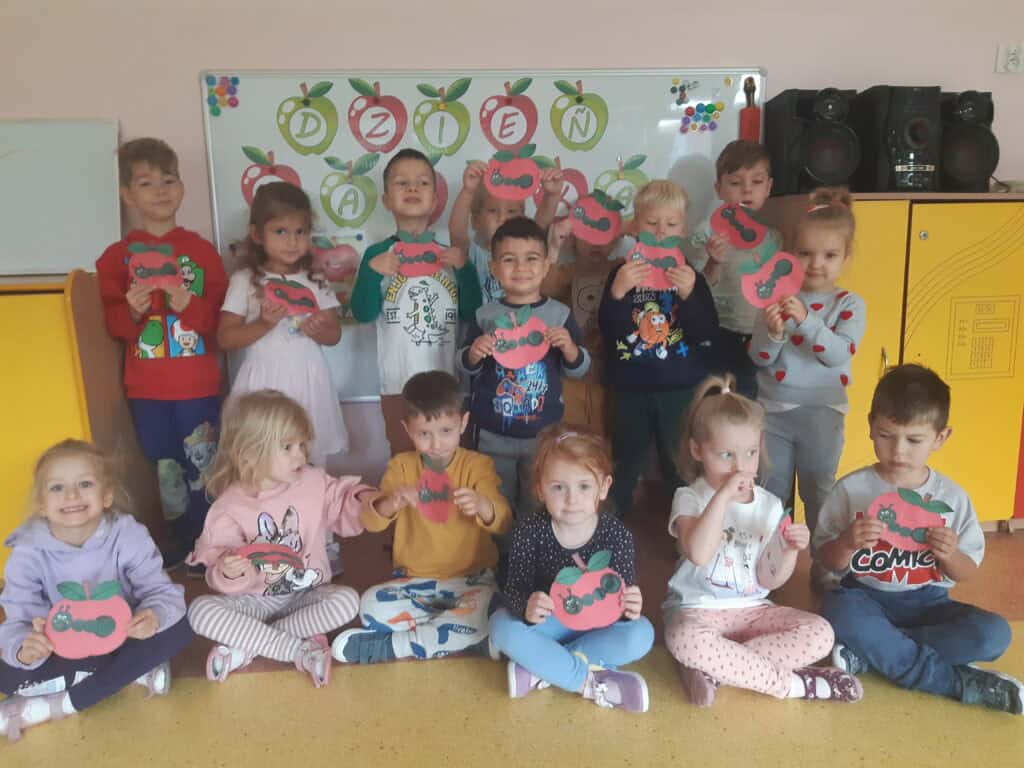 Podczas Święta Jabłka przedszkolaki poszerzały swoją wiedzę o jabłku: poznawały różne gatunki jabłek, kolory, kształty. Rozmawiały także o tym, co możemy przygotować z tych owoców. I nawet przygotowały pyszny, zdrowy sok jabłkowy. Dzieci wykazały się dużą spostrzegawczością podczas układania jabłuszkowych puzzli, porównywania wielkości oraz zręcznością w zabawie „Robaczek”. Na zakończenie zabaw związanych z tym dniem każdy wykonał wycinankę „Jabłuszko”. Dzień Jabłka zaliczamy do bardzo udanych i zachęcamy wszystkich do jedzenia jabłek, nie tylko od święta, bo to źródło zdrowia i witamin.