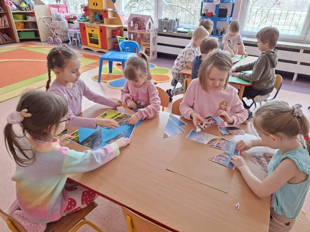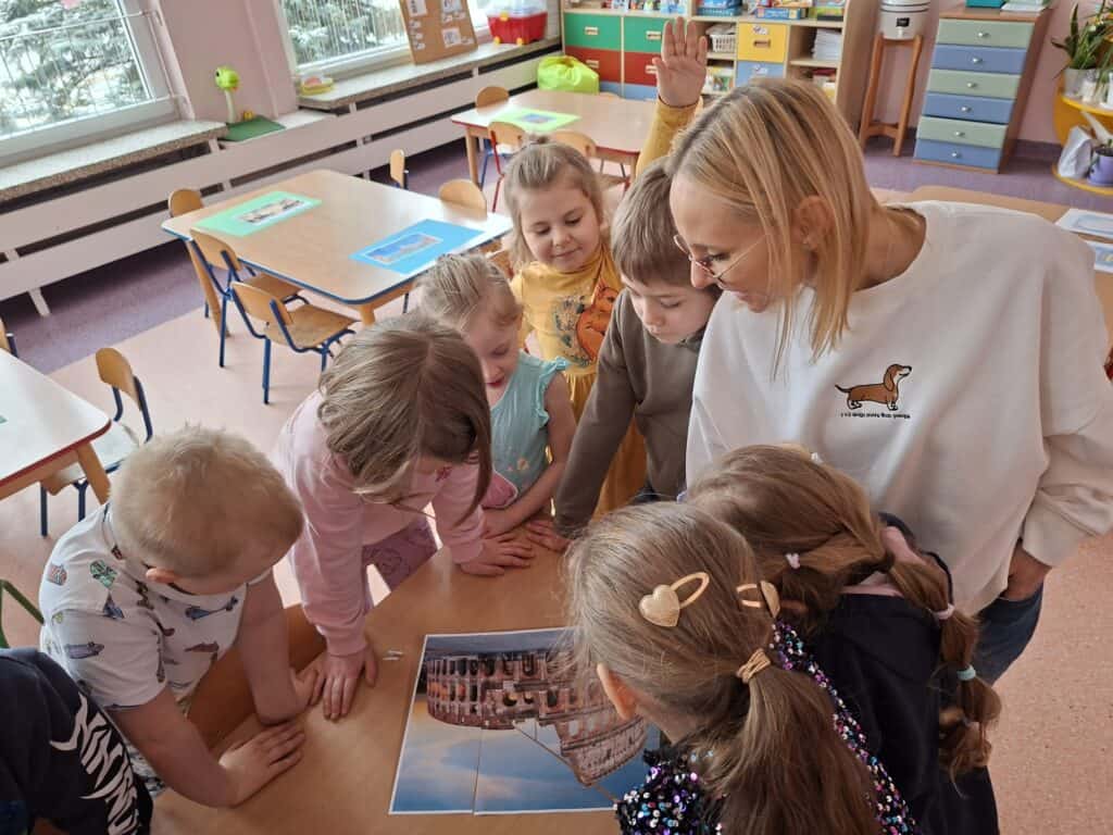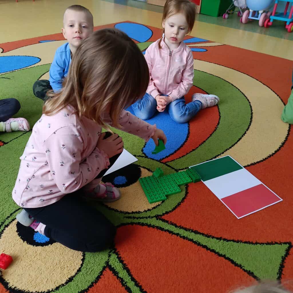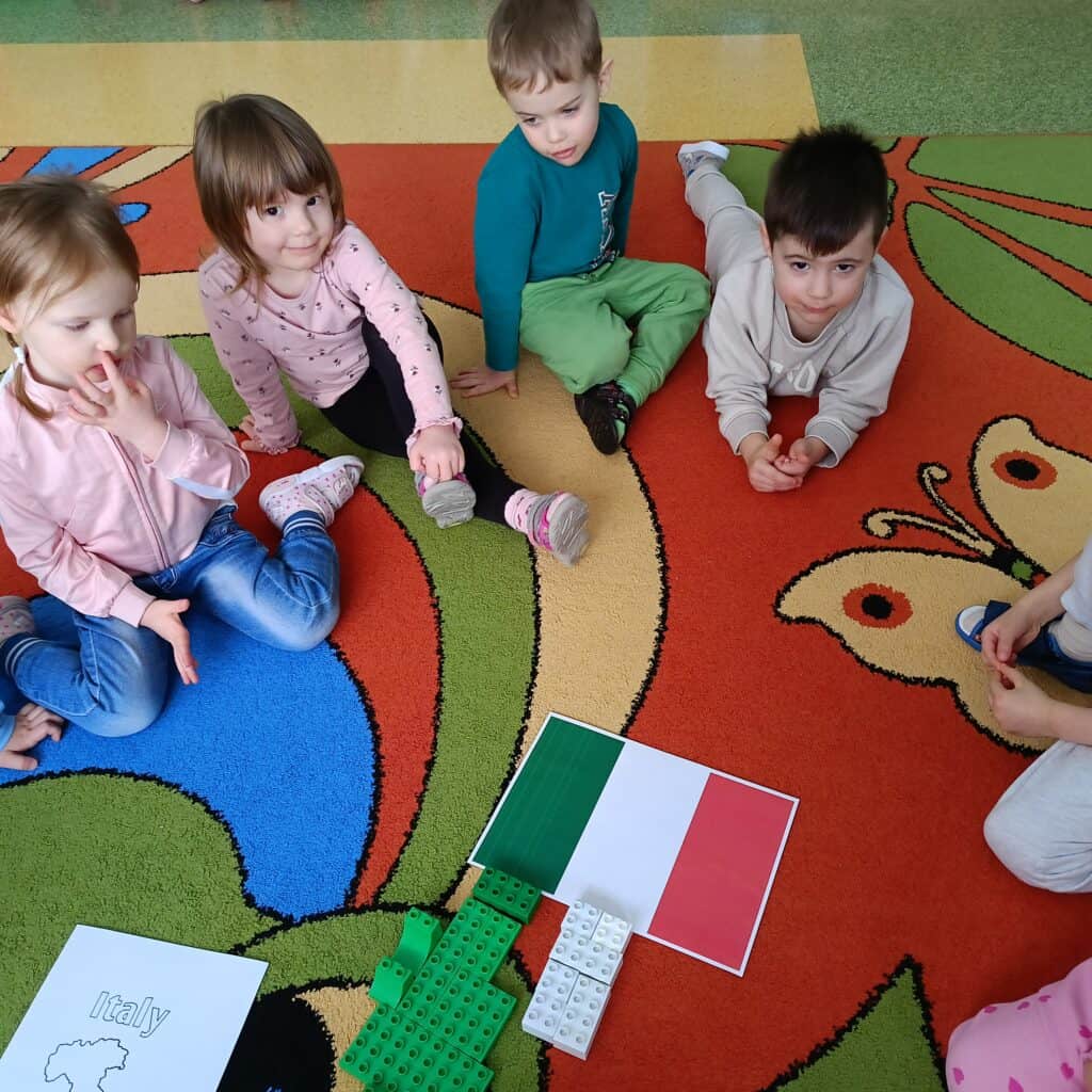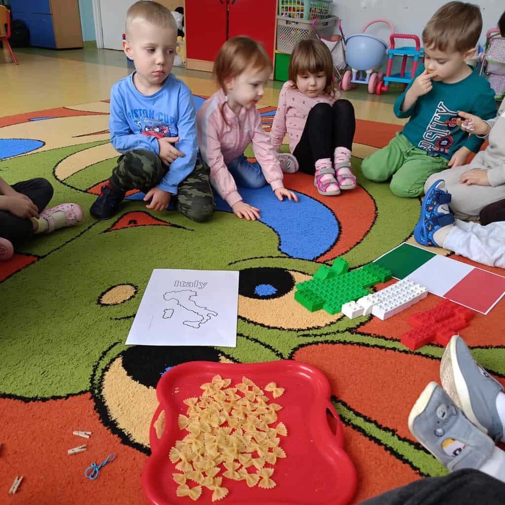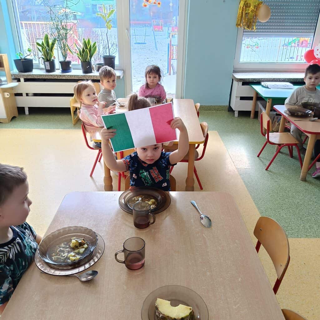 W naszym przedszkolu odbył się wyjątkowy Dzień Włoski, podczas którego przedszkolaki miały okazję poznać kulturę i tradycję słonecznych Włoch. Na początku dzieci dowiedziały się, gdzie na mapie znajdują się Włochy oraz jak wygląda flaga tego kraju. Rozmawialiśmy też o stolicy – Rzymie, a także o najbardziej znanych miejscach, takich jak Koloseum czy Krzywa Wieża w Pizie. Tego dnia panie kucharki zaserwowały dzieciom na obiad zupę neapolitańską oraz pizzę! Wszystko było pyszne i szybko zniknęło z talerzy. Przedszkolaki ze Słoneczka uwielbiają poznawać nowe kraje i ich smaki.