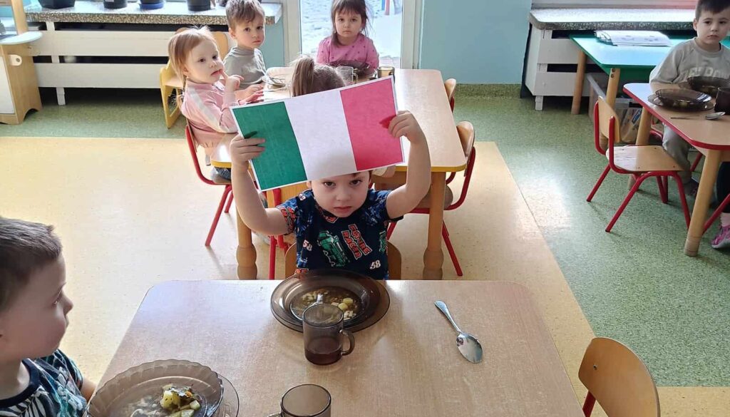 W naszym przedszkolu odbył się wyjątkowy Dzień Włoski, podczas którego przedszkolaki miały okazję poznać kulturę i tradycję słonecznych Włoch. Na początku dzieci dowiedziały się, gdzie na mapie znajdują się Włochy oraz jak wygląda flaga tego kraju. Rozmawialiśmy też o stolicy – Rzymie, a także o najbardziej znanych miejscach, takich jak Koloseum czy Krzywa Wieża w Pizie. Tego dnia panie kucharki zaserwowały dzieciom na obiad zupę neapolitańską oraz pizzę! Wszystko było pyszne i szybko zniknęło z talerzy. Przedszkolaki ze Słoneczka uwielbiają poznawać nowe kraje i ich smaki.
