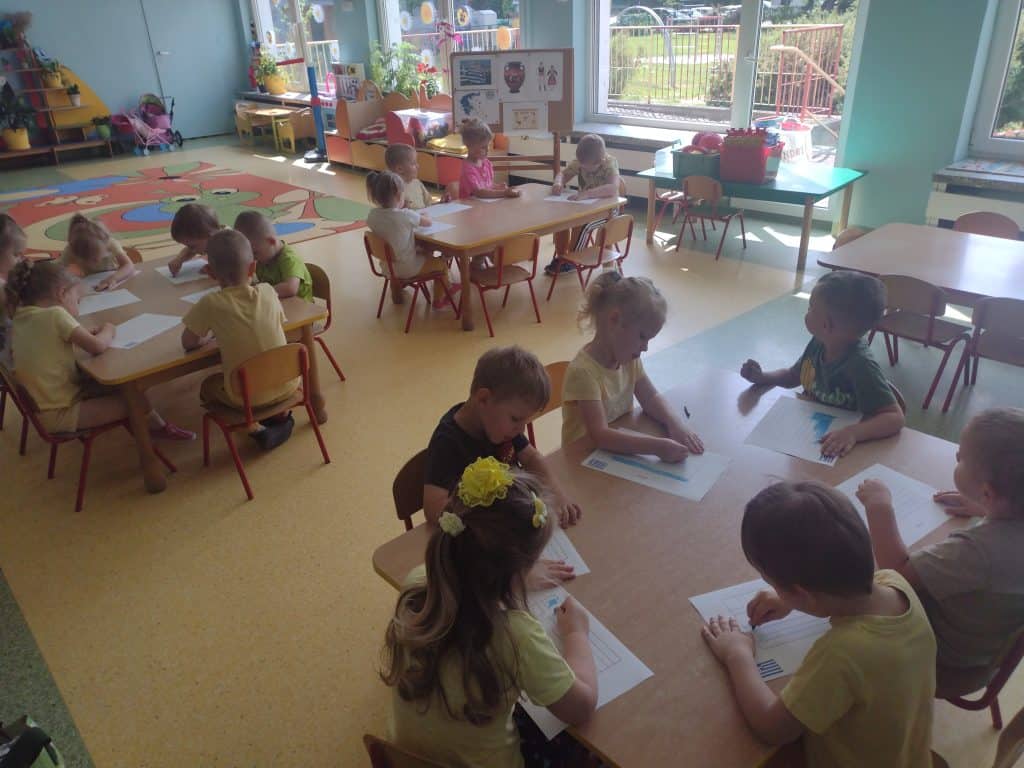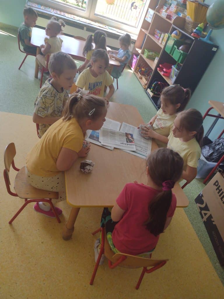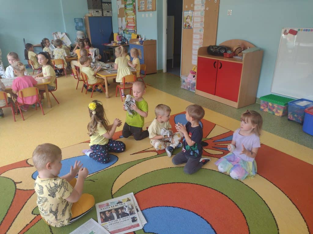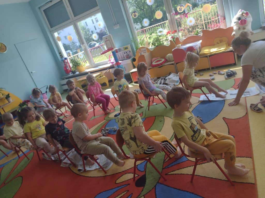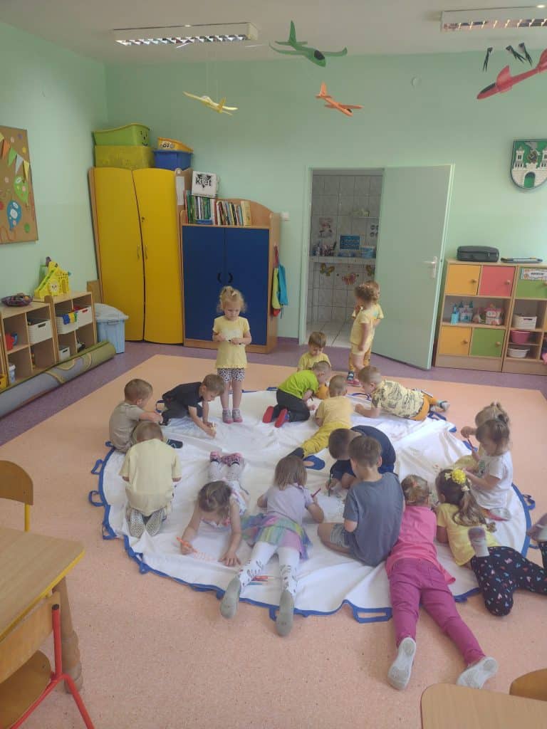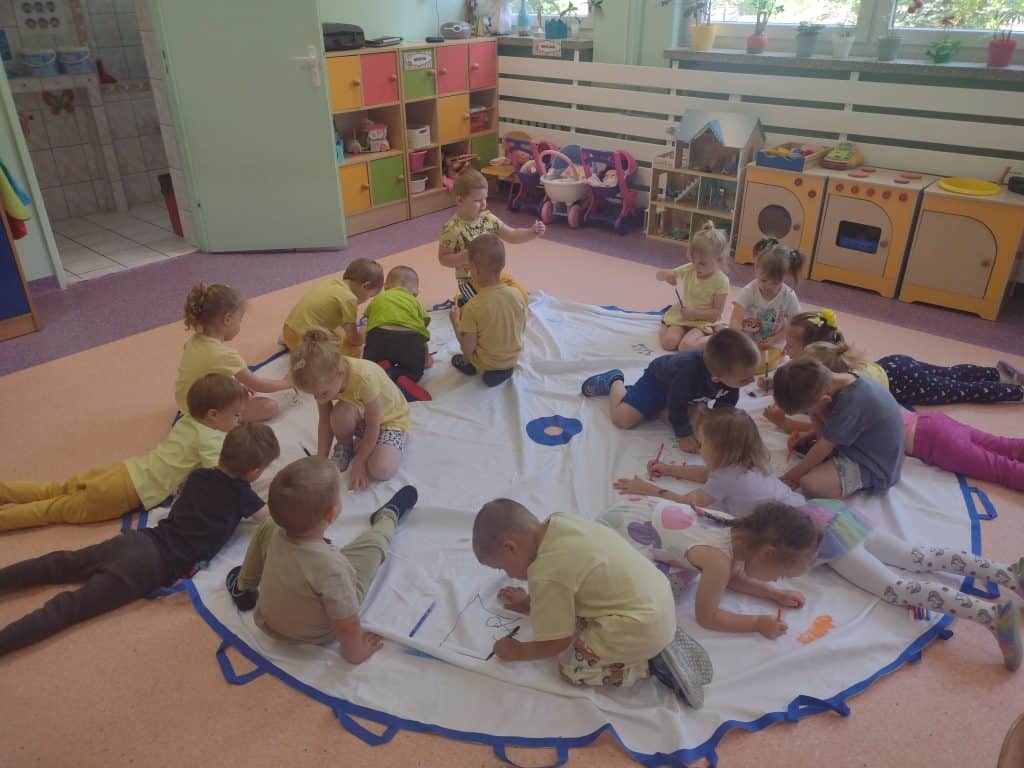 Pod koniec maja odbyły się zajęcia z cyklu „Kolorowa podróż” – tego dnia dzieci przyszły ubrane na żółto i uczestniczyły w różnorodnych aktywnościach związanych z tym kolorem. Zajęcia te były pełne kreatywności i zabawy, a jedną z ulubionych aktywności było kolorowanie dużej chusty oraz ćwiczenia z gazetami prowadzone przez panią Anię, nauczyciela bibliotekarza.
