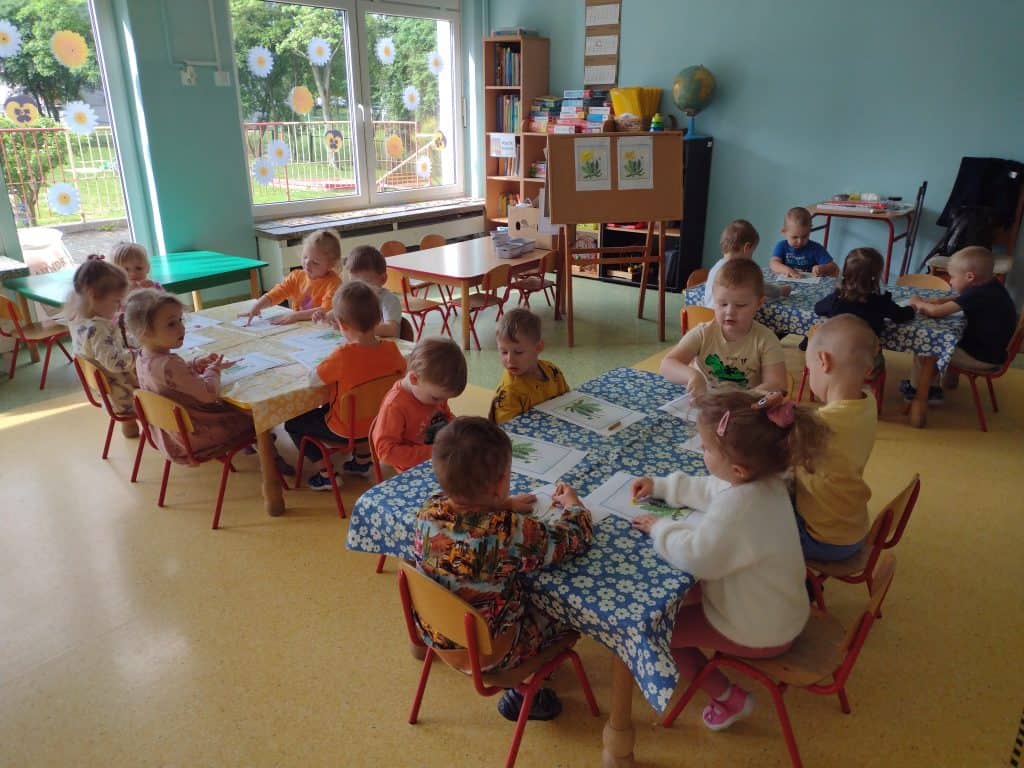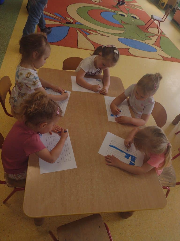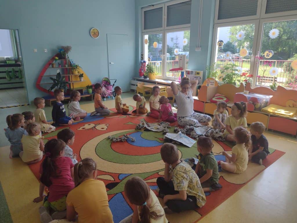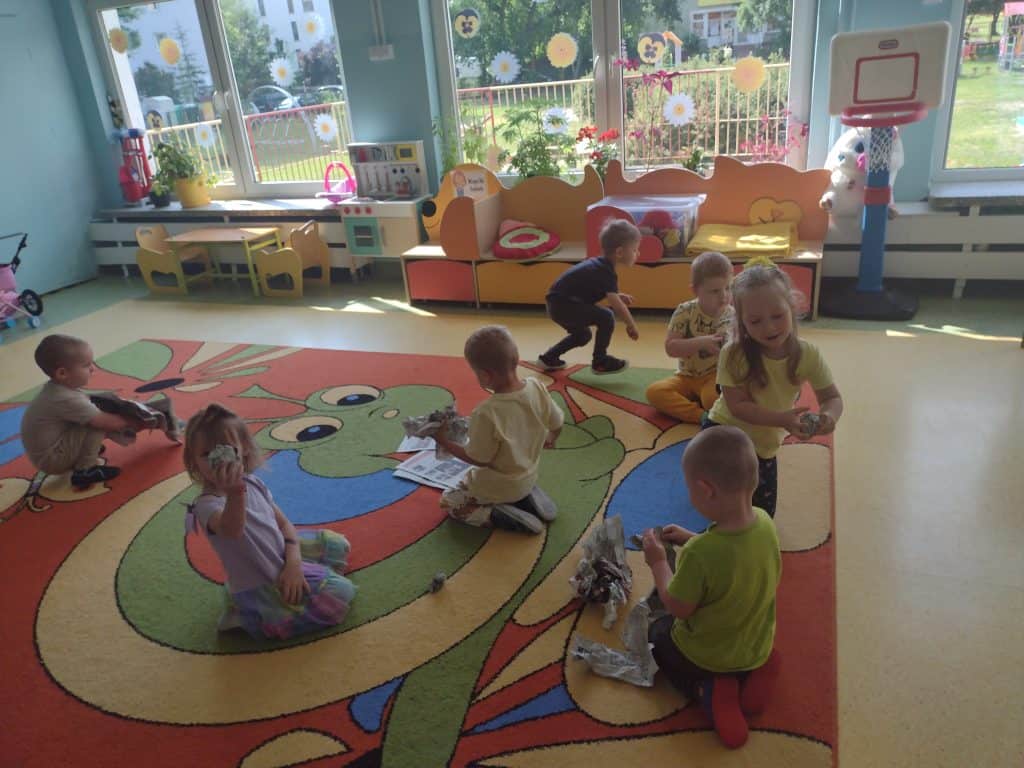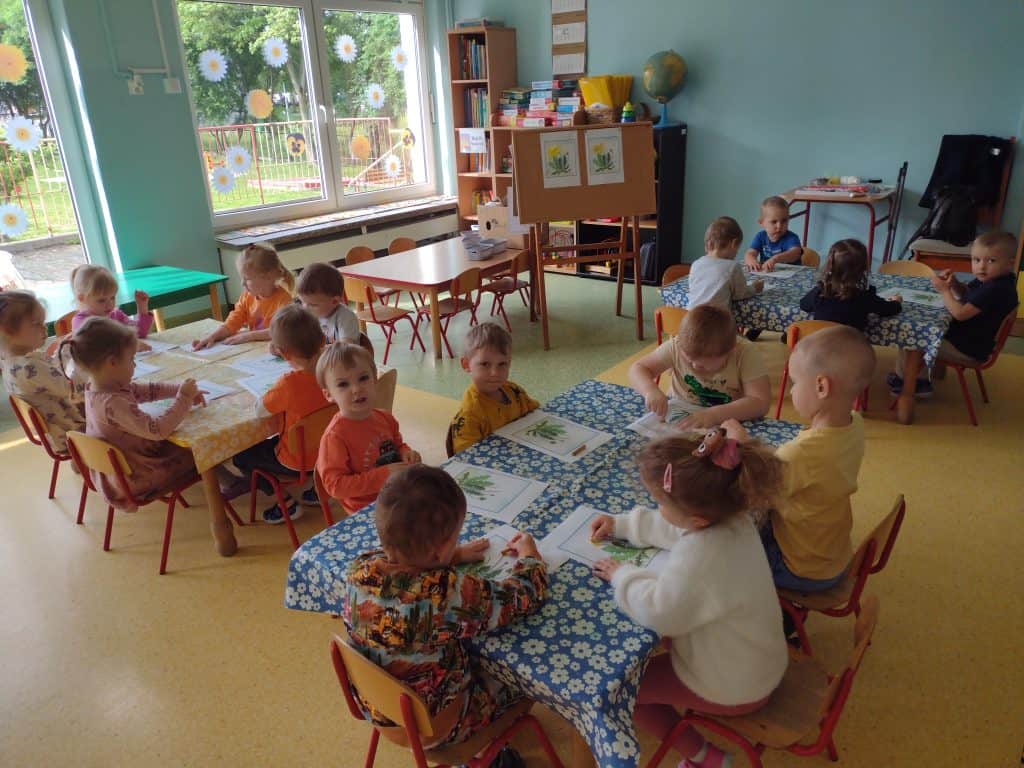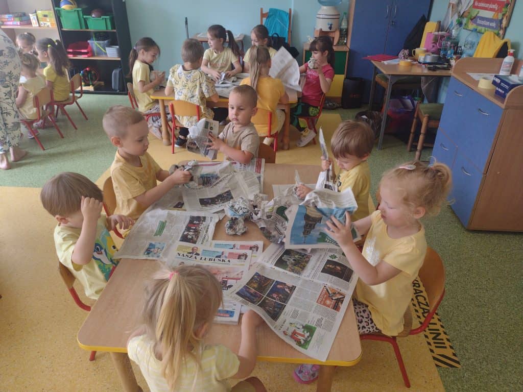 Pod koniec maja odbyły się zajęcia z cyklu „Kolorowa podróż” – tego dnia dzieci przyszły ubrane na żółto i uczestniczyły w różnorodnych aktywnościach związanych z tym kolorem. Zajęcia te były pełne kreatywności i zabawy, a jedną z ulubionych aktywności było kolorowanie dużej chusty oraz ćwiczenia z gazetami prowadzone przez panią Anię, nauczyciela bibliotekarza.