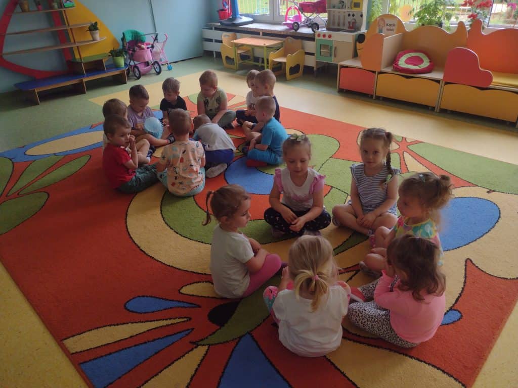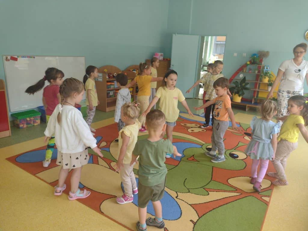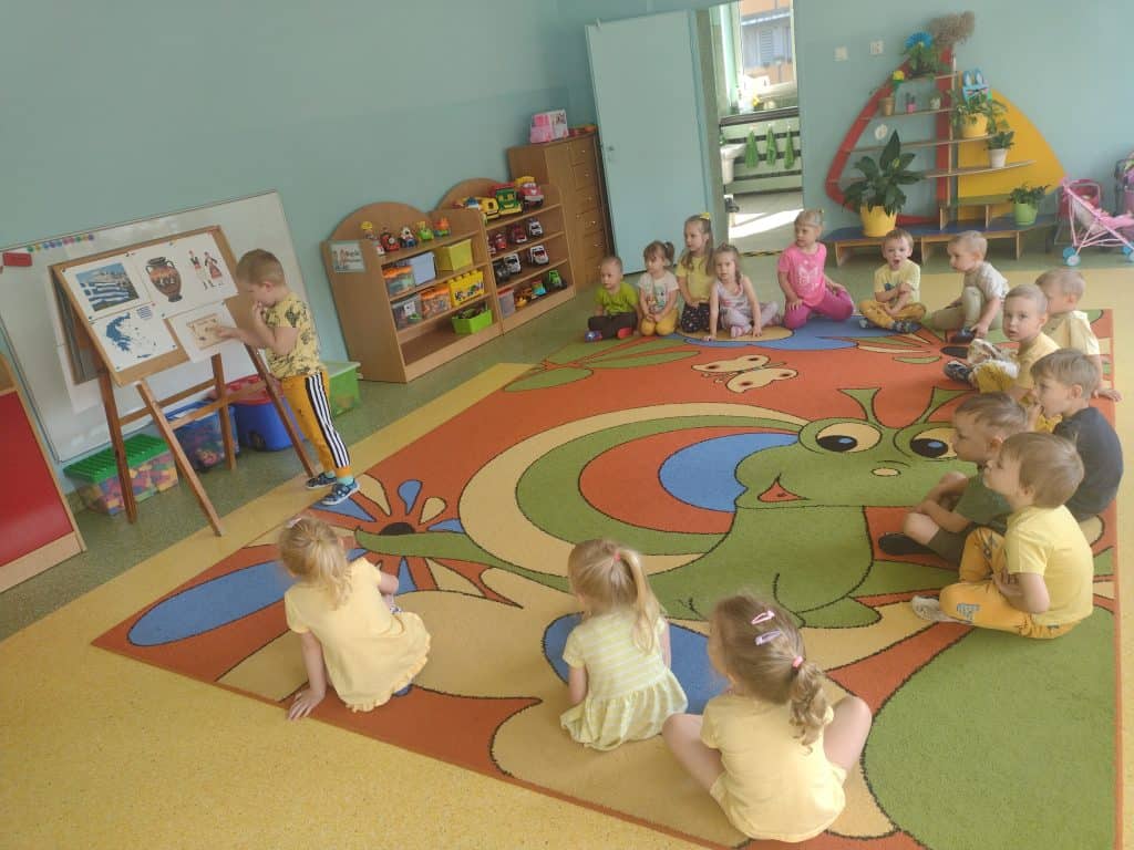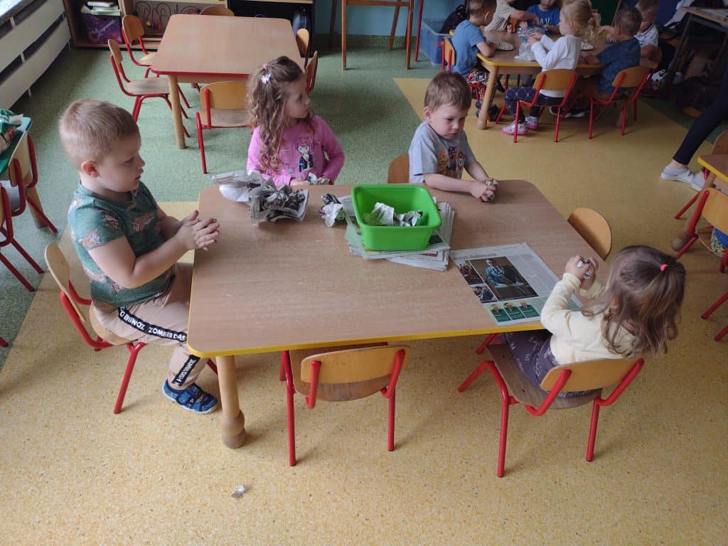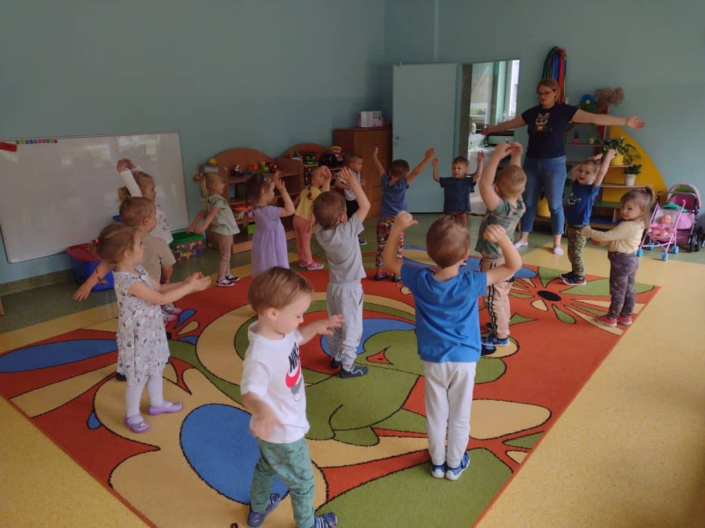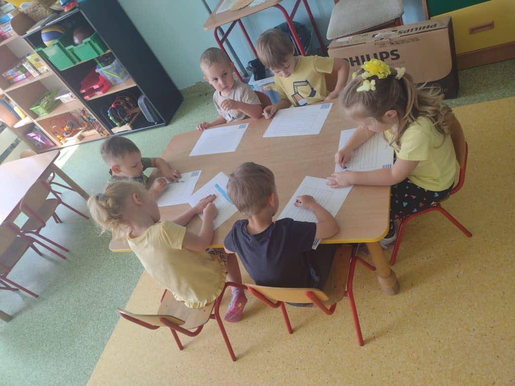 Pod koniec maja odbyły się zajęcia z cyklu „Kolorowa podróż” – tego dnia dzieci przyszły ubrane na żółto i uczestniczyły w różnorodnych aktywnościach związanych z tym kolorem. Zajęcia te były pełne kreatywności i zabawy, a jedną z ulubionych aktywności było kolorowanie dużej chusty oraz ćwiczenia z gazetami prowadzone przez panią Anię, nauczyciela bibliotekarza.
