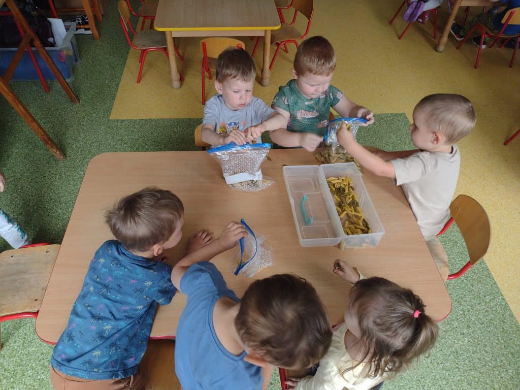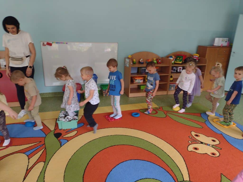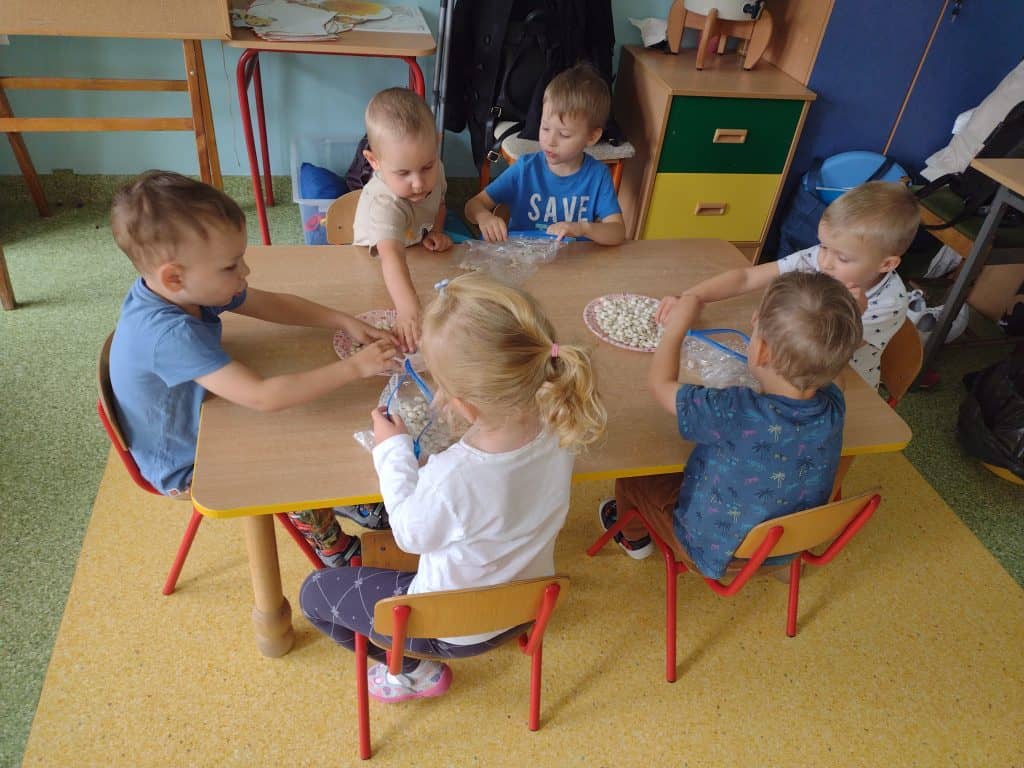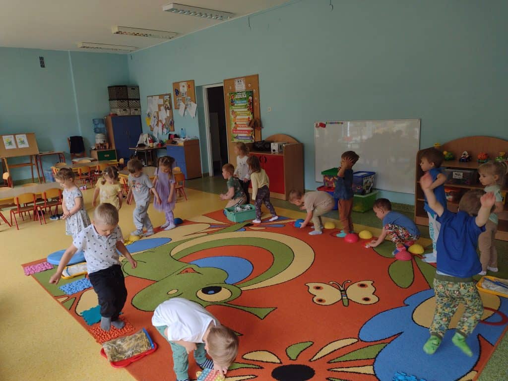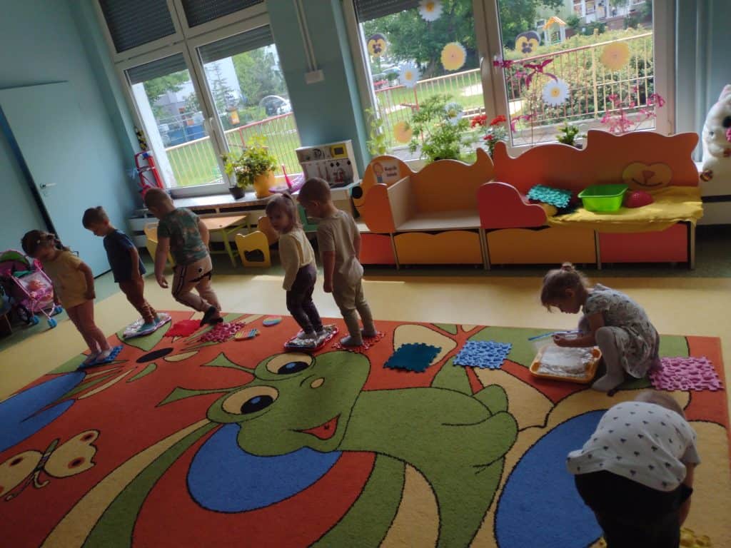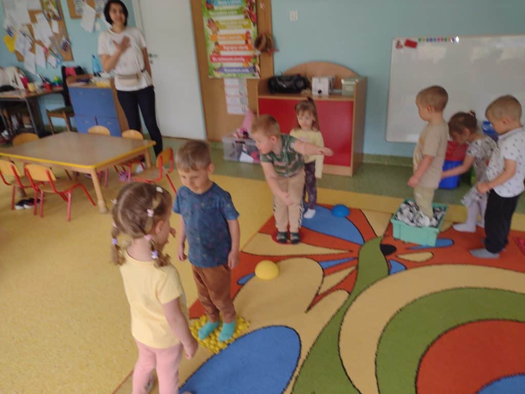 10 maja odbyły się zajęcia poprowadzone przez panią Anię, nauczyciela bibliotekarza. Po wstępnej rozgrzewce na dywanie, dzieci z entuzjazmem przystąpiły przy stolikach do napełniania woreczków fasolą lub makaronem. Potem ugniatały kulki z papieru, rozwijając przy tym sprawność manualną. Kolejnym punktem zajęć była ścieżka sensoryczna, po której dzieci chodziły, ćwicząc swoje stopy. Różnorodne faktury, po których stąpały, dostarczyły im niecodziennych wrażeń i pozwoliły na rozwijanie percepcji dotykowej.