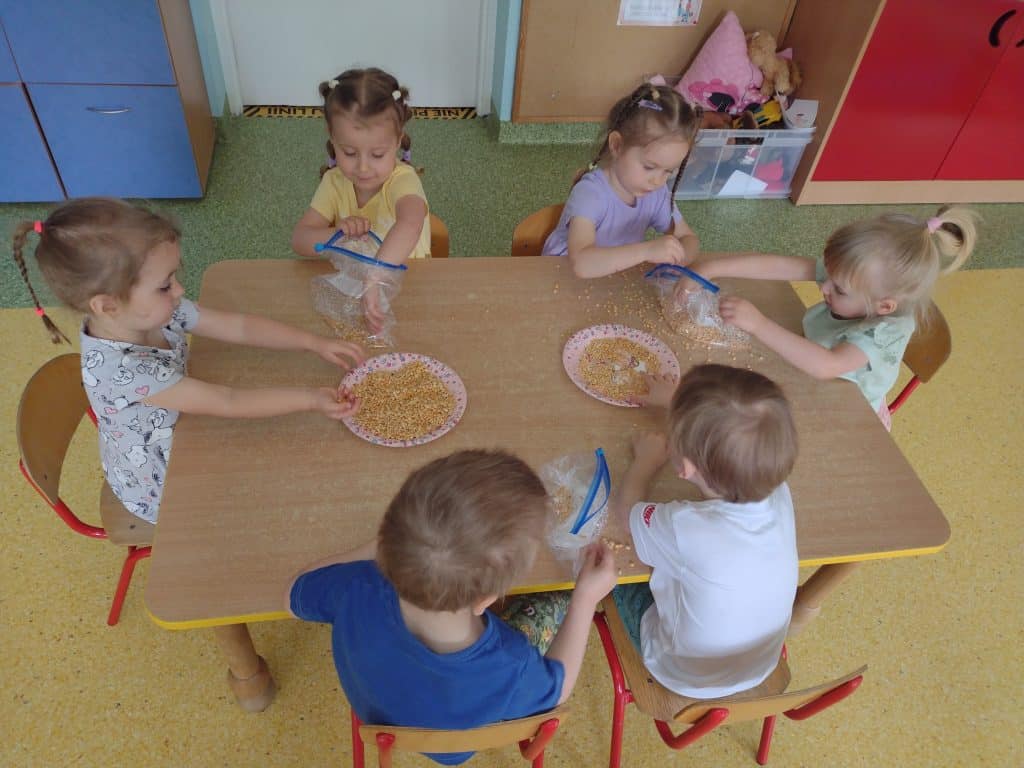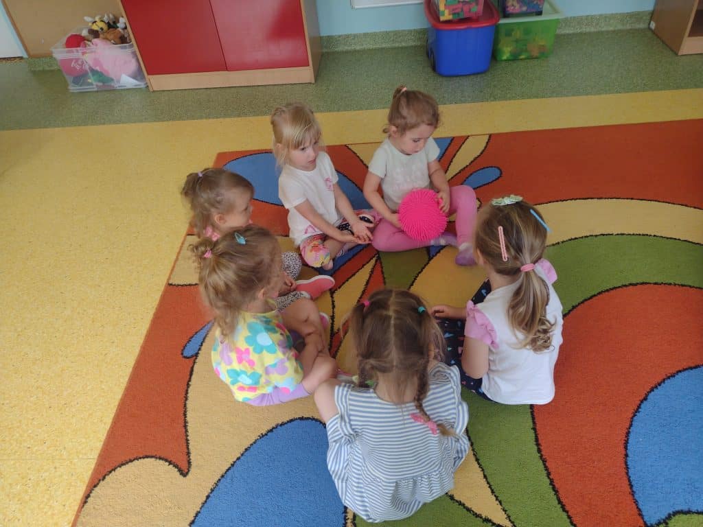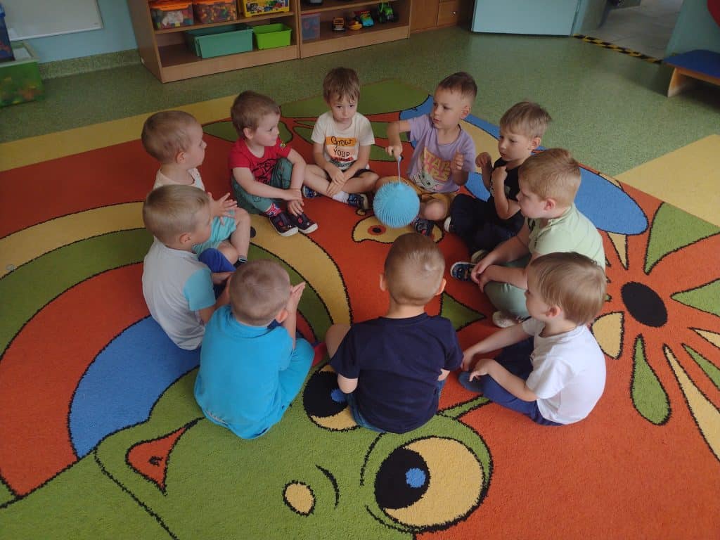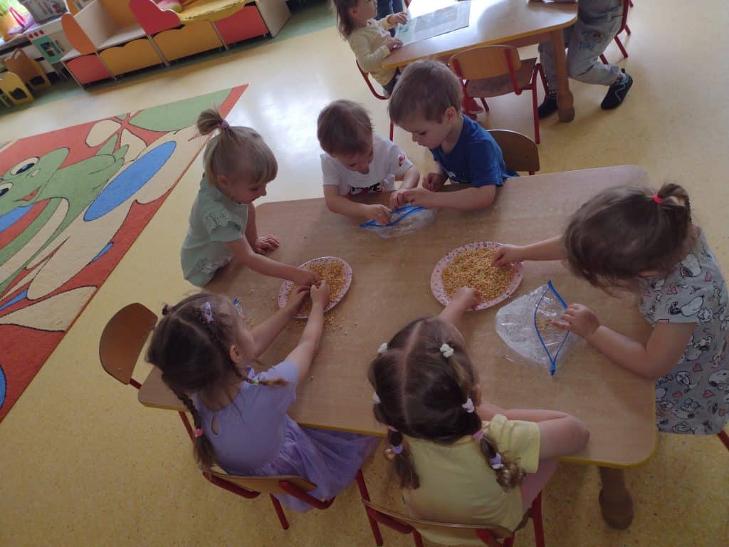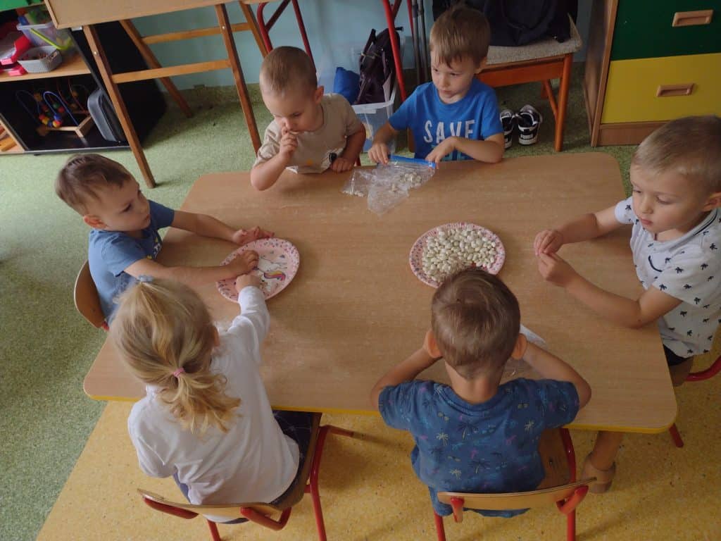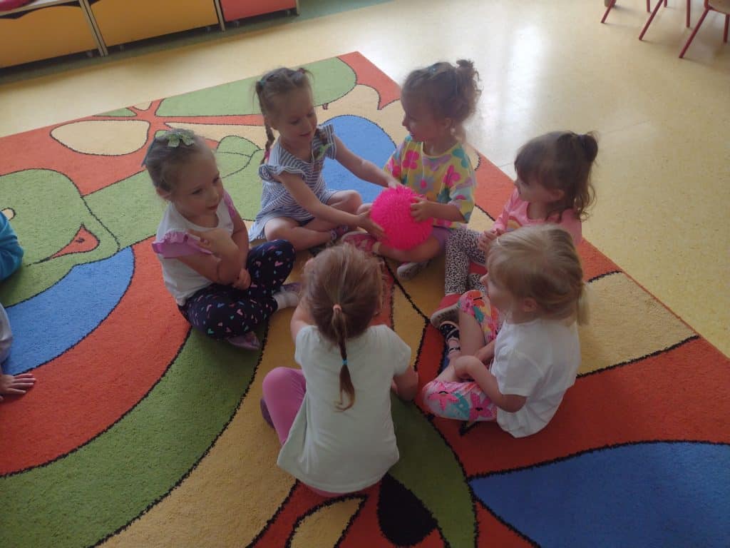 10 maja odbyły się zajęcia poprowadzone przez panią Anię, nauczyciela bibliotekarza. Po wstępnej rozgrzewce na dywanie, dzieci z entuzjazmem przystąpiły przy stolikach do napełniania woreczków fasolą lub makaronem. Potem ugniatały kulki z papieru, rozwijając przy tym sprawność manualną. Kolejnym punktem zajęć była ścieżka sensoryczna, po której dzieci chodziły, ćwicząc swoje stopy. Różnorodne faktury, po których stąpały, dostarczyły im niecodziennych wrażeń i pozwoliły na rozwijanie percepcji dotykowej.
