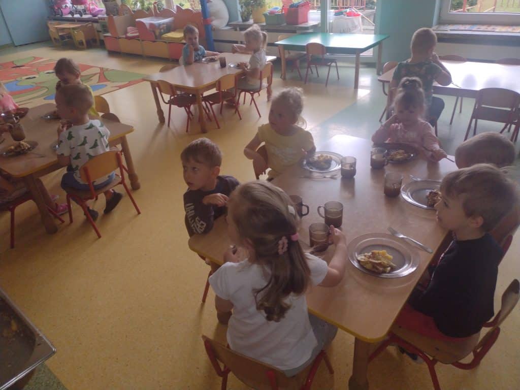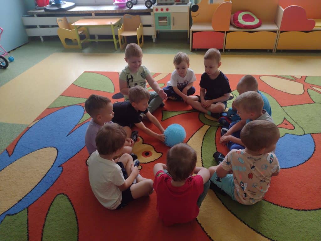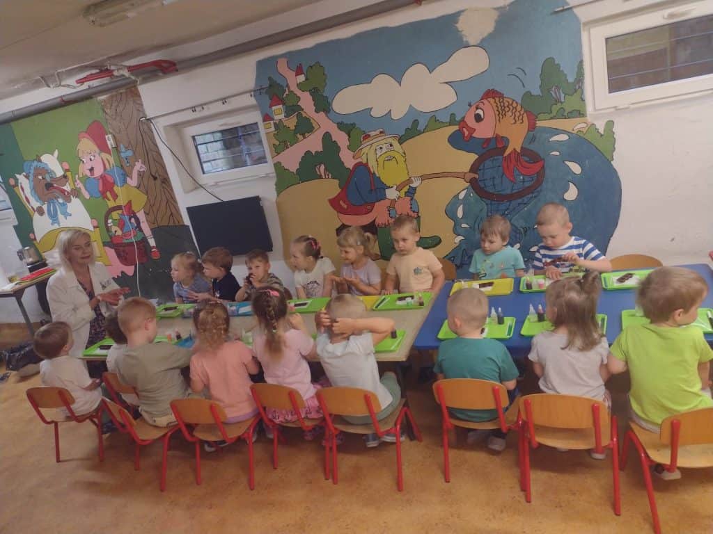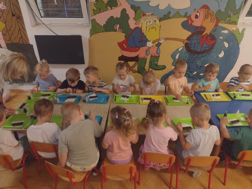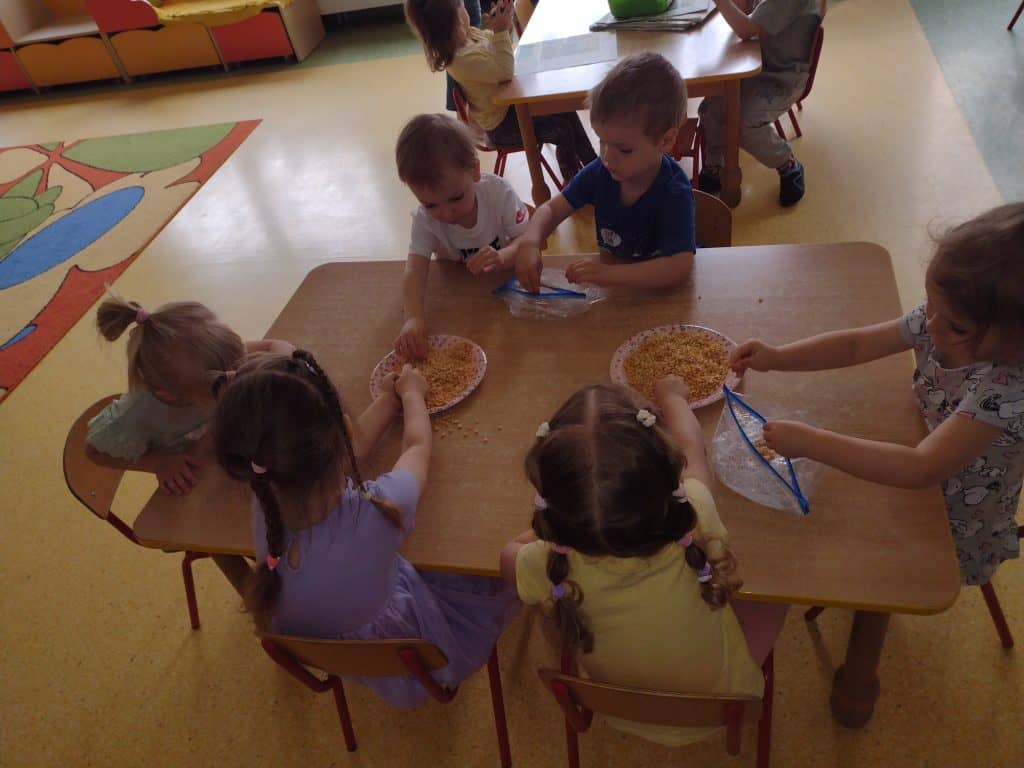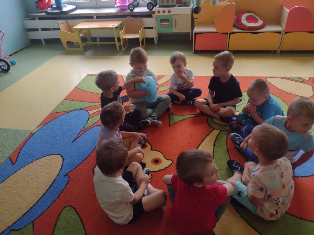 10 maja odbyły się zajęcia poprowadzone przez panią Anię, nauczyciela bibliotekarza. Po wstępnej rozgrzewce na dywanie, dzieci z entuzjazmem przystąpiły przy stolikach do napełniania woreczków fasolą lub makaronem. Potem ugniatały kulki z papieru, rozwijając przy tym sprawność manualną. Kolejnym punktem zajęć była ścieżka sensoryczna, po której dzieci chodziły, ćwicząc swoje stopy. Różnorodne faktury, po których stąpały, dostarczyły im niecodziennych wrażeń i pozwoliły na rozwijanie percepcji dotykowej.