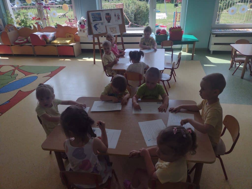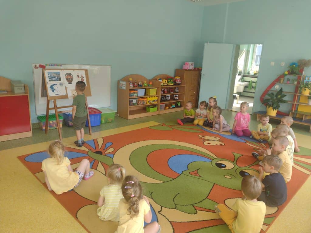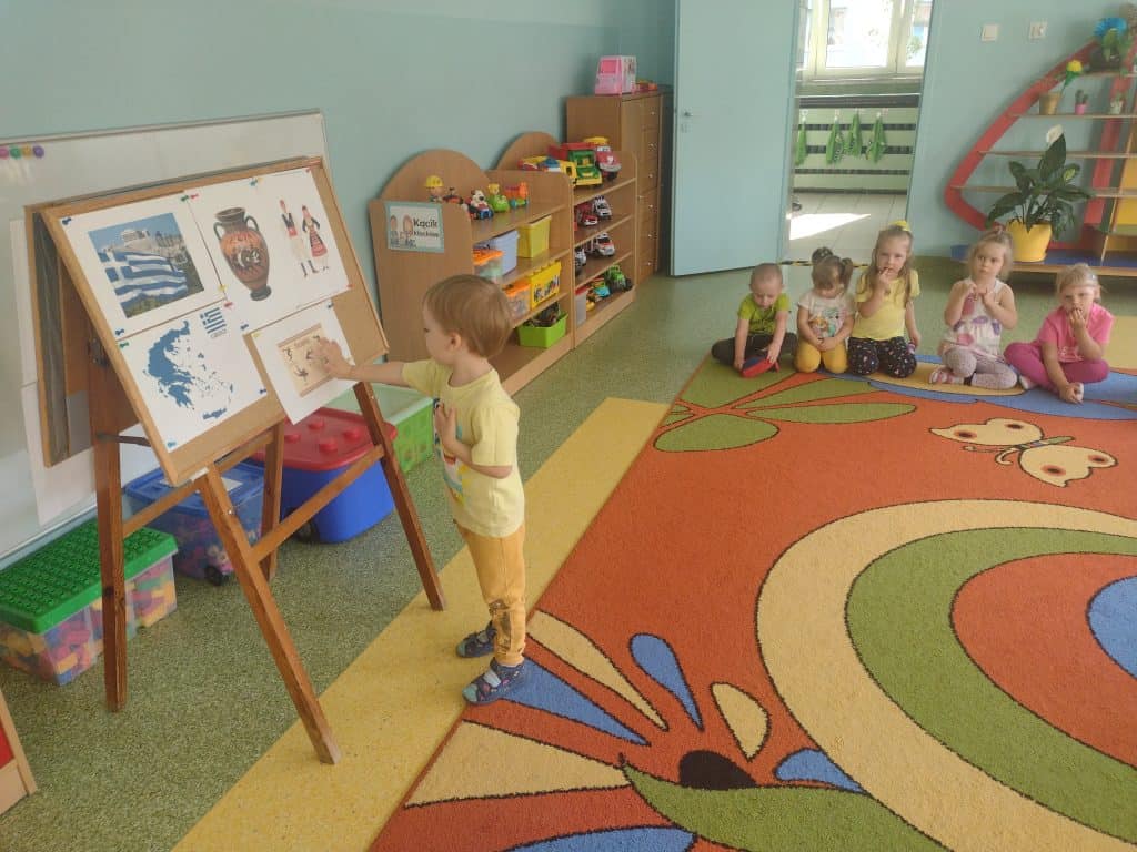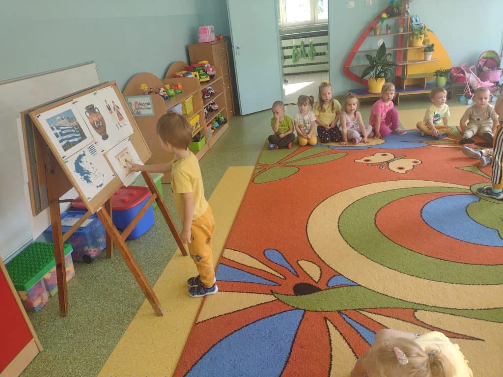 23 maja odbyły się zajęcia poświęcone Grecji, które pozwoliły poznać bogatą kulturę tego kraju. Dzieci dowiedziały się że flaga składa się z niebieskich i białych pasów oraz ma symboliczny krzyż. Następnie miały okazję pokolorować obrazki przedstawiające flagę, co pomogło im lepiej zapamiętać jej wygląd i barwy. Dzieci dowiedziały się również jak wyglądały starożytne naczynia, jakie miały kształty i jakie sceny były na nich przedstawiane. Poznały pięć dyscyplin sportowych, które wchodziły w skład starożytnych igrzysk olimpijskich: bieg, skok w dal, rzut dyskiem, rzut oszczepem i zapasy.