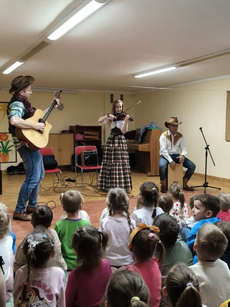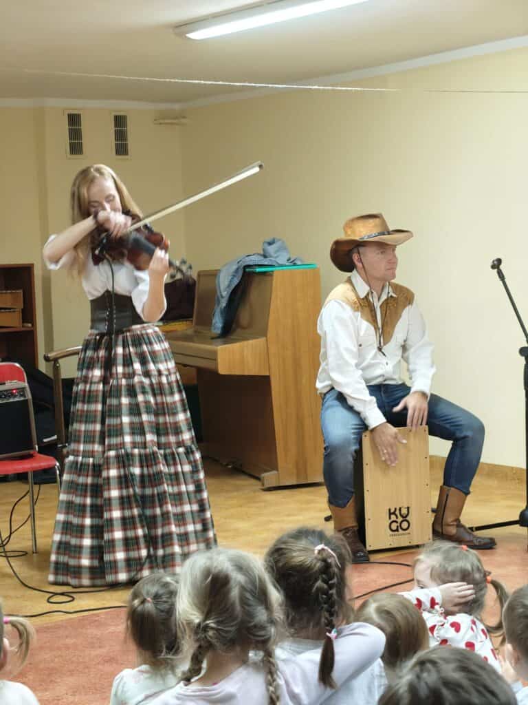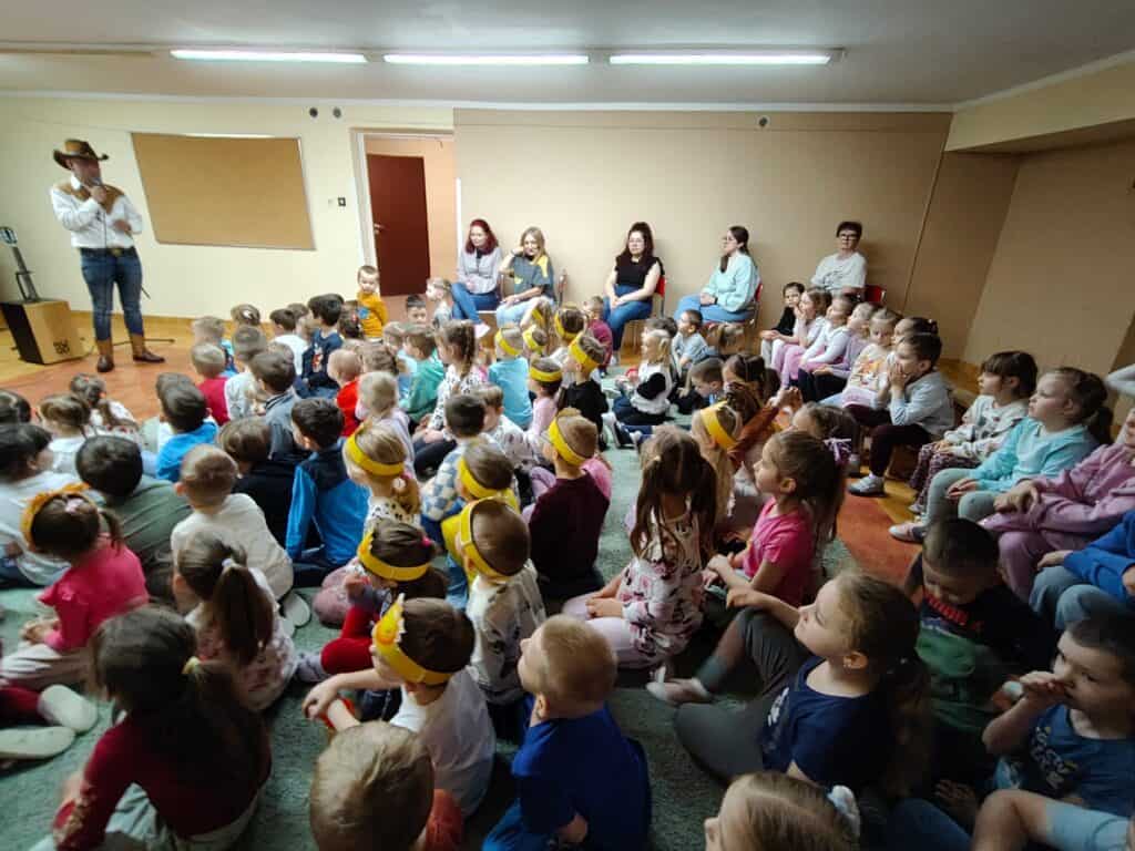 Jak co miesiąc, nasze przedszkole odwiedziło Lubuskie Biuro Koncertowe, które tym razem zaprosiło dzieci w niezwykłą muzyczną podróż na Dziki Zachód. W spotkaniu wzięło udział troje artystów – dwóch panów oraz jedna pani – którzy w ciekawy i angażujący sposób połączyli opowieść, muzykę oraz aktywny udział dzieci.