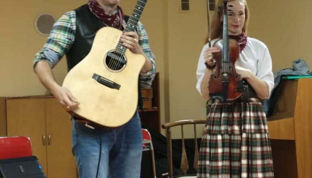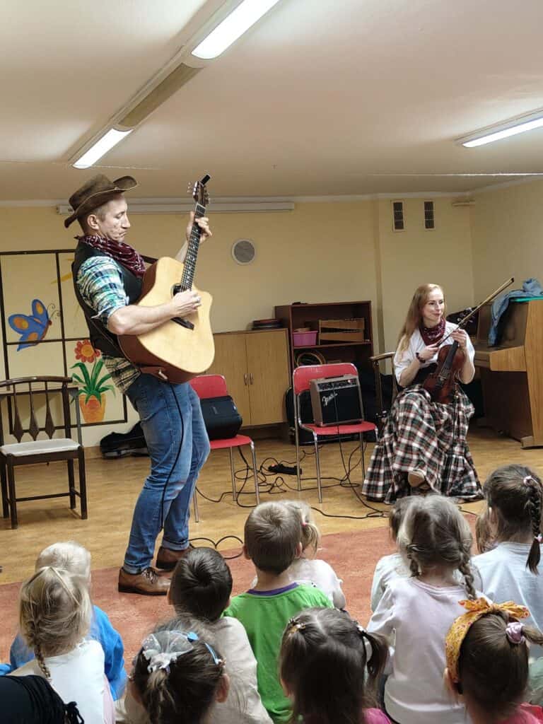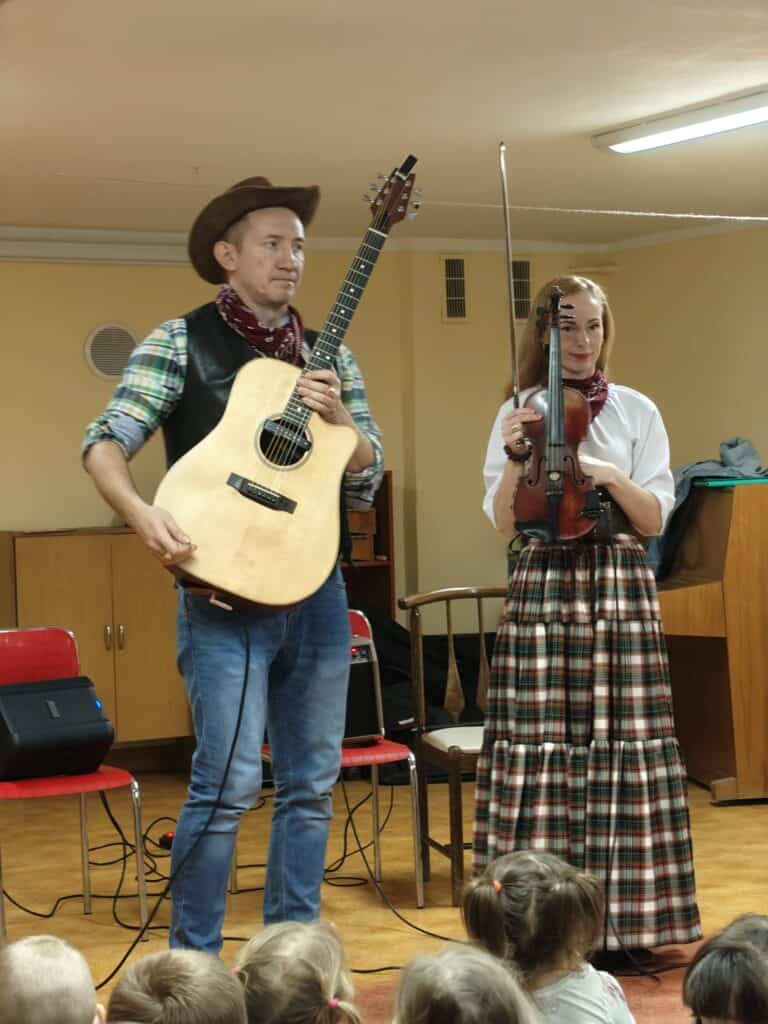 Głównym bohaterem opowieści był kowboj Johnny – najdzielniejszy kowboj na Dzikim Zachodzie. Dzieci z zainteresowaniem słuchały historii o jego przygodach – jeździe konnej, opiece nad zwierzętami oraz niezwykłych umiejętnościach muzycznych. Johnny nie tylko doskonale władał bronią i opiekował się stadem, ale także grał na gitarze akustycznej. Podczas tej części spotkania dzieci poznały budowę gitary – korpus, szyjkę oraz struny, które wspólnie liczyły, a także dowiedziały się, w jaki sposób wydobywa się z niej dźwięki poprzez szarpanie strun. Następnie uczestnicy „odwiedzili” ranczo, gdzie kowboj pracował, opiekując się zwierzętami. Artyści wprowadzili dzieci w temat życia na farmie, opowiadając o krowach pasących się na rozległych pastwiskach. W dalszej części poznaliśmy gospodynię Elizę, która uwielbiała muzykę i grała na skrzypcach. Dzieci miały okazję porównać wielkość skrzypiec z gitarą, dowiedzieć się, jak prawidłowo trzyma się instrument oraz w jaki sposób wydobywa się z niego dźwięk za pomocą smyczka. Artyści opowiedzieli również, z czego wykonany jest smyczek, wzbudzając duże zainteresowanie wśród dzieci.