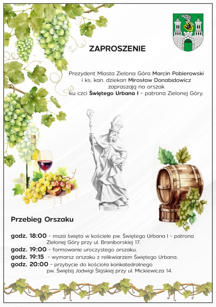 Prezydent Miasta Zielona Góra zaprasza 7.09.2024 r. wszystkich zainteresowanych i chętnych mieszkańców na Orszak ku czci Świętego Urbana – patrona naszego miasta. Szczegóły na plakacie.
